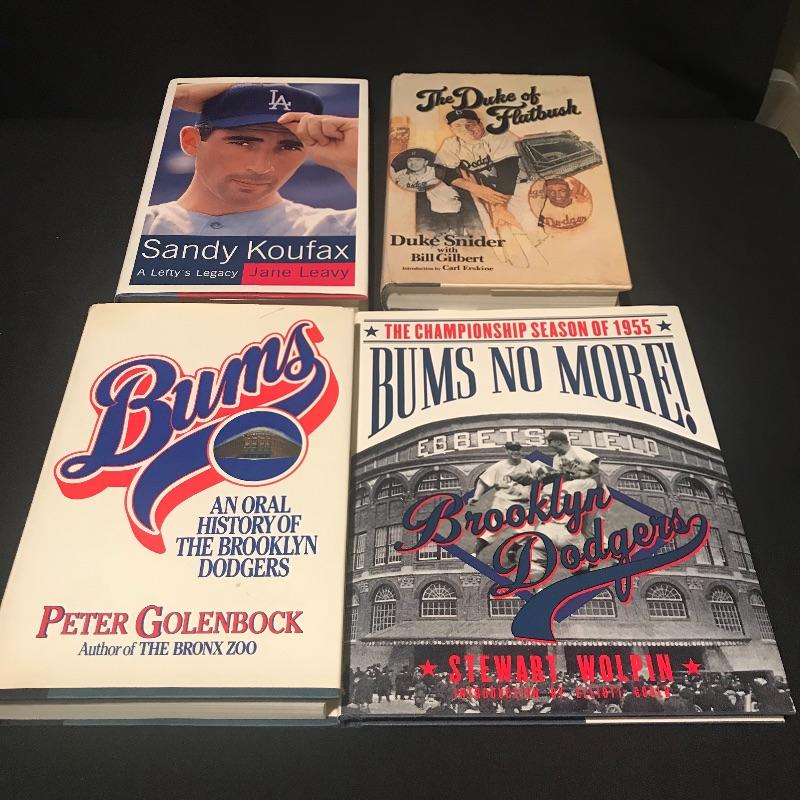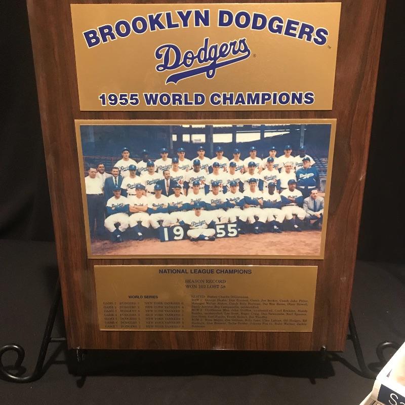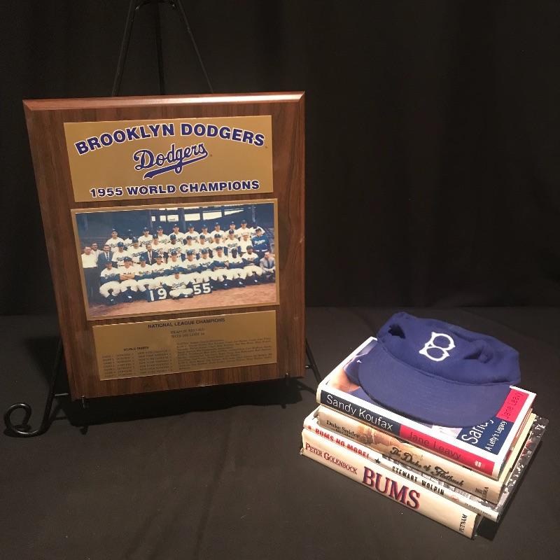 This lot includes a plaque with photo of the 1955 Brooklyn Dodgers Champions with some stats on bottom. Also includes four books about the Dodgers and a cap. Plaque measures 13” x 16”. Shipping available.