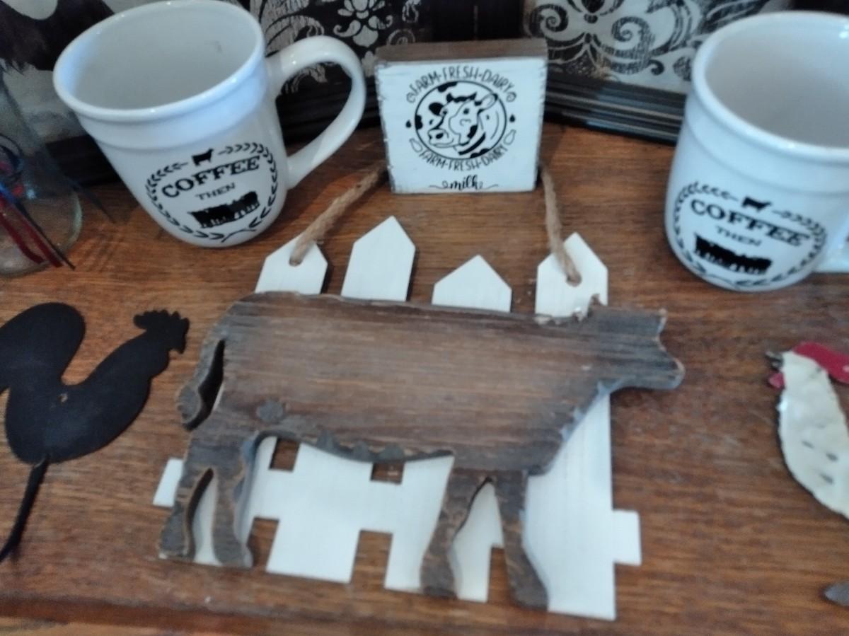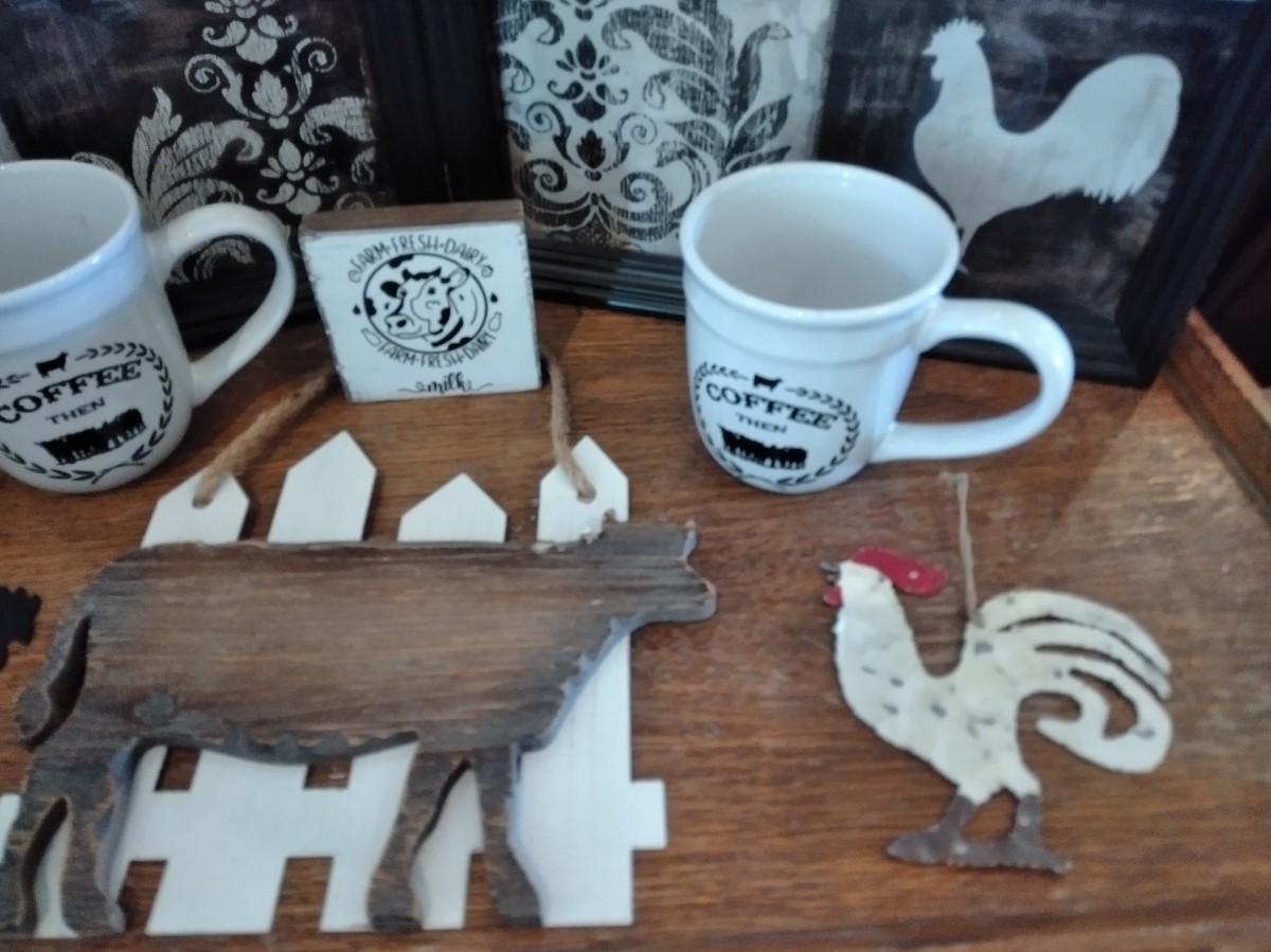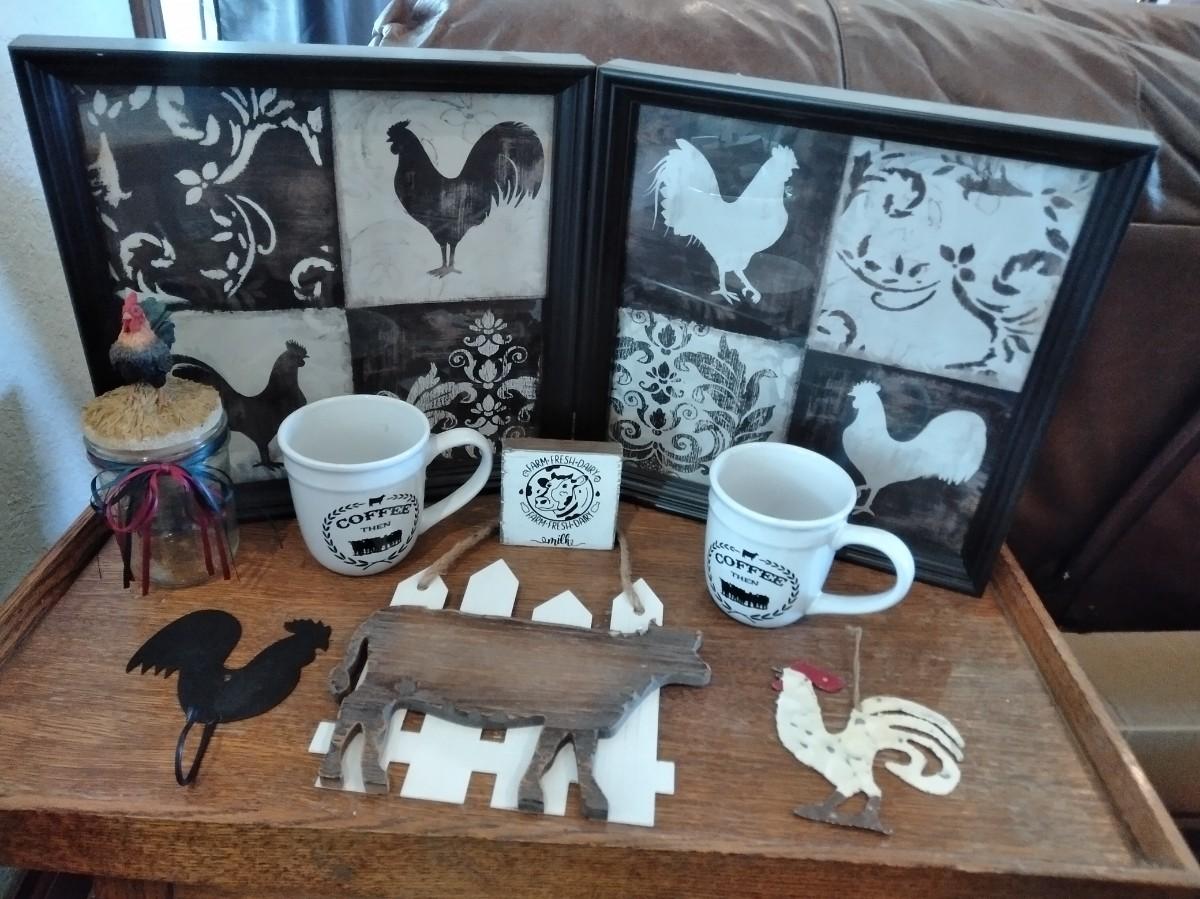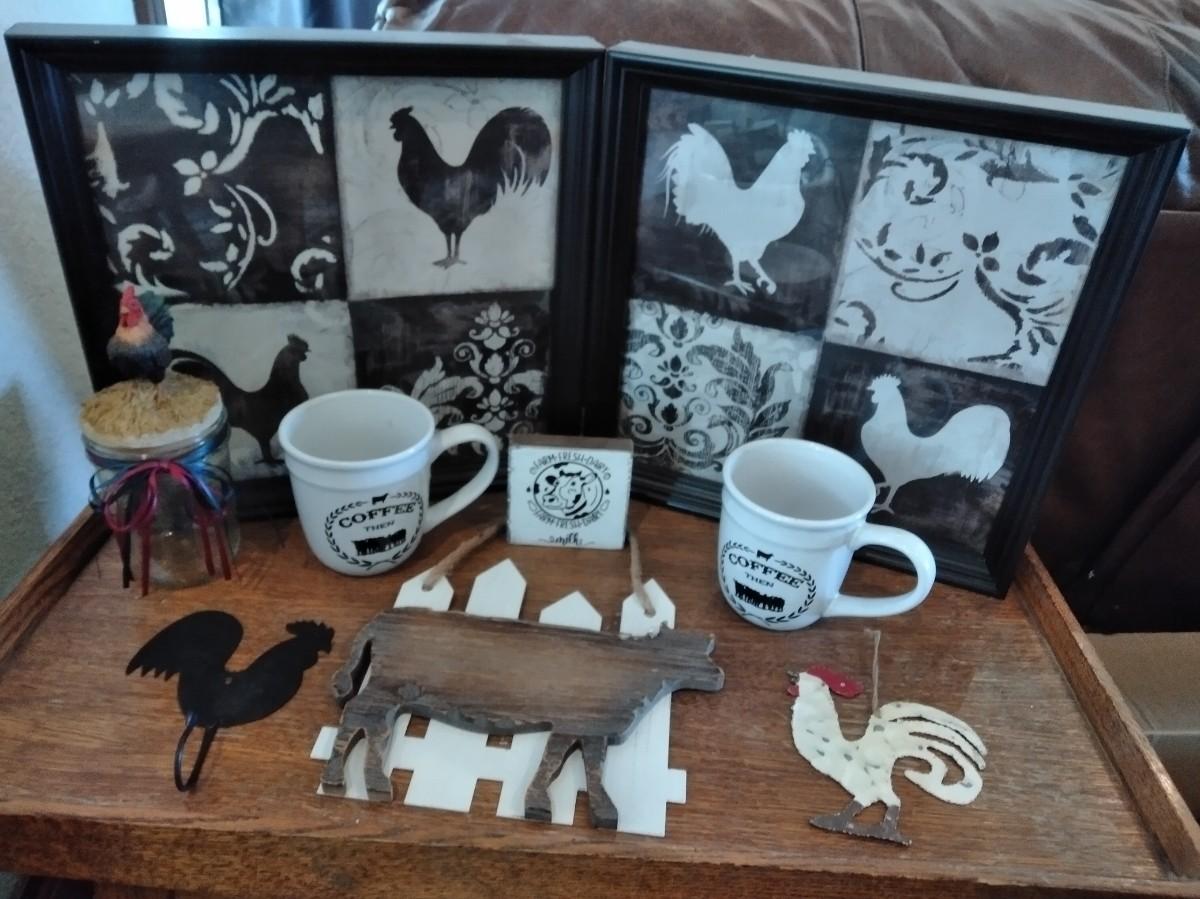 TWO ROOSTER WALL ART PICTURES, TWO COFFEE MUGS WITH COWS, A WOODEN COW WITH FENCE, METAL ROOSTERS, AND A JAR WITH A ROOSTER LID.