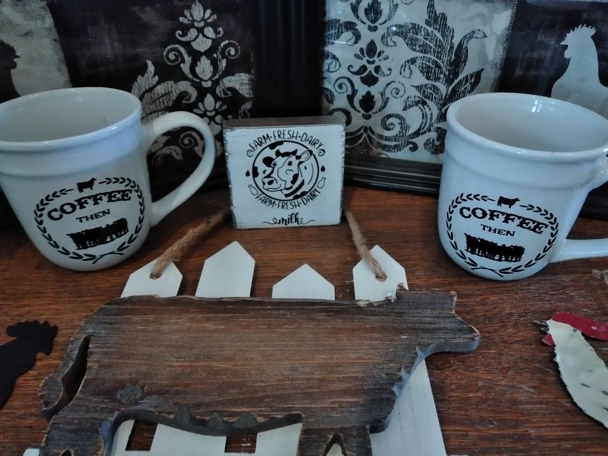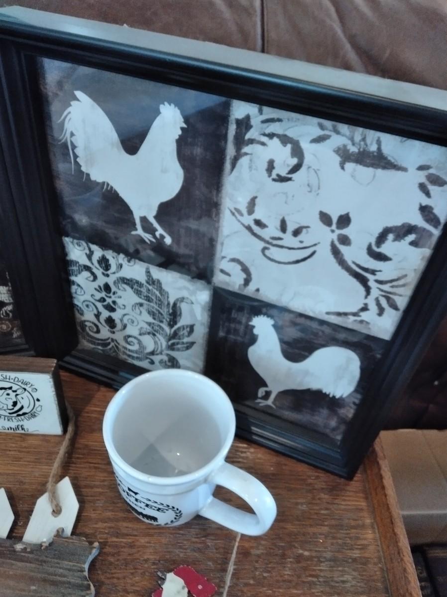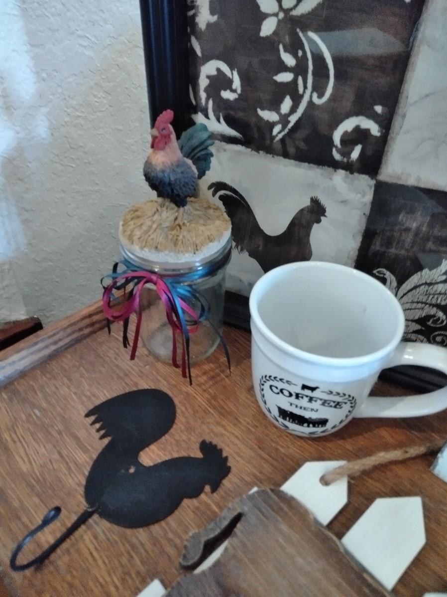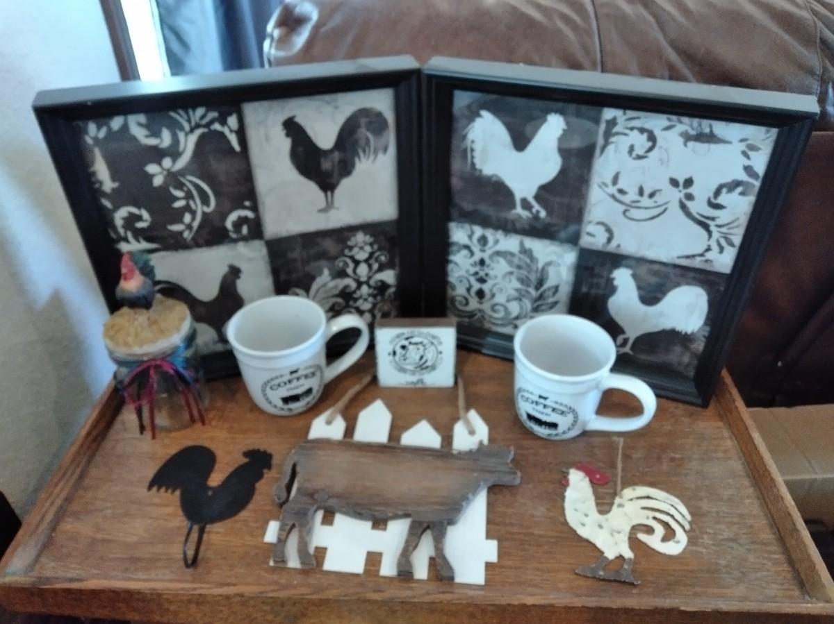 TWO ROOSTER WALL ART PICTURES, TWO COFFEE MUGS WITH COWS, A WOODEN COW WITH FENCE, METAL ROOSTERS, AND A JAR WITH A ROOSTER LID.