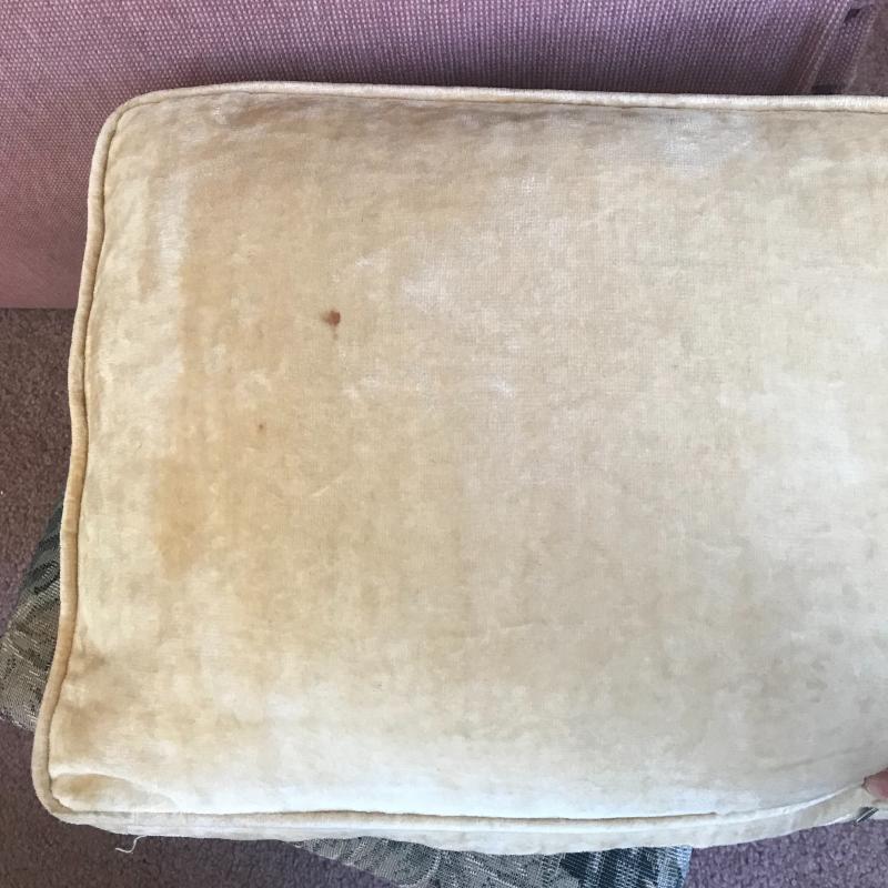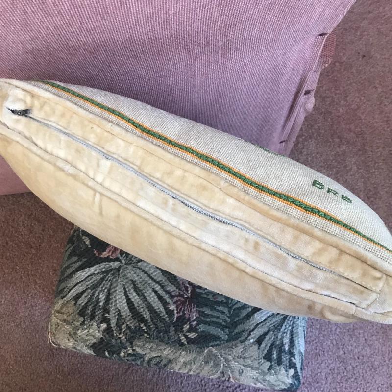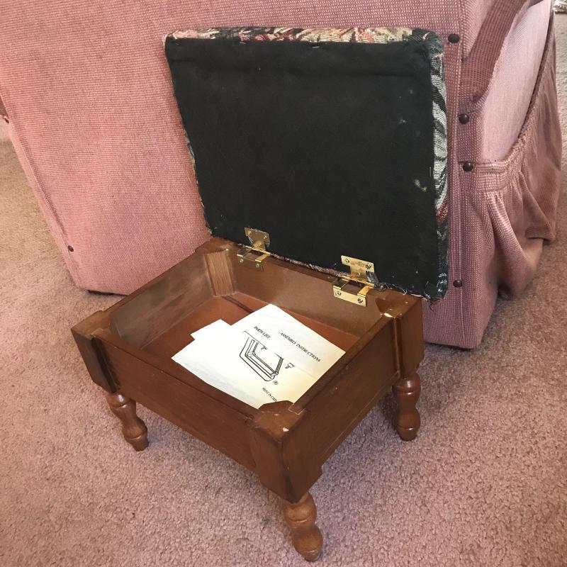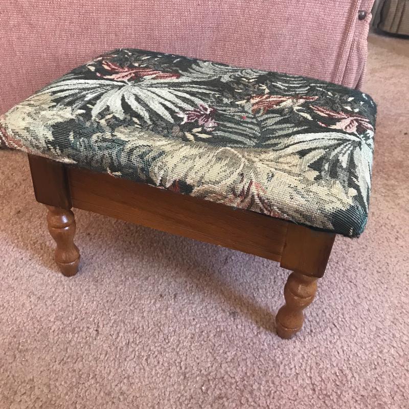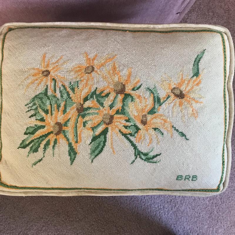 Black eyed Susan floral cross stitched pillow with zipper cover. On small stain on back. Pillow measures 16” x 12” x 1”. Foot stool has a storage area (see pix). Stool measures 15” x 11” x 9”. Lot is available for local pick up in Asheville, NC only.