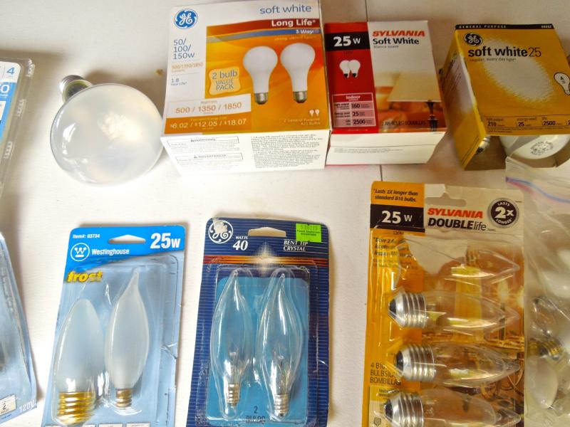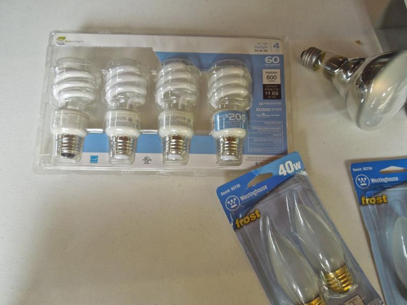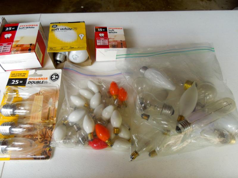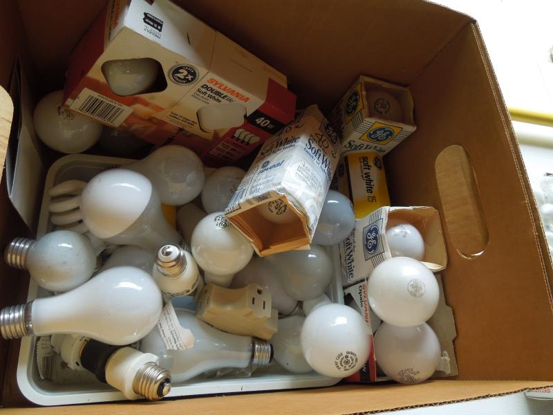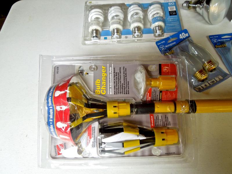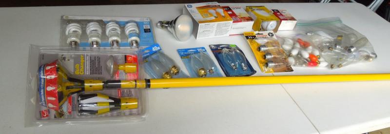 Boxed lot of a variety of functioning light bulbs. Includes new bulb changer with adjustable pole in packaging.