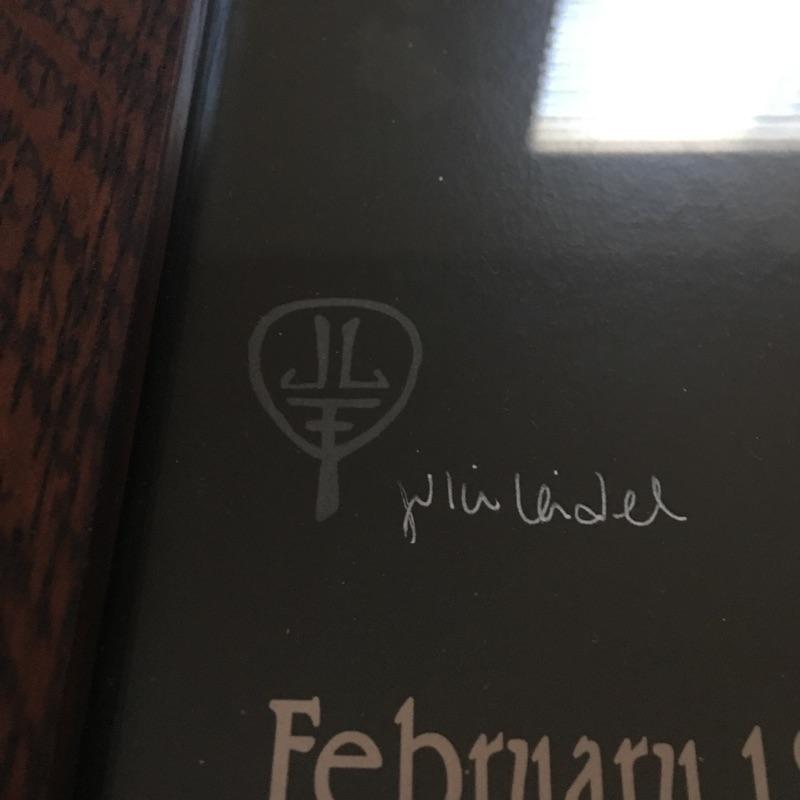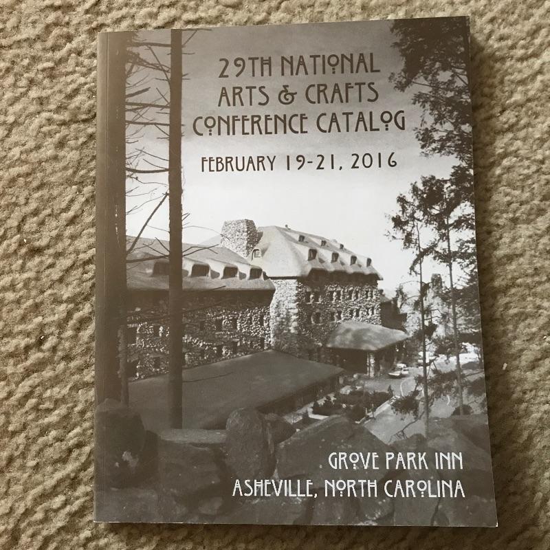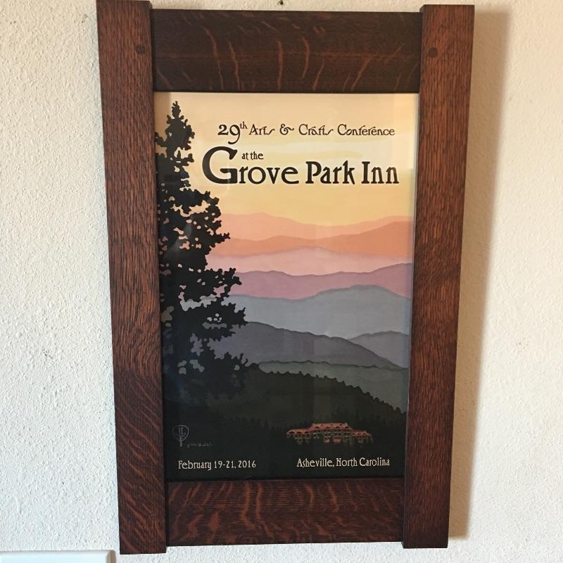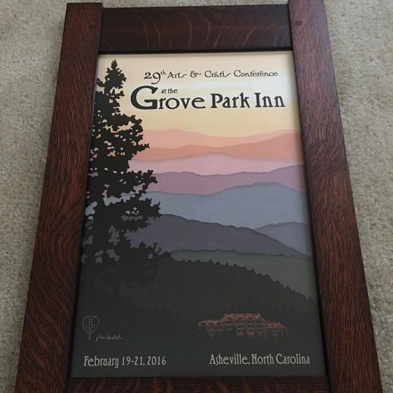 Julie Leidel signed artwork with handcrafted frame by Family Woodworks from The Grove Park Inn twenty ninth annual Arts & Crafts conference in 2016. Lot also includes a catalog from the conference.