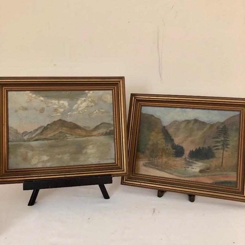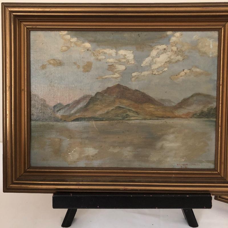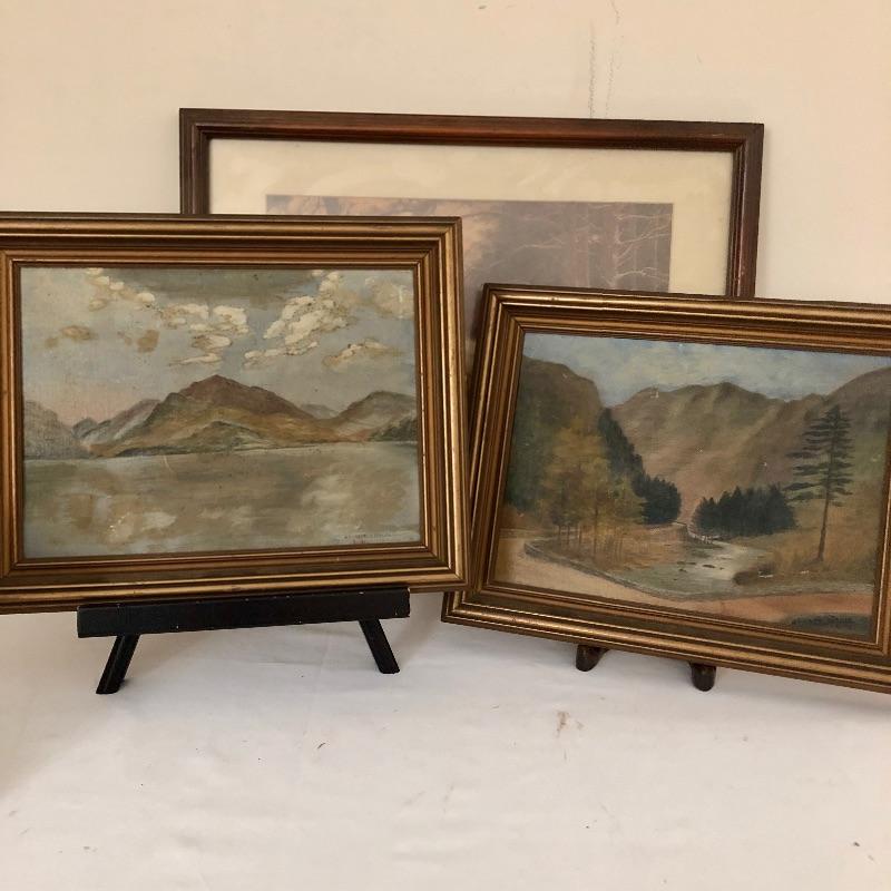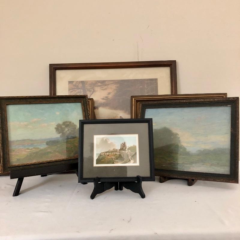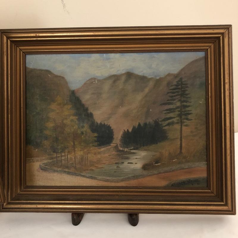 A total of 6 pieces of art here that includes two of what appear to be acrylic paintings with the signature H. Kimberley Jones; titled NC Mountain Stream and NC Mountain lake. Please note these two paintings are not protected by glass and they did come from a smokers home. Also included are four more framed landscape scenes.