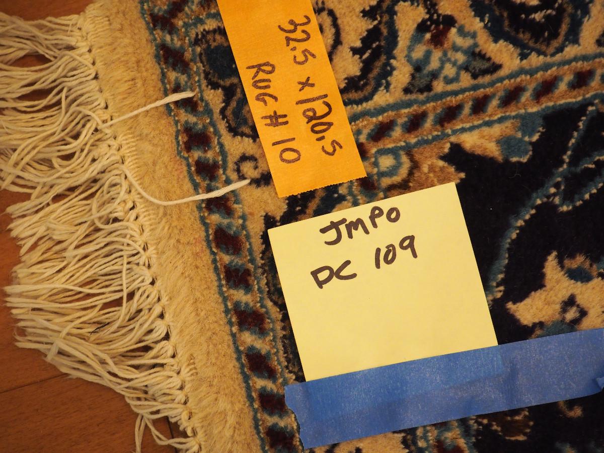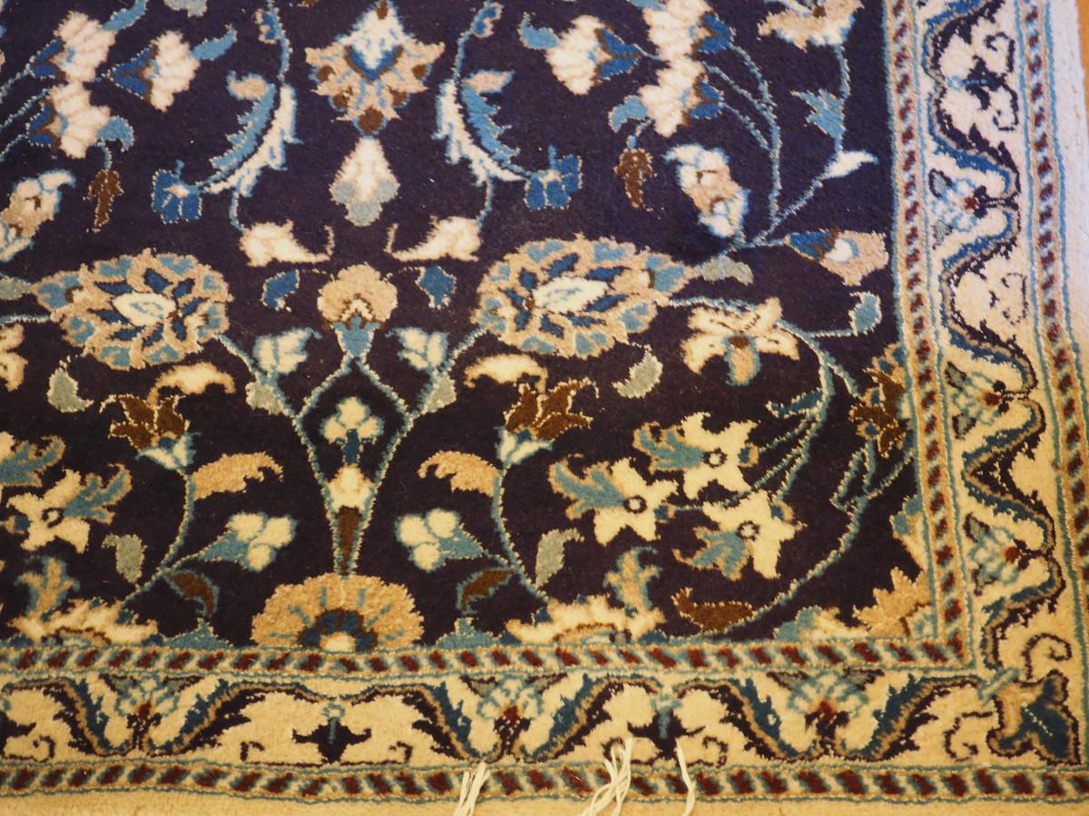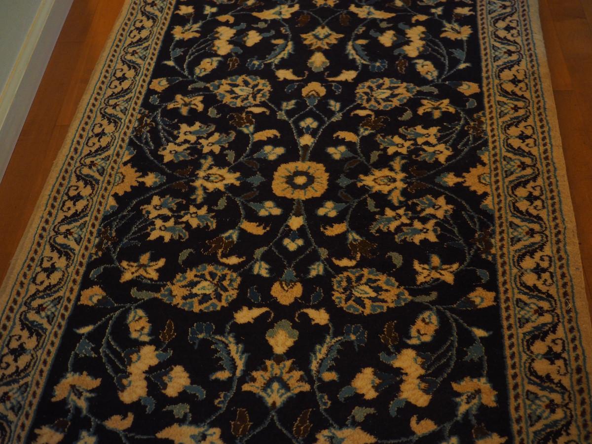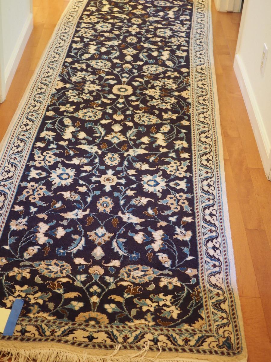 31 X 118 Rug is clean and no rips, stains or other flaws noted. Dark blue pattern