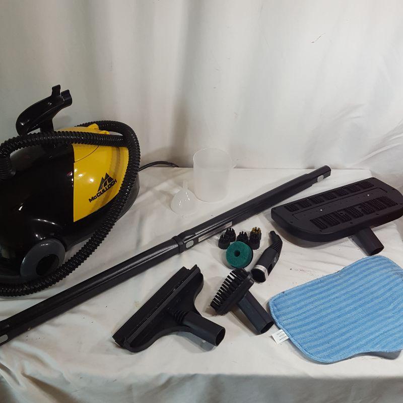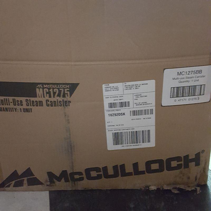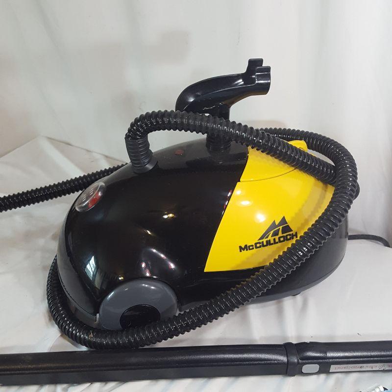 New in the box McCulloch Steam Cleaner. Oh just think of the possibilities! A detailed car? Curtains or furniture? The machine comes with assessories and manual. See pictures for details on all parts. Model number MC 1275. No shipping.