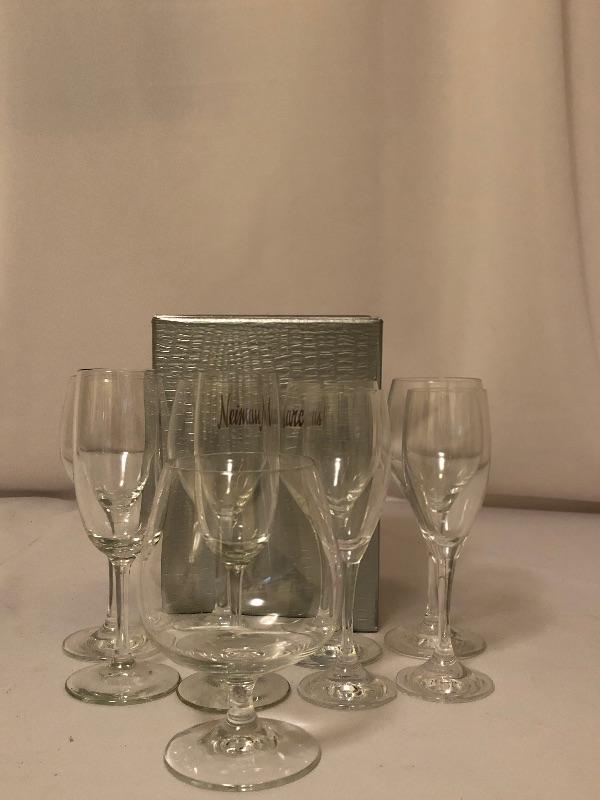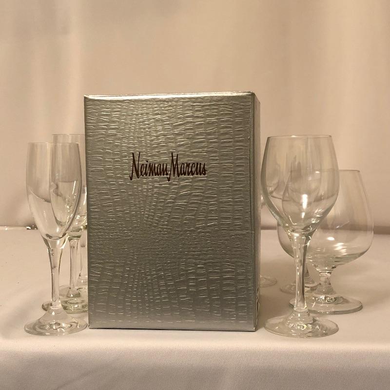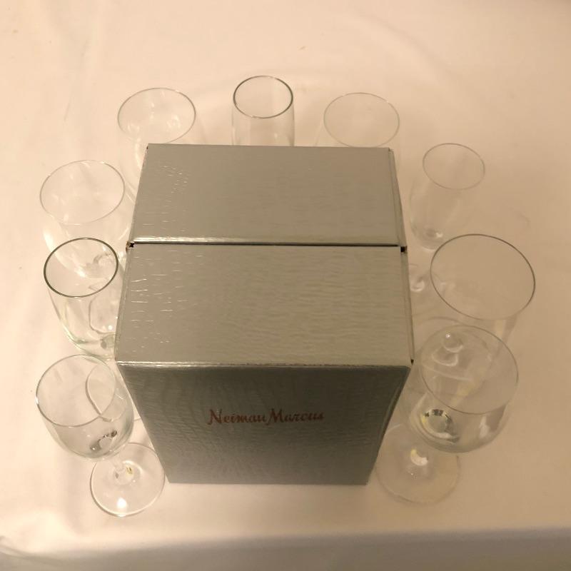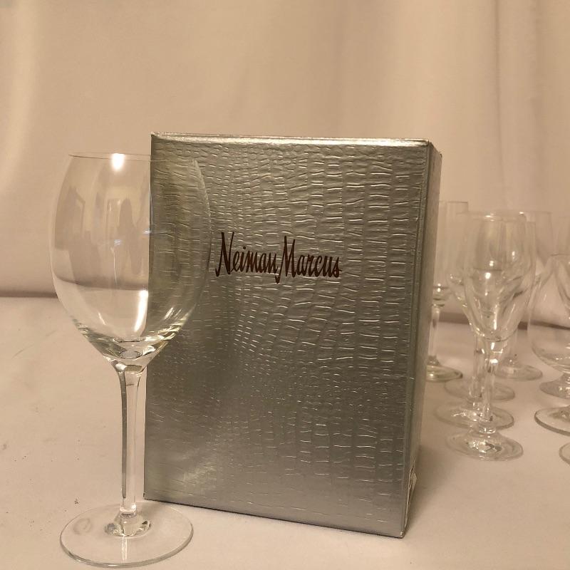 Box of 4 Neiman Marcus Crystalline wine glasses handmade in Slovenia. Lot also includes 4 other wine glasses, 4 champagne glasses, and a cognac