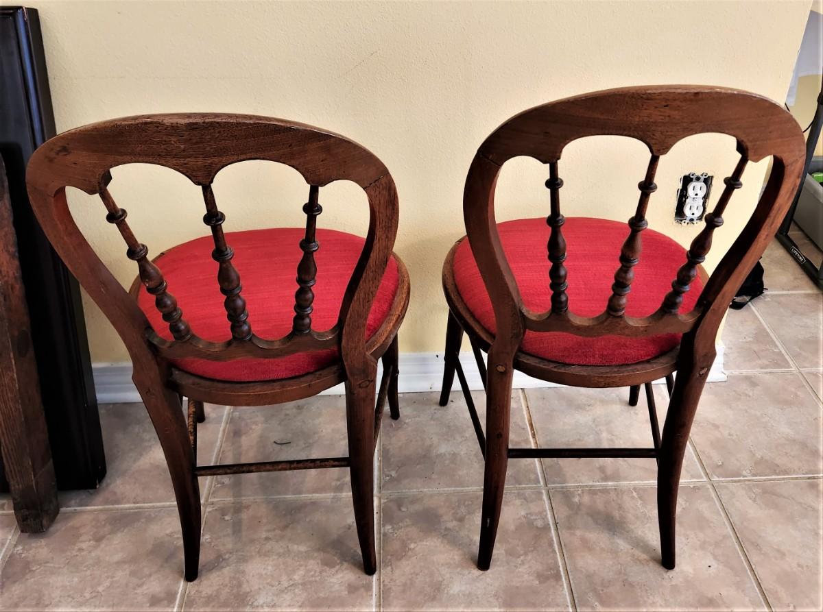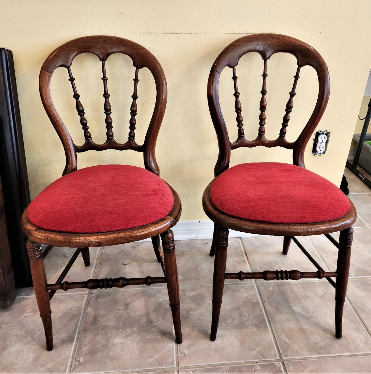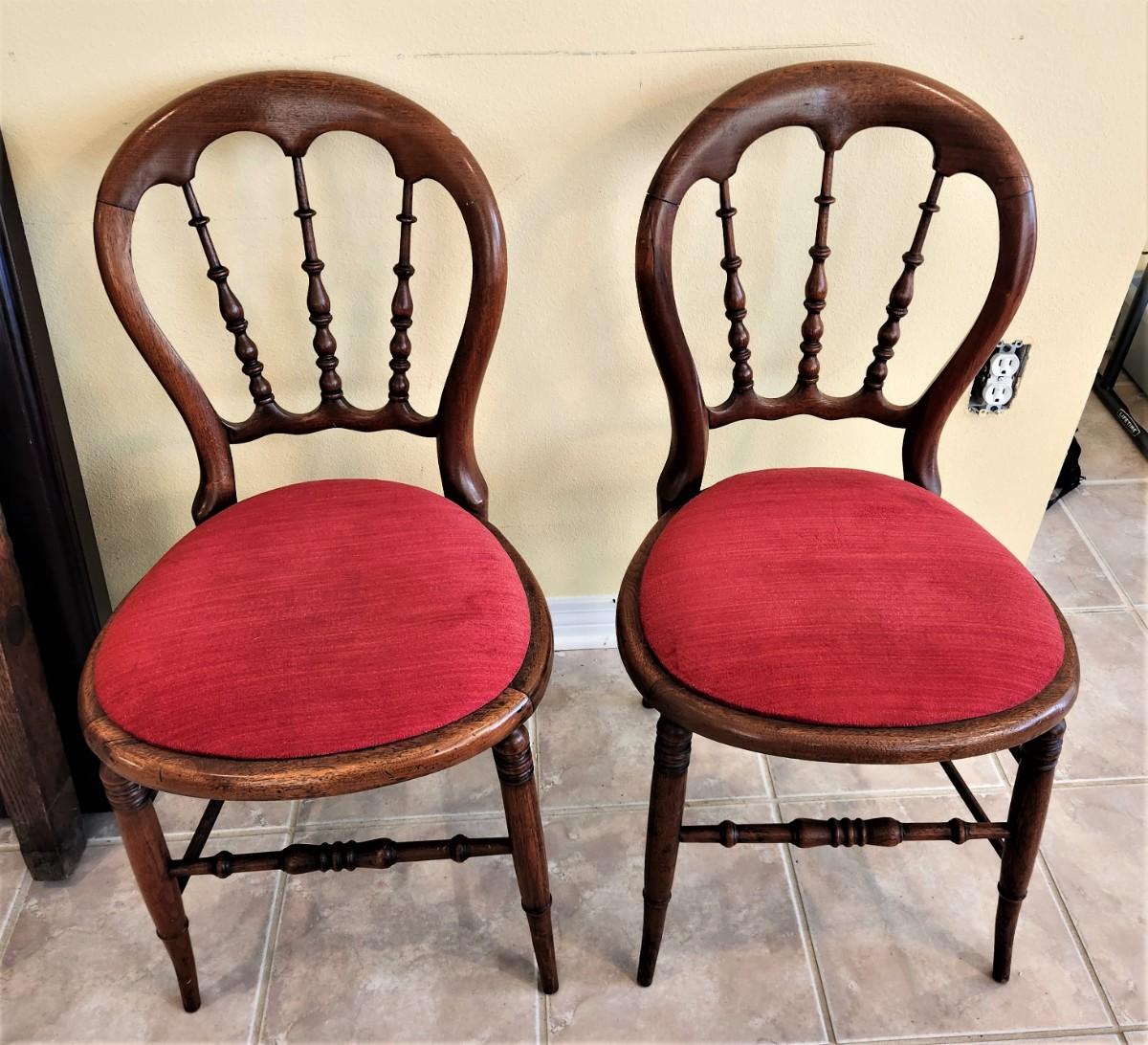 Nice matched pair of antique balloon-backed parlor chairs - 17" wide, 32.5" tall - one chair has a light "chew" problem on the back bottom stretcher - sand and stain (no big deal). Late 19th century.