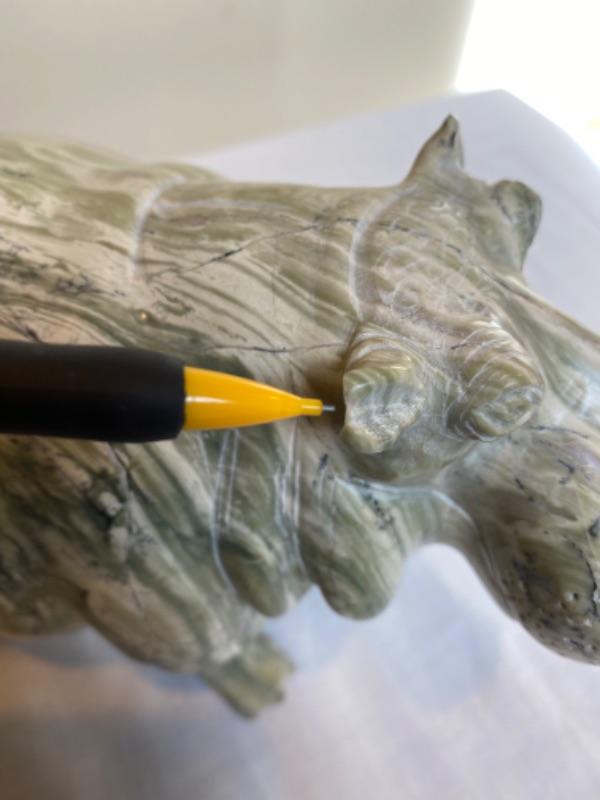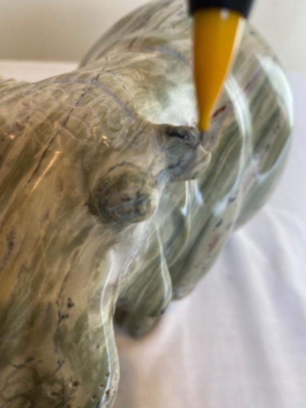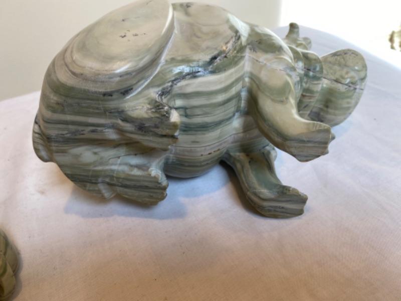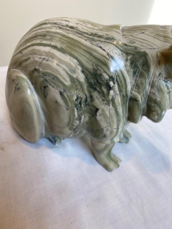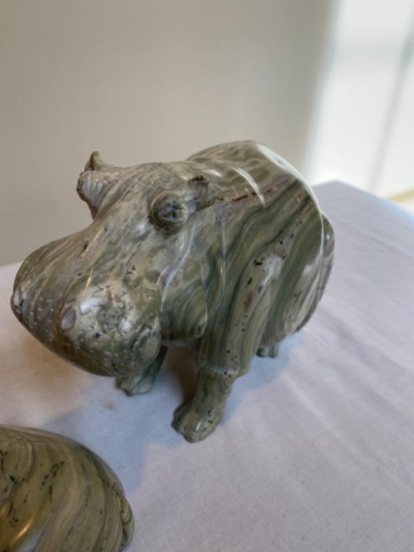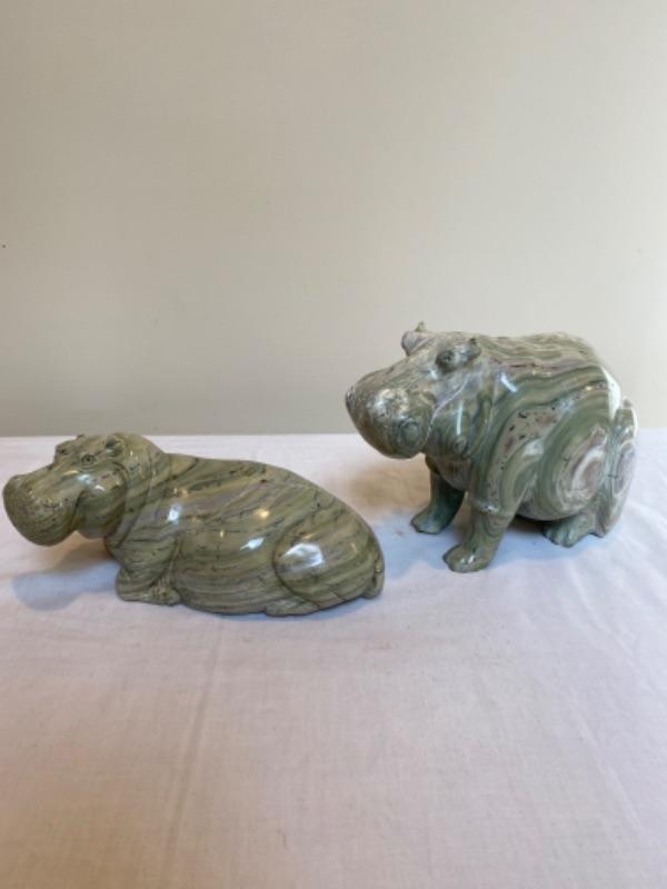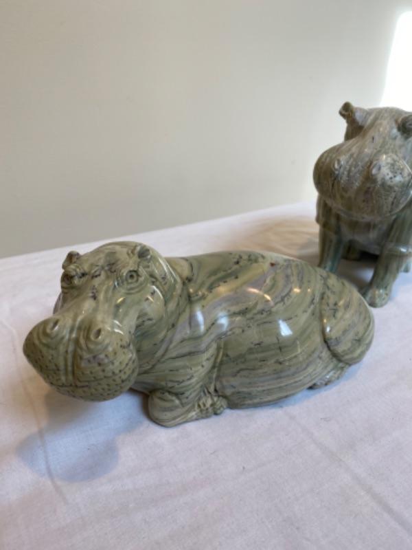 Pair of marble hippos that are very heavy. One is signed ES. There is a chip on one ear. Measurements for laying hippo is 8.5” long x 4.75” wide