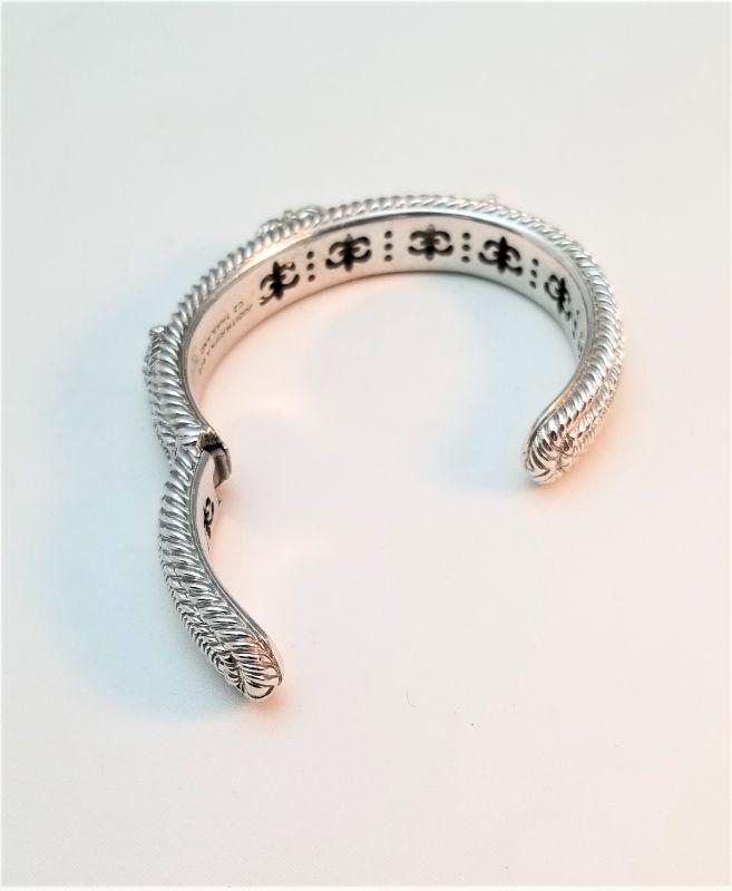 Nice heavy sterling silver cuff bracelel - heart motif, set with CZs - by designer Judith Ripka. Weighs 1.55 ounces. Note: this is designed to fit a small wrist. I would recommend no larger than a 6 inch wrist.