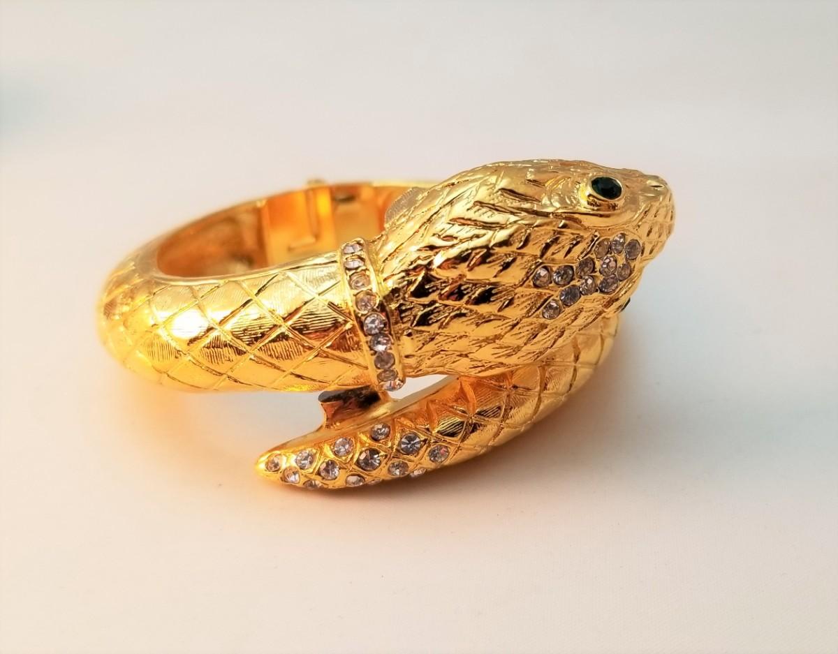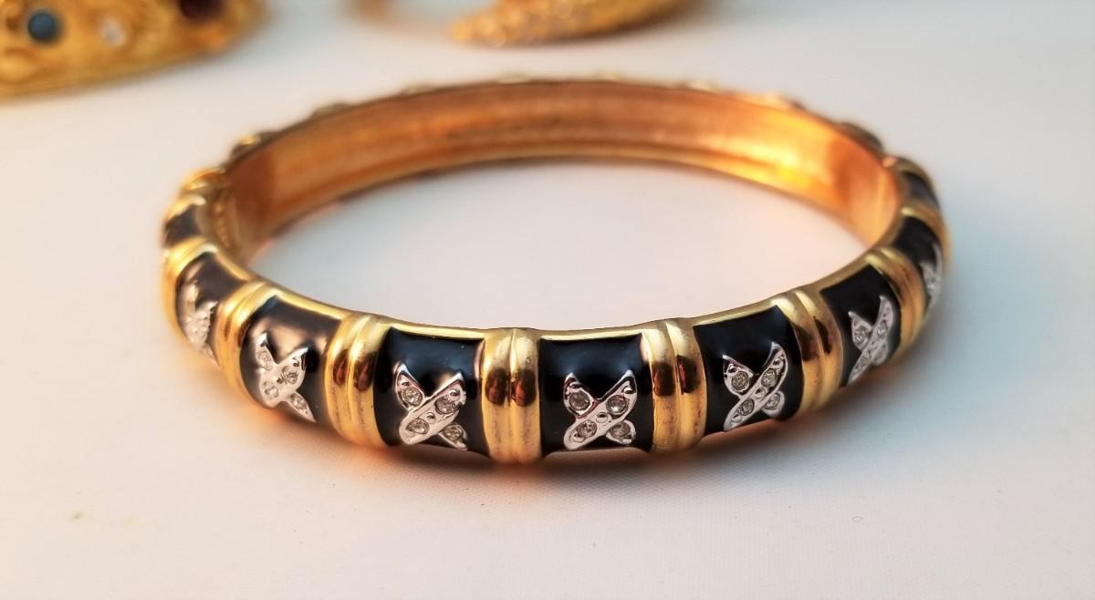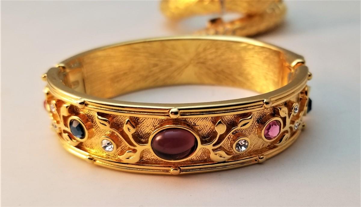 Three yummy costume imposters - the hinged bangle with cabochon stones is marked MVH (Michaela Von Hapsburg), a high-end name. Heavy, excellent quality. The black enamel-style bracelet set with CZs is hinged with a magnetic closure. The snake/serpent bracelet is a beauty - hinged, surprisingly unmarked, and set with clear and green CZs. All in excelleng condition