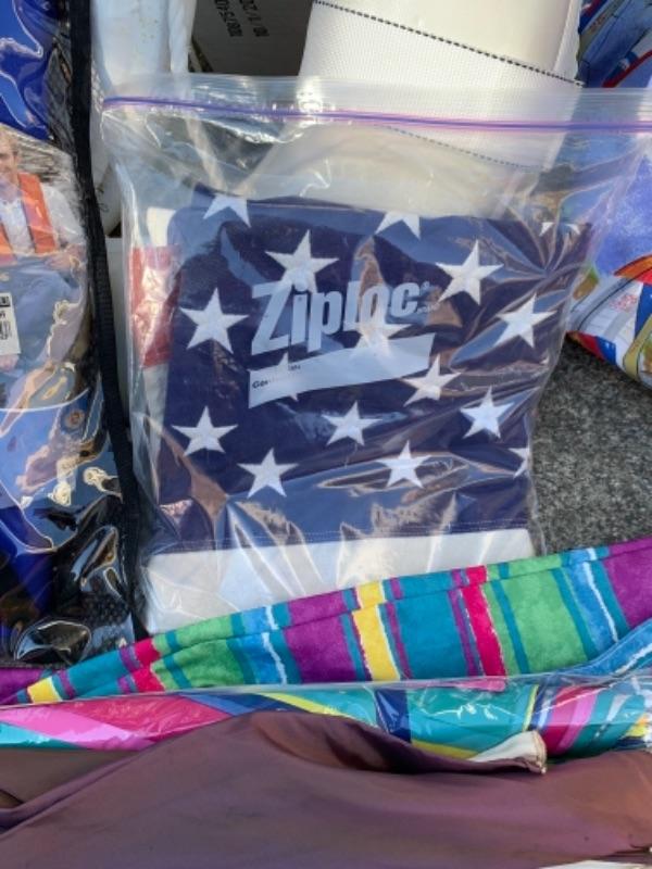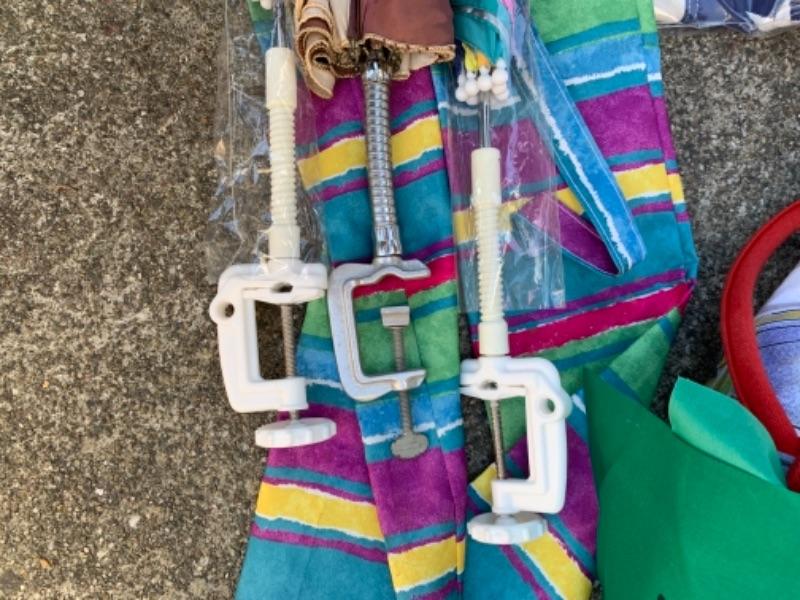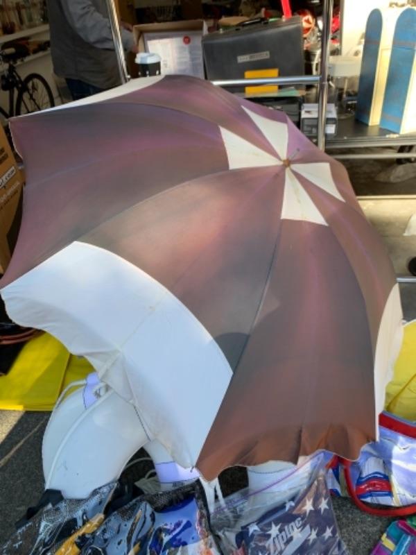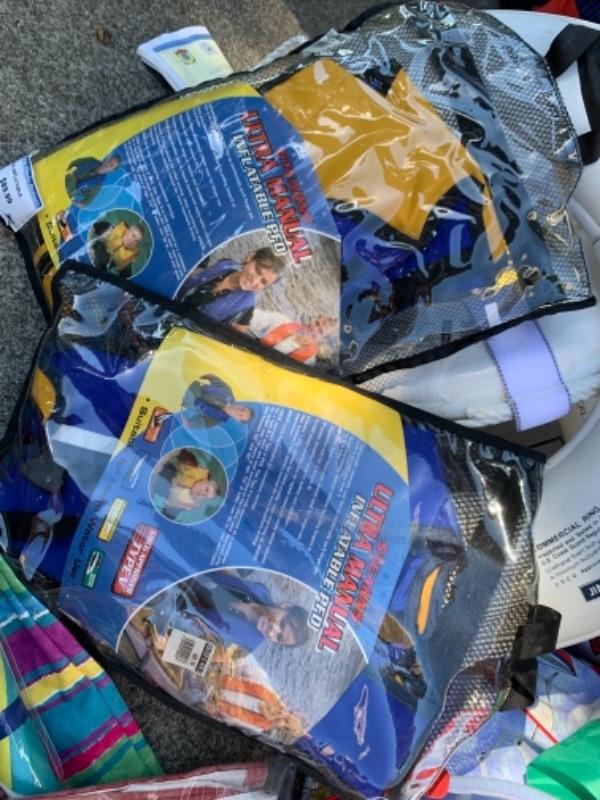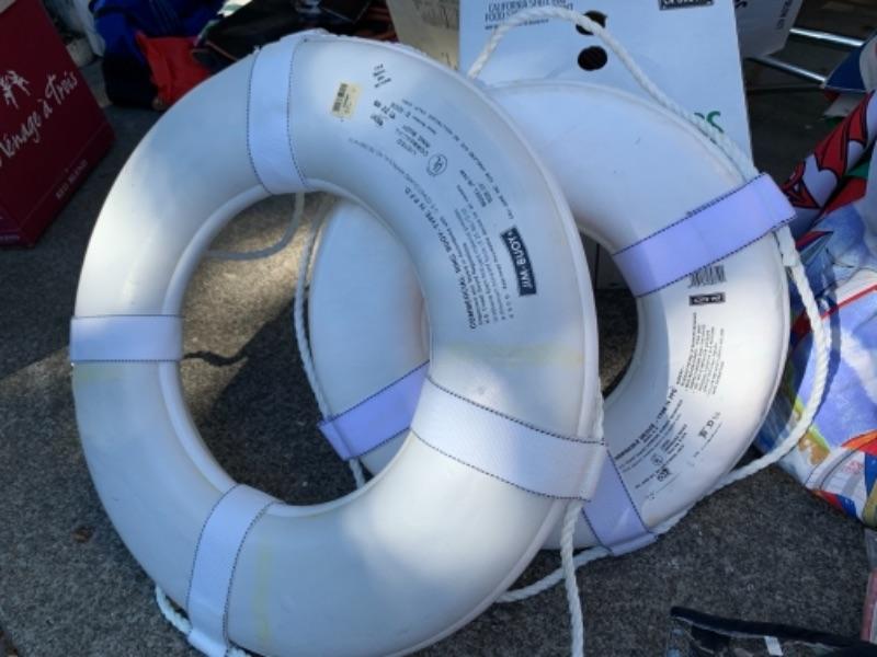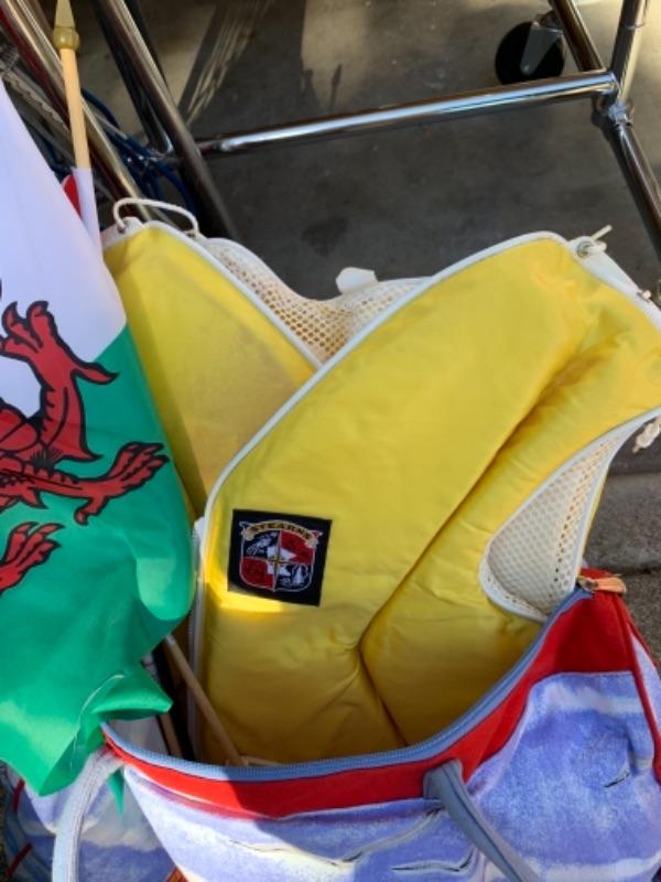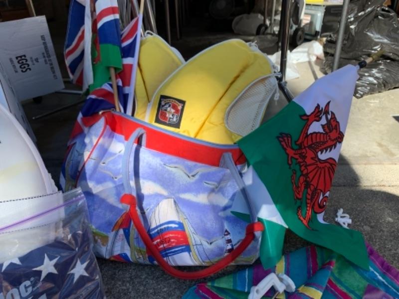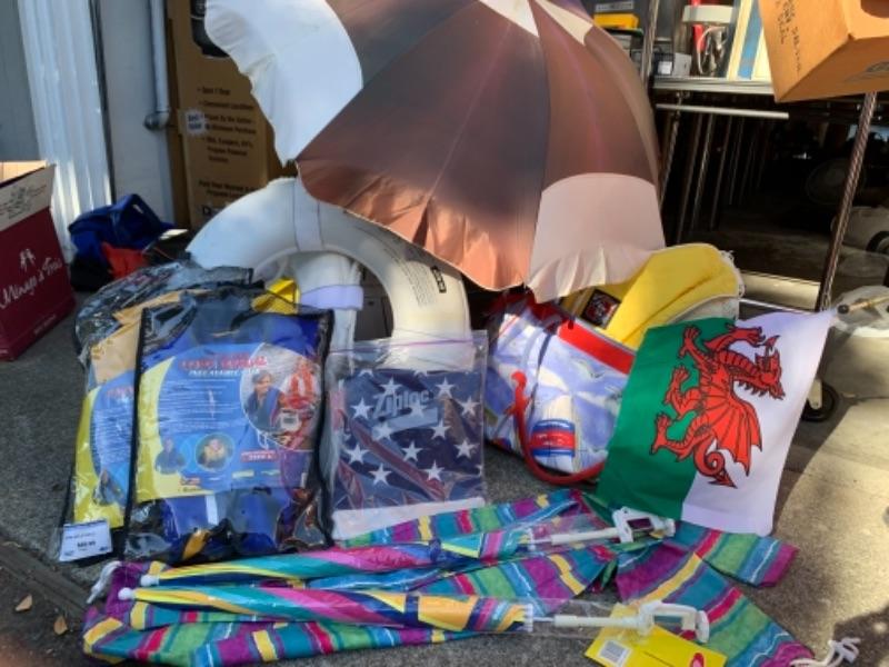 Lot 109. Three umbrellas with table brackets, one tote, flags, two life bests, and 2 life preservers, etc,--$65