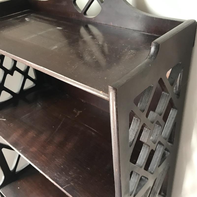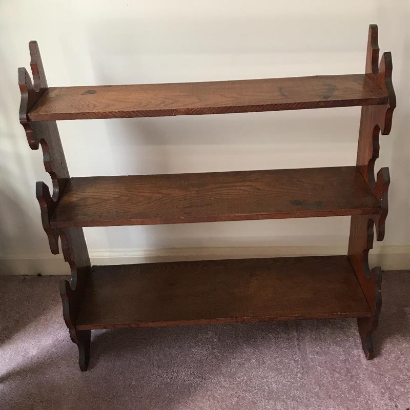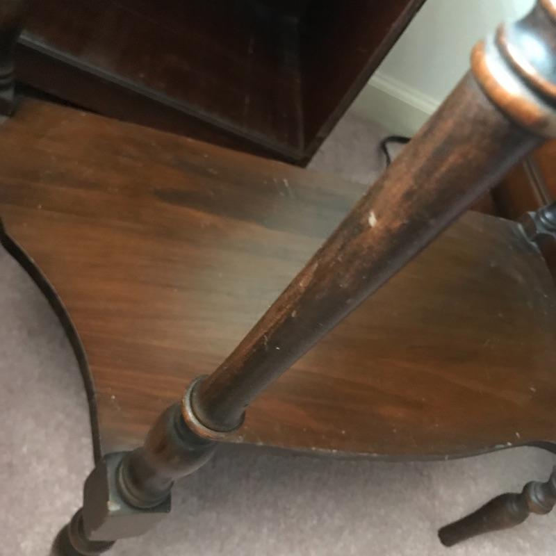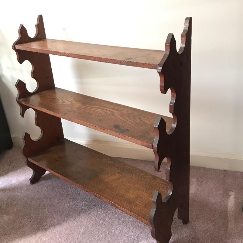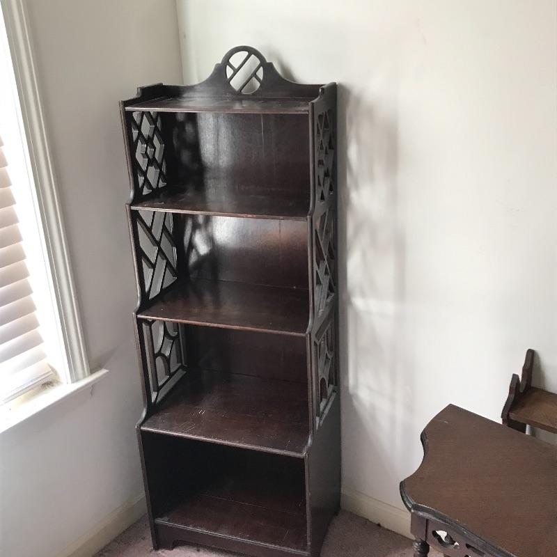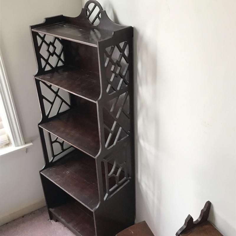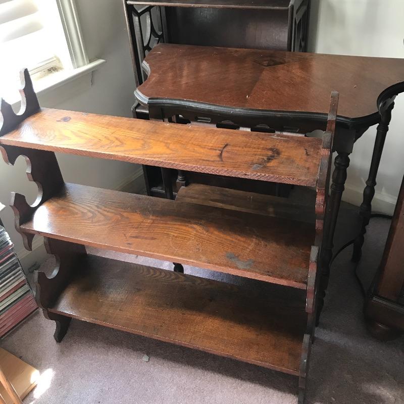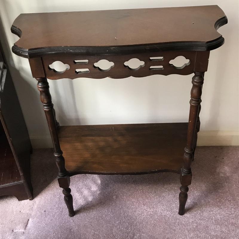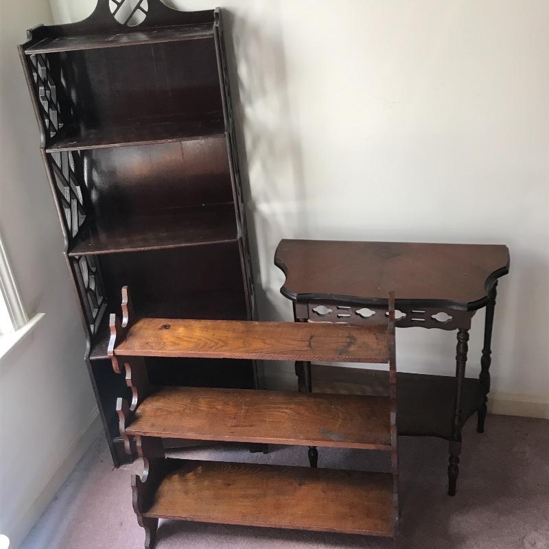 Lot includes three pieces of furniture. Tall piece is a unique style with dark stained wood shelf and measures approx. 18” x 8” x 51.5”. Hanging wall shelf is approx. 25” x 6” x 26”. Side table is approx. 24” x 12” x 24”. See pics. Local pickup only.