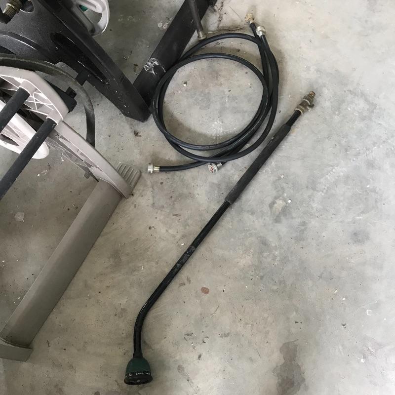 Hose Mobile and Suncast rolling caddies. Lot includes two spray nozzles and hose. Both appear in fine shape. See photos. No shipping.