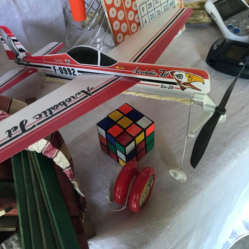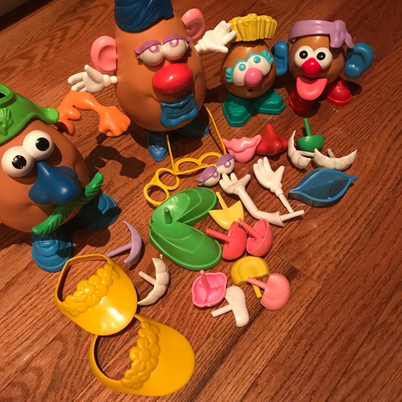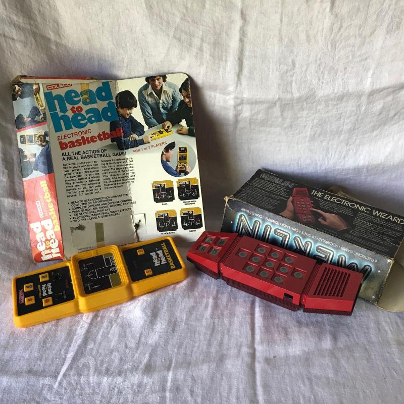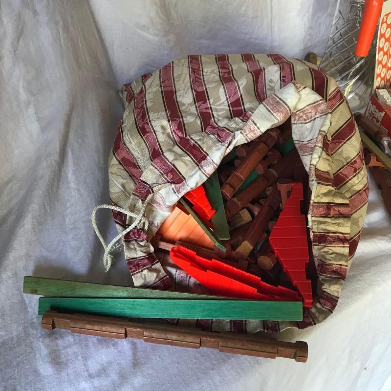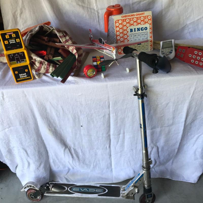Lot includes various classic kid’s toys including Lincoln Logs, a well-loved incomplete Mr. Potato Head set, Evade scooter, bingo set, and wooden baseball bats. Lot also has some vintage toys like a Head to Head electronic basketball game, a Merlin game and a foam airplane and more. There is even a vintage Tang pitcher to make it truly old school. See pics. No shipping