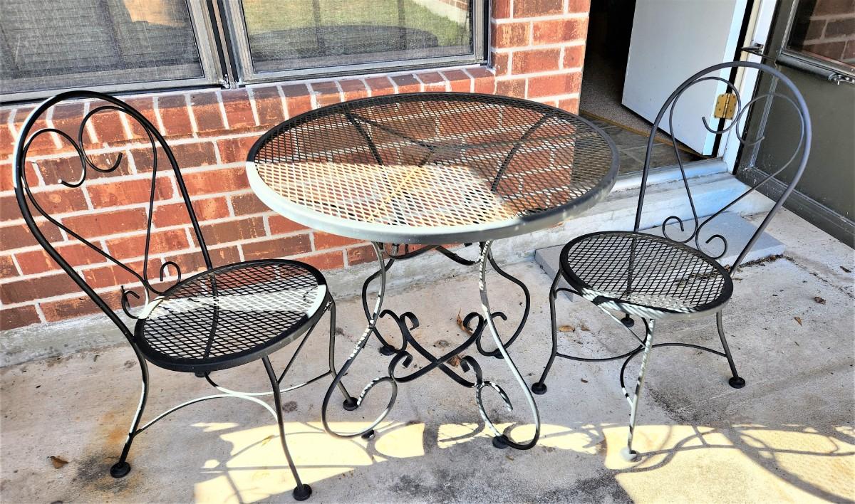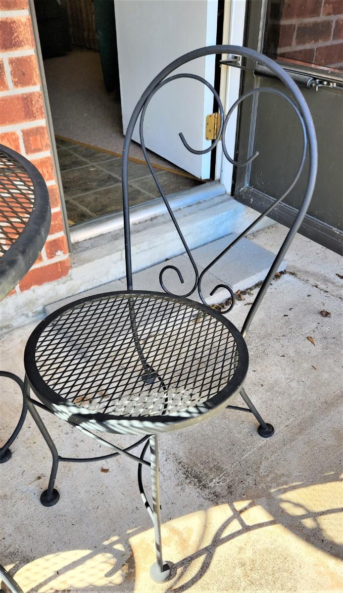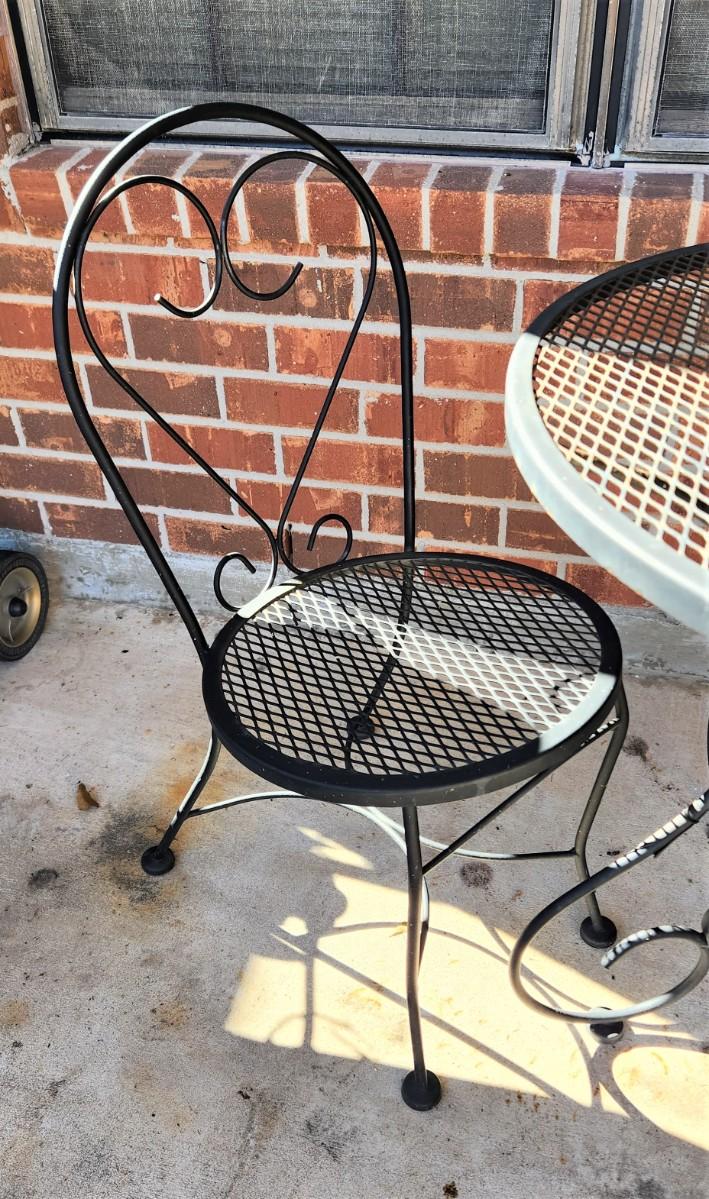 Vintage table and two matching chairs - metal bistro set. Note: No hole for umbrella. No maker noted. Chairs are 34" tall. Table is 30" across and 28.5" tall. Good vintage condition.
