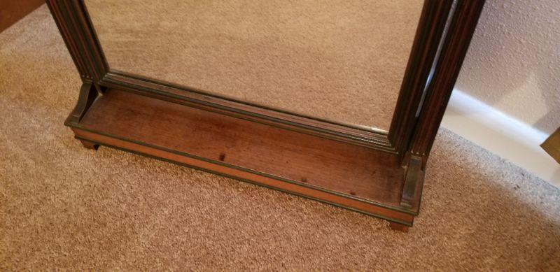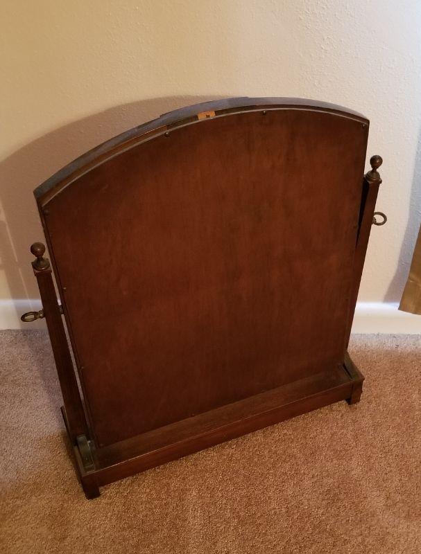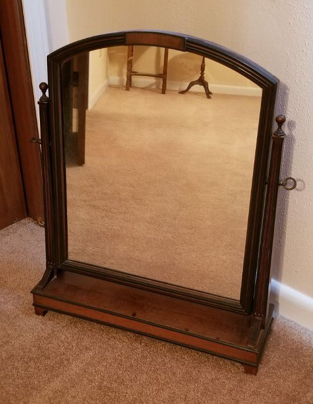 Nice vintage Shaving Mirror to put on top of a dresser or table. Good vintage condition - solid wood. 22.5" wide, 7" deep, 27" tall.