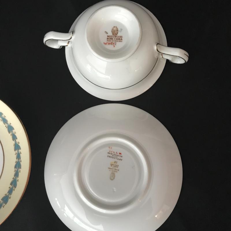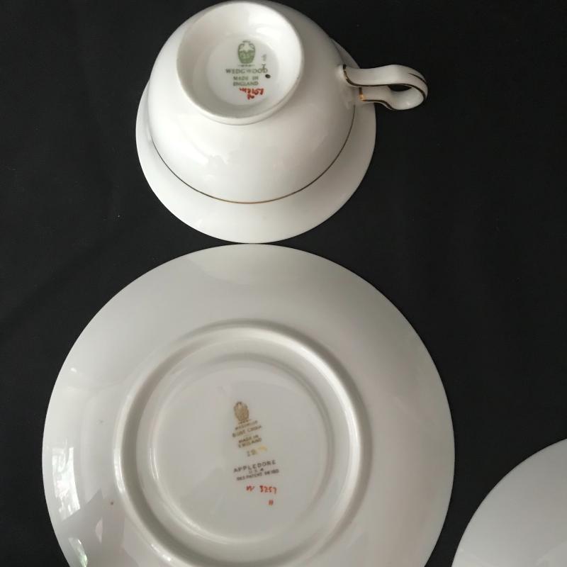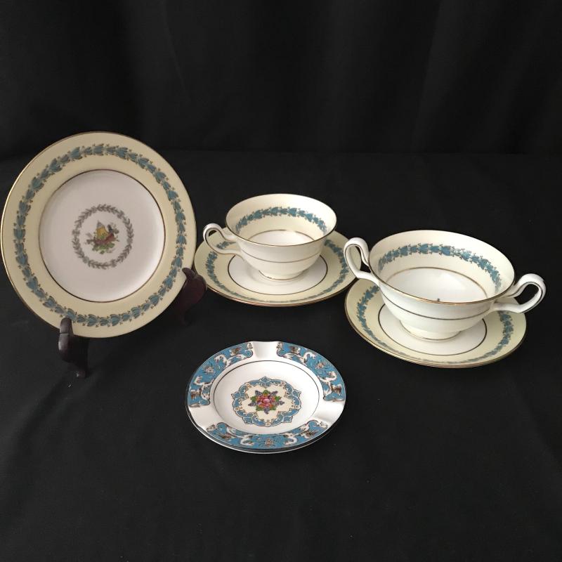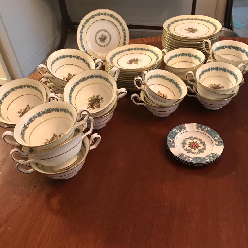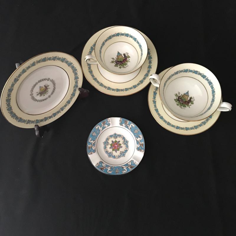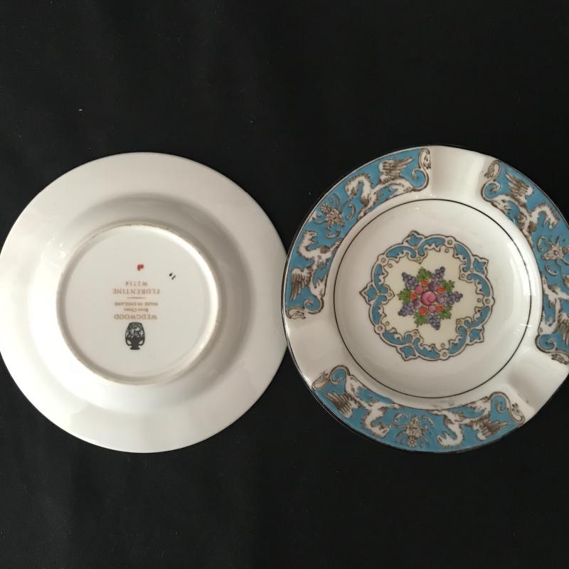 Beautiful tea set includes 13 teacups with 14 saucers (measuring 6.25” diameter), 12 double handeled teacups with 12 saucers (6“ diameter), one unique saucer with an extra flower rim and stand included. Lot also includes two dragon ashtrays, also by Wedgwood. Excellent condition. Shipping Available.