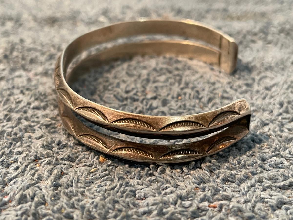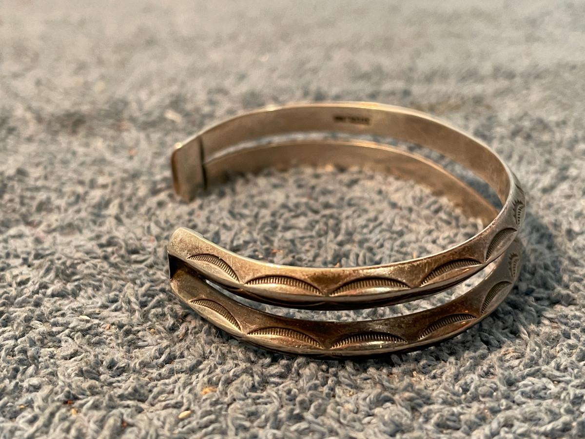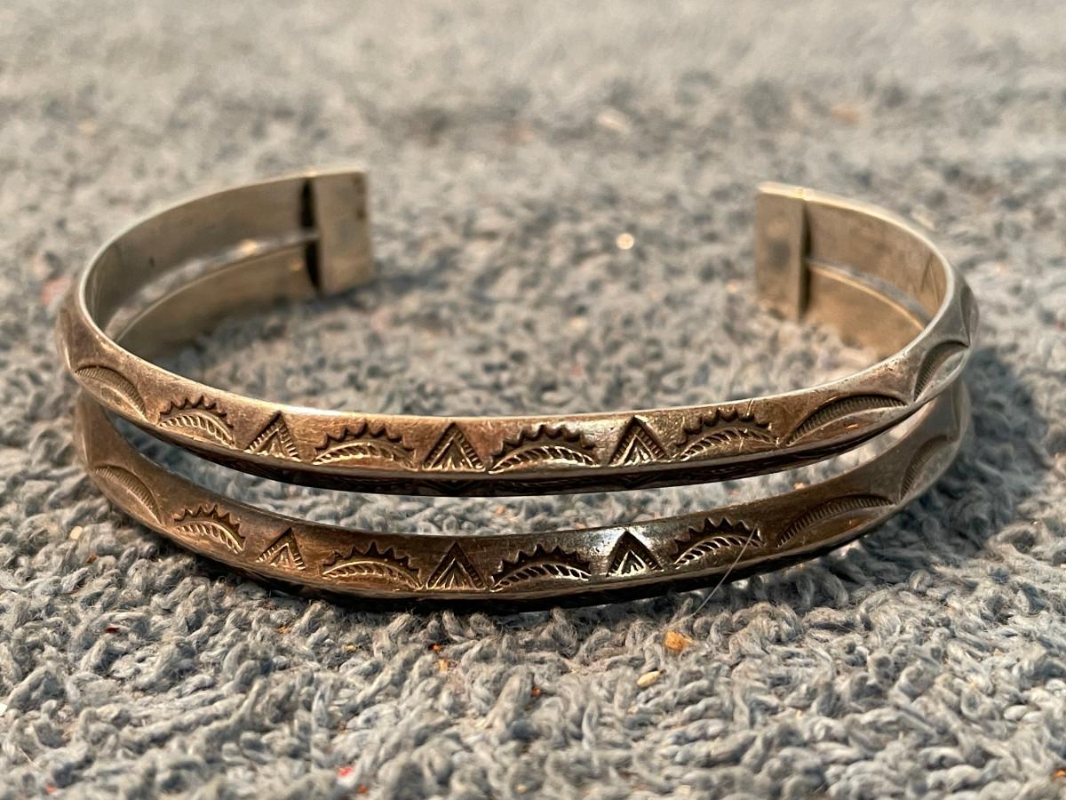 THIS IS A WONDERFUL VINTAGE STERLING NATIVE AMERICAN DESIGN CUFF BRACELET!!! 24.17GR TW.. 1/2'' WIDE, 5 1/2'' INSIDE, 1 1/2'' OPENING, 7'' TOTAL.. LIGHT WEAR..