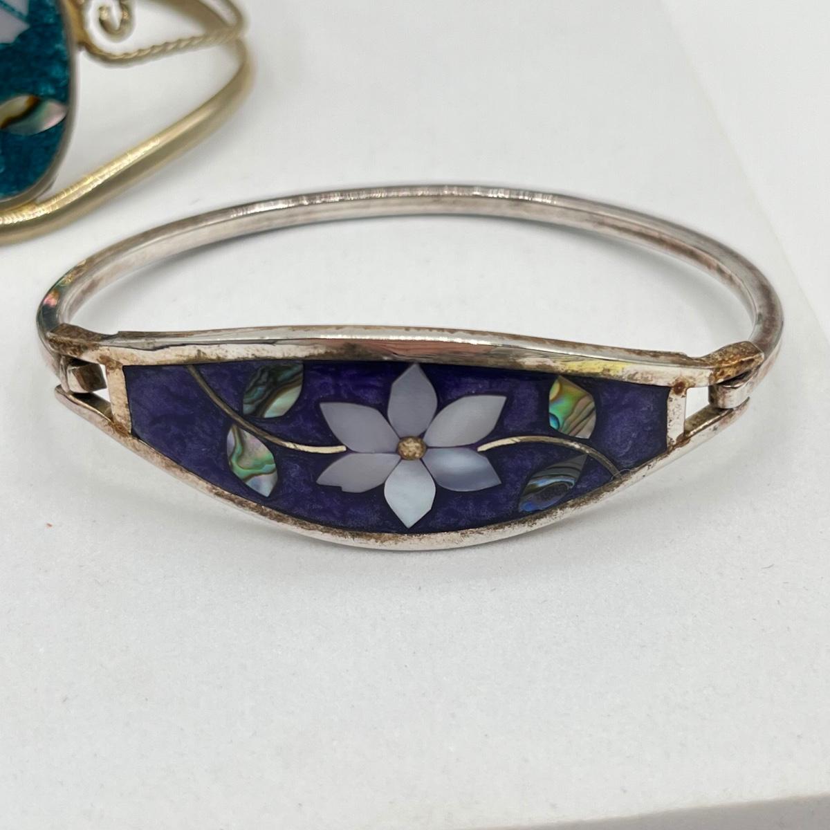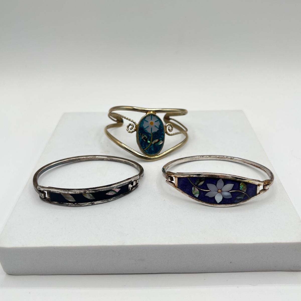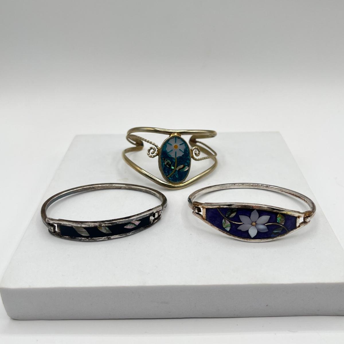 LOT 86J: Two Cuff and One Hinged Bangle Bracelet Inlay Gemstone Mexico
