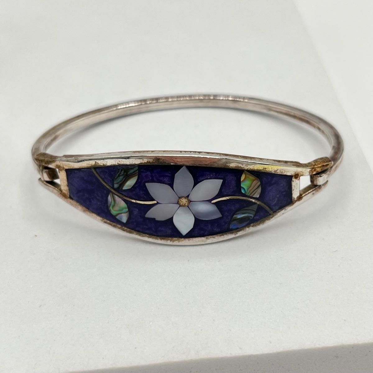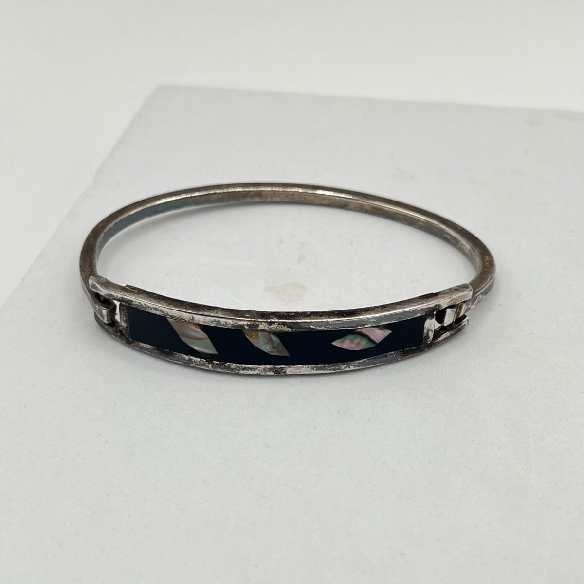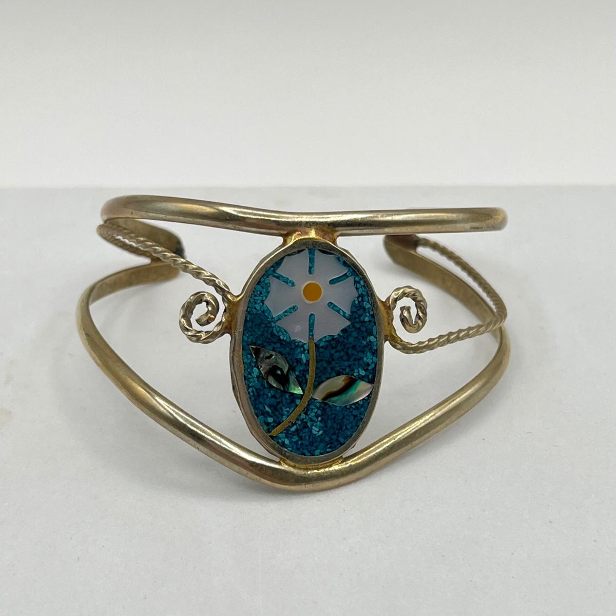 LOT 86J: Two Cuff and One Hinged Bangle Bracelet Inlay Gemstone Mexico