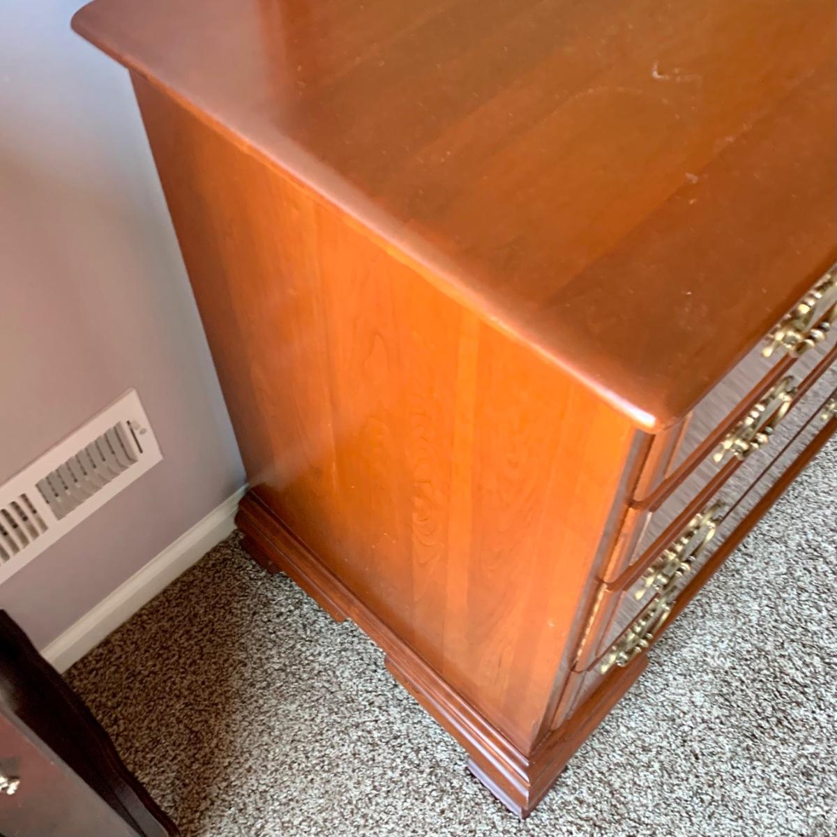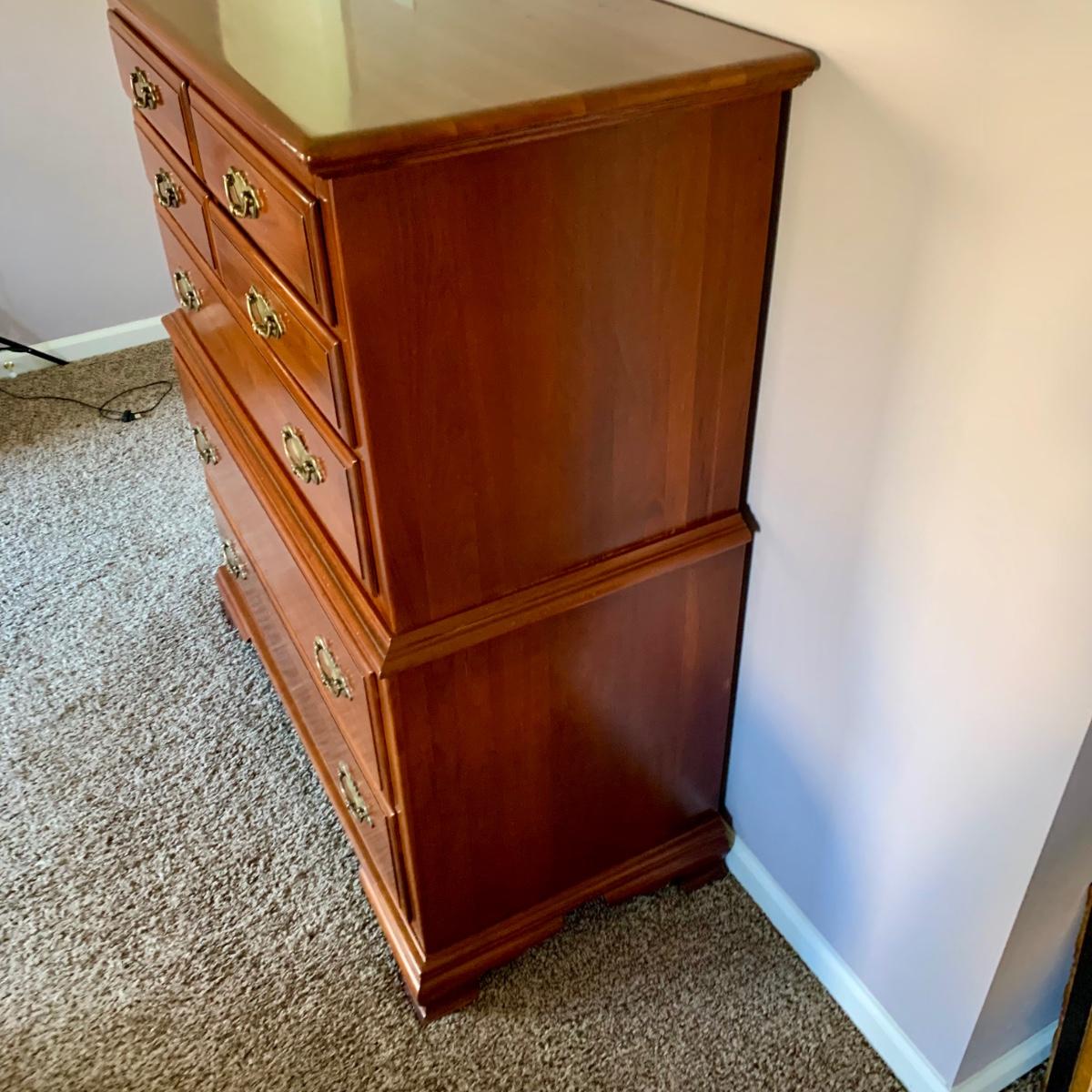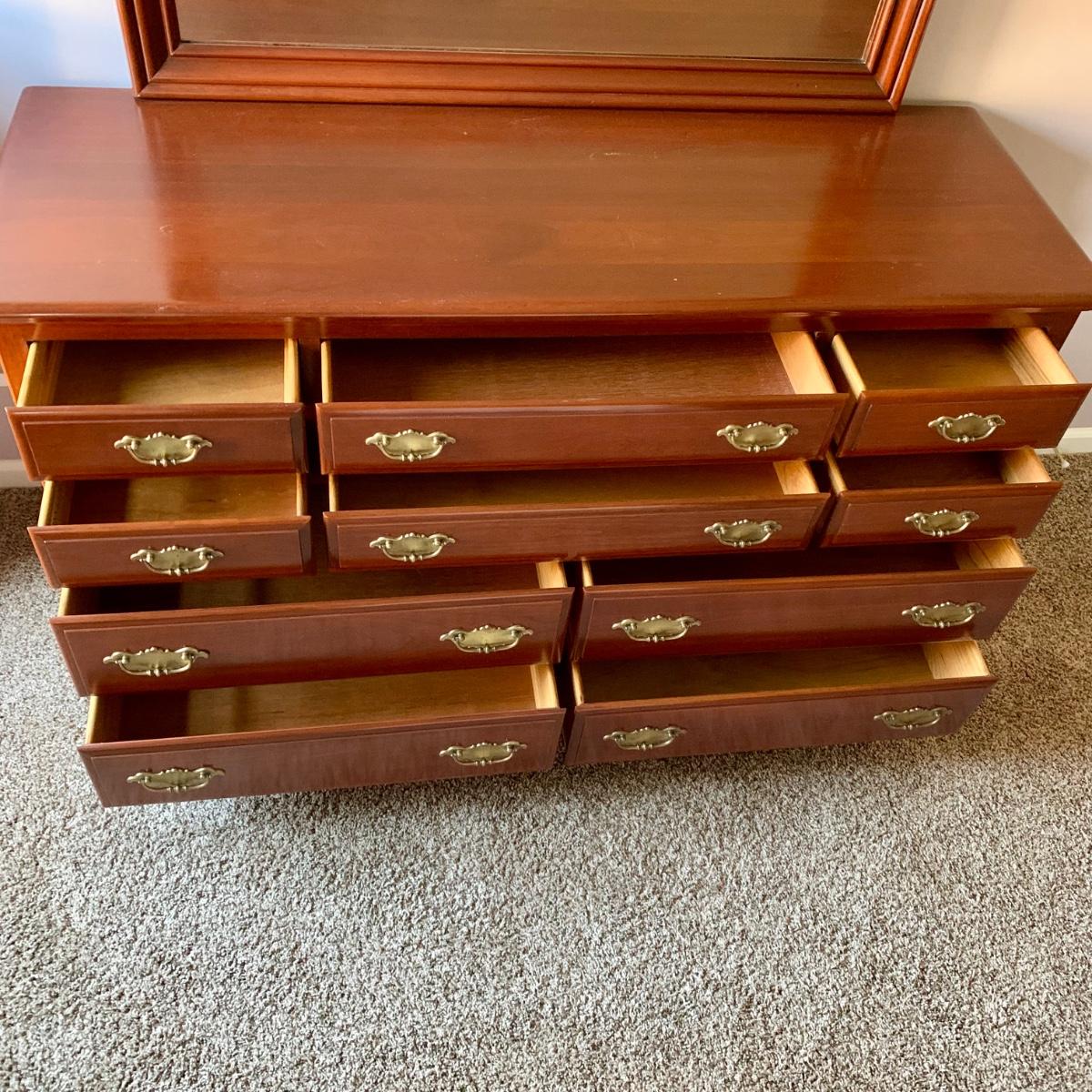 LOT 218 M: Taylor Jamestown Cherry Wood Bedroom Set: 7 Drawer Chest Of Drawers, Two 2 Drawer Bedside Tables, 10 Drawer Dresser w/ Mirror, & 2 Stiffel Lamps