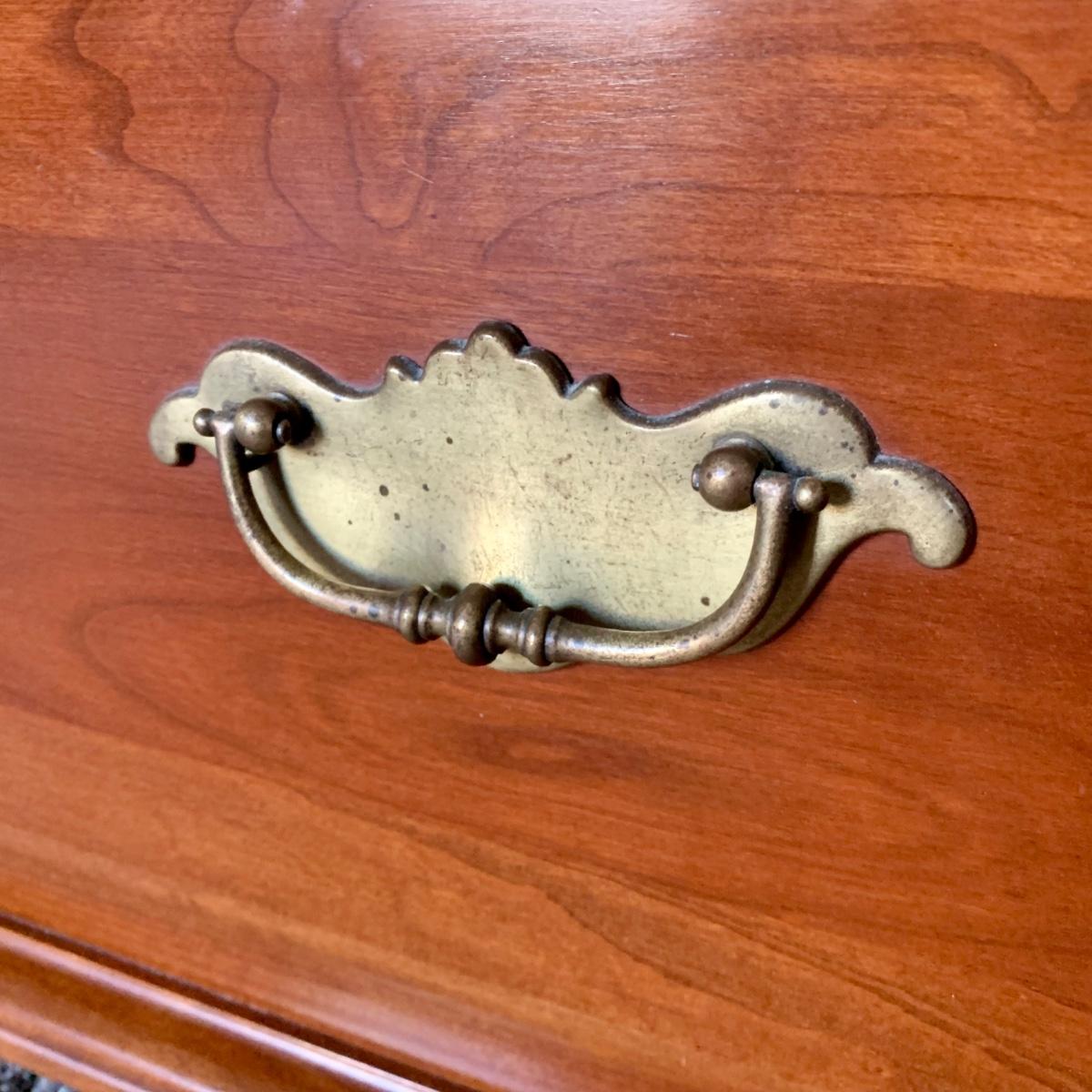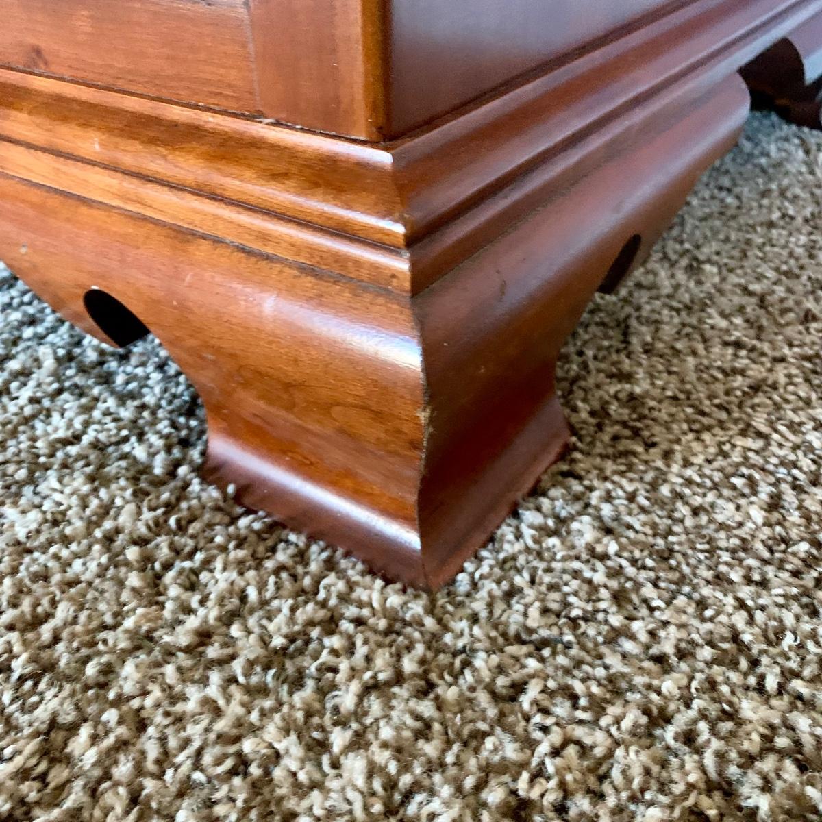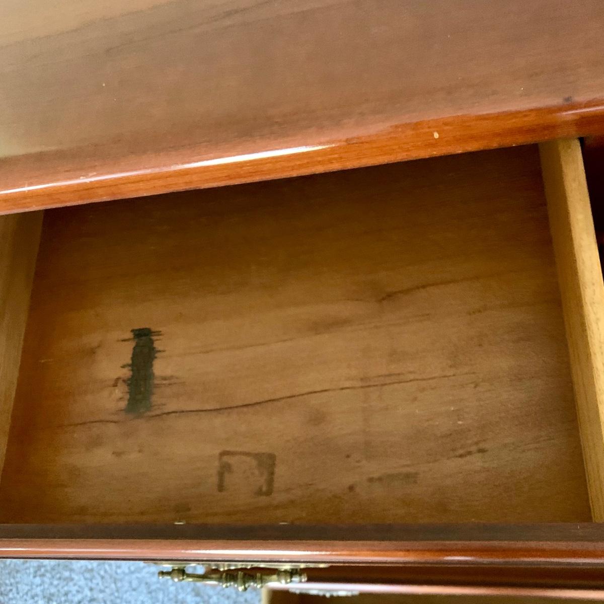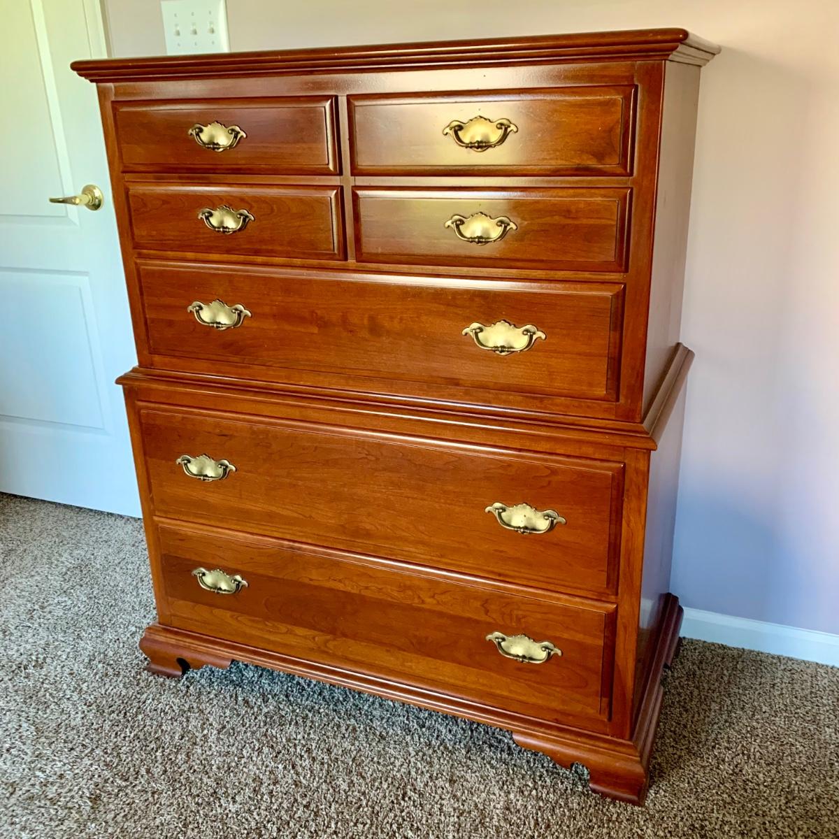 LOT 218 M: Taylor Jamestown Cherry Wood Bedroom Set: 7 Drawer Chest Of Drawers, Two 2 Drawer Bedside Tables, 10 Drawer Dresser w/ Mirror, & 2 Stiffel Lamps