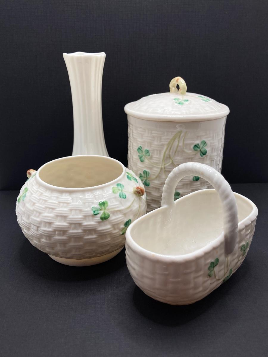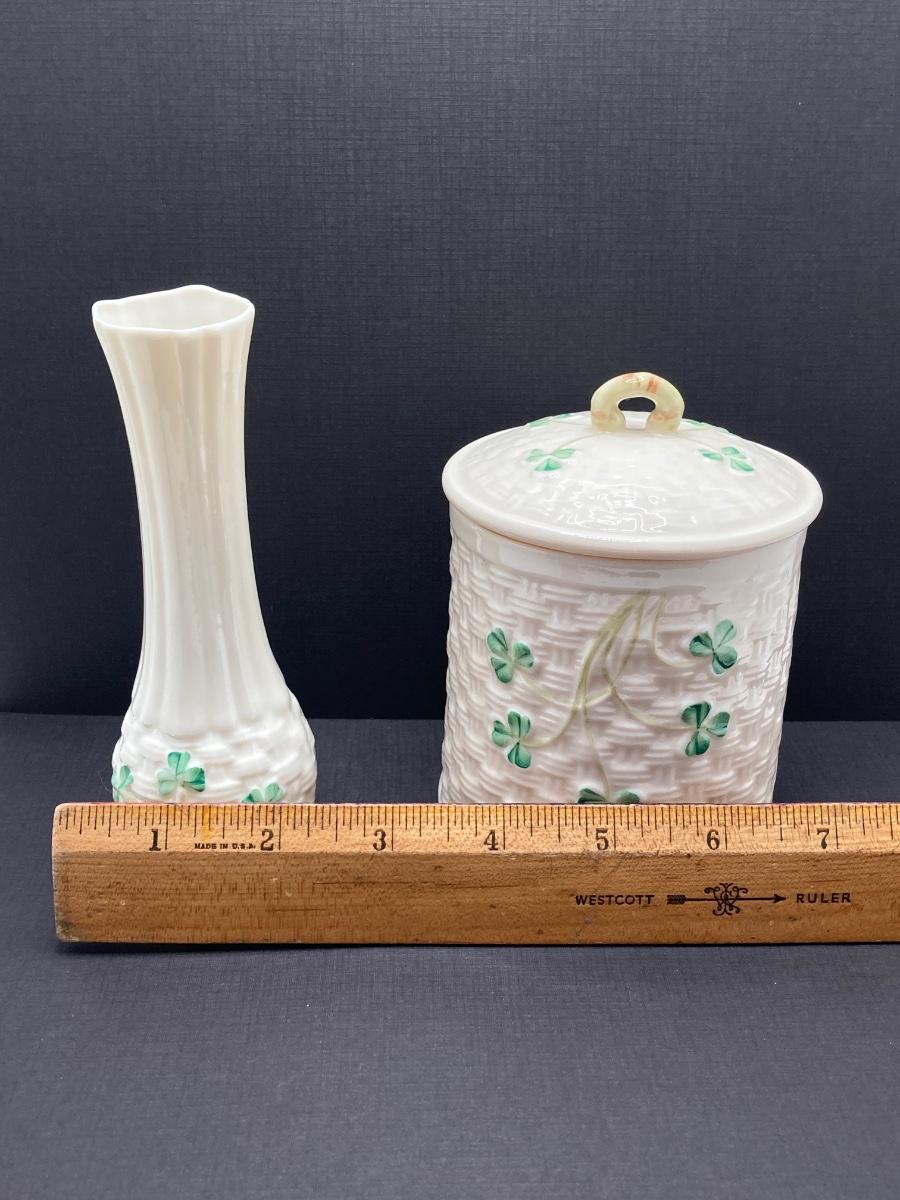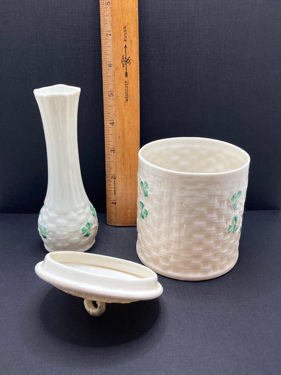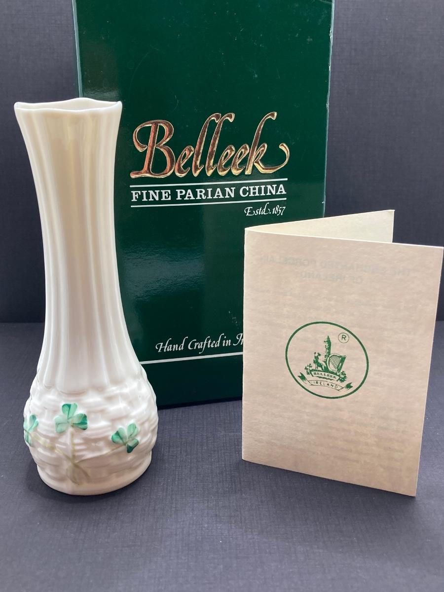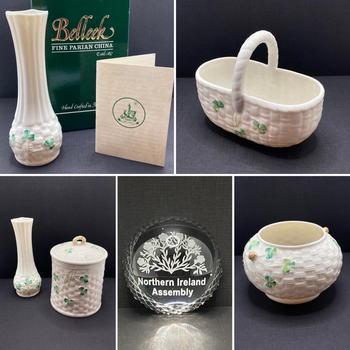 LOT 62: Belleek Bud Vase with Original Box, Miniature Basket, Cream and Sugar Bowls and Northern Ireland Assembly Paperweight