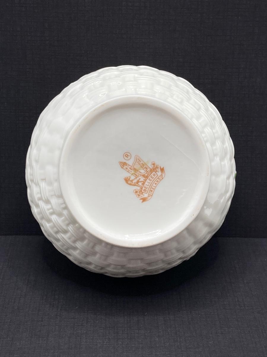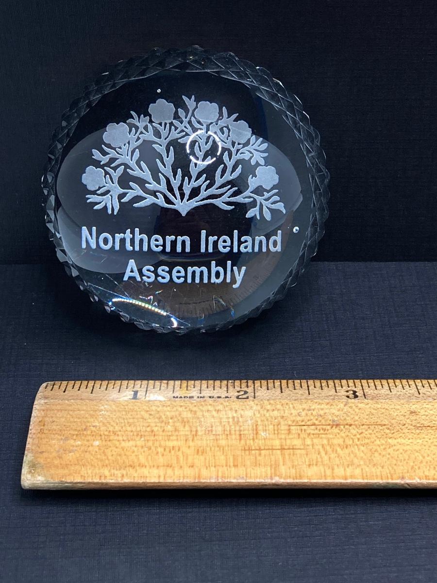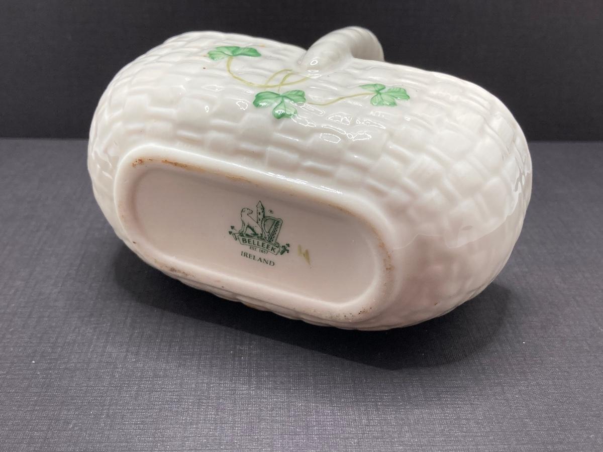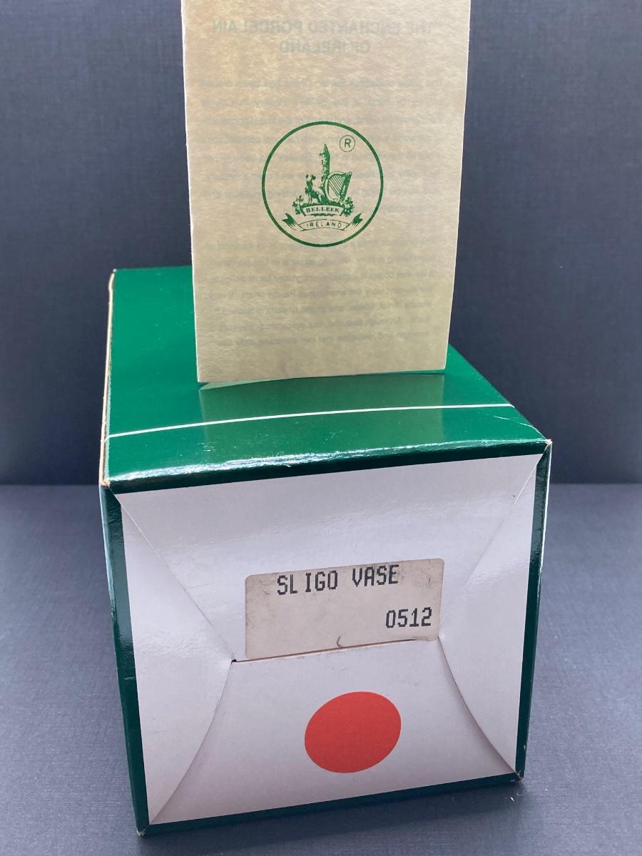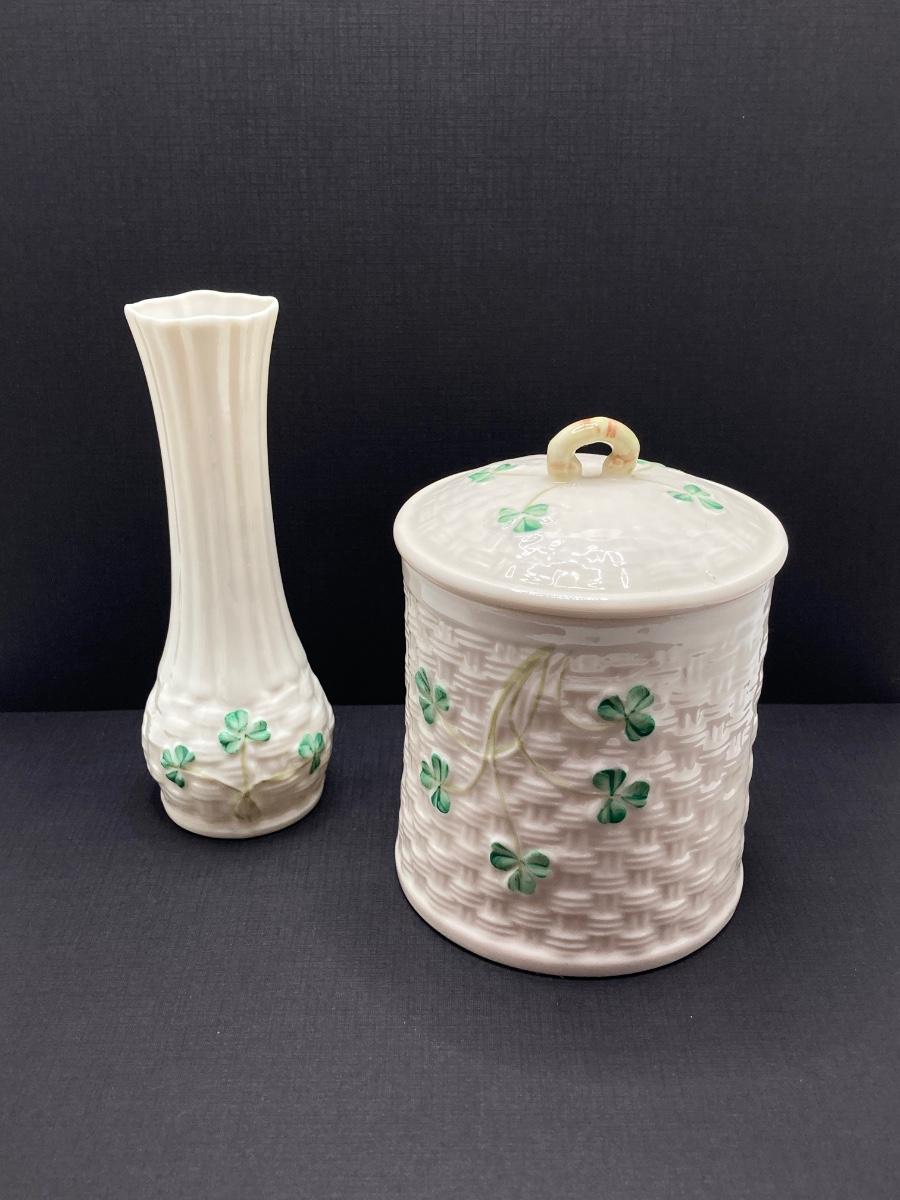 LOT 62: Belleek Bud Vase with Original Box, Miniature Basket, Cream and Sugar Bowls and Northern Ireland Assembly Paperweight