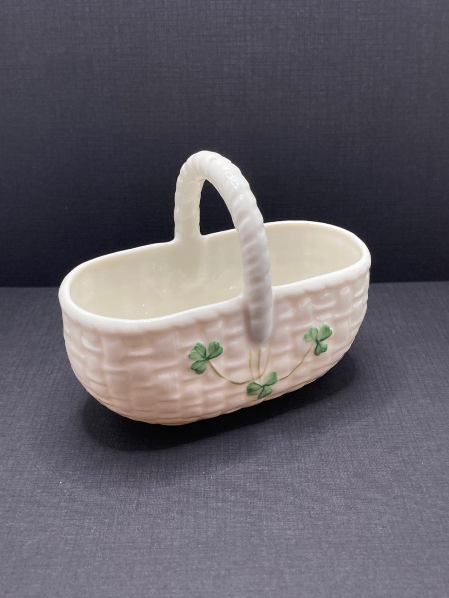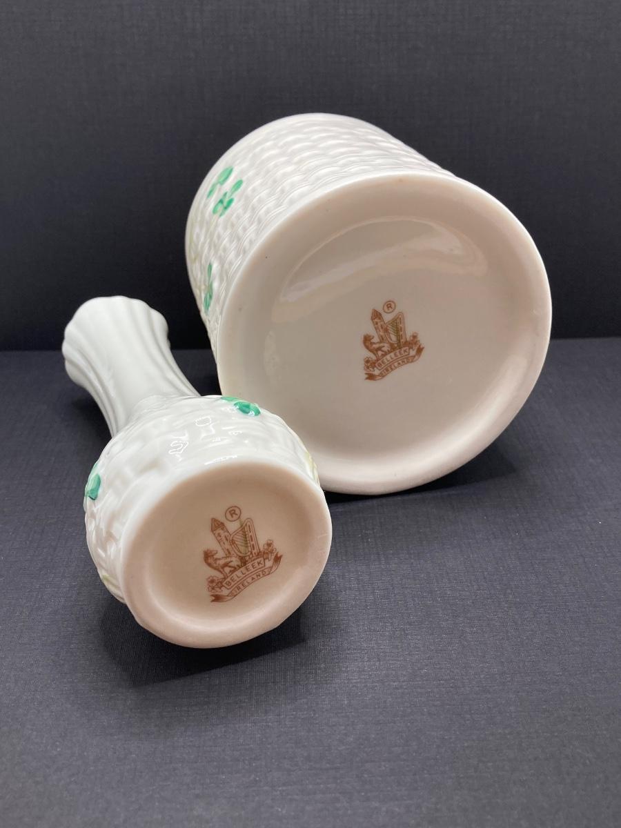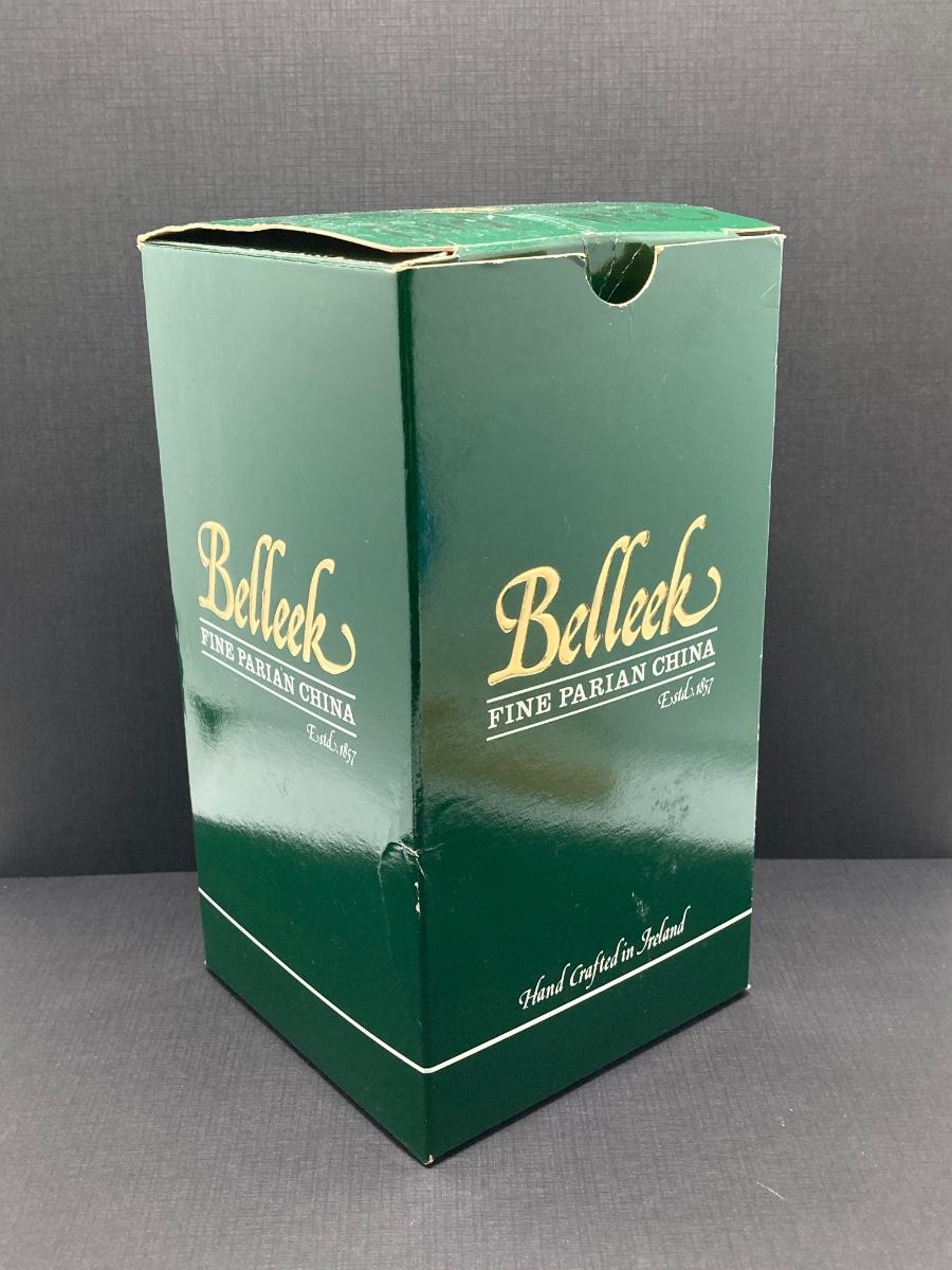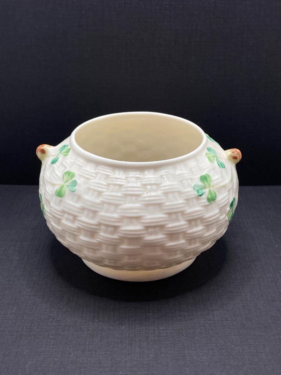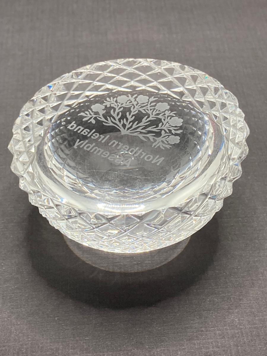 LOT 62: Belleek Bud Vase with Original Box, Miniature Basket, Cream and Sugar Bowls and Northern Ireland Assembly Paperweight