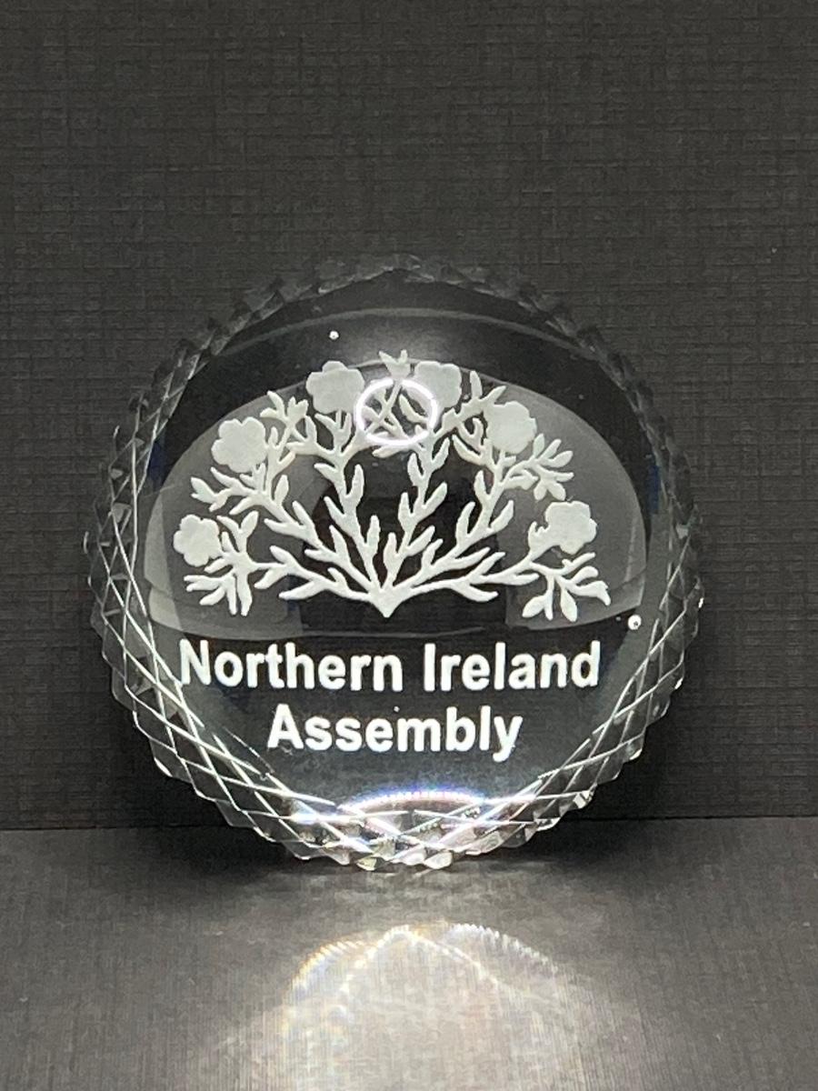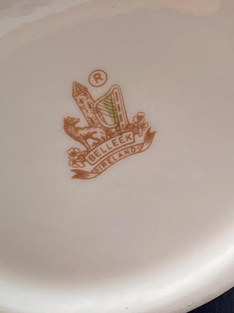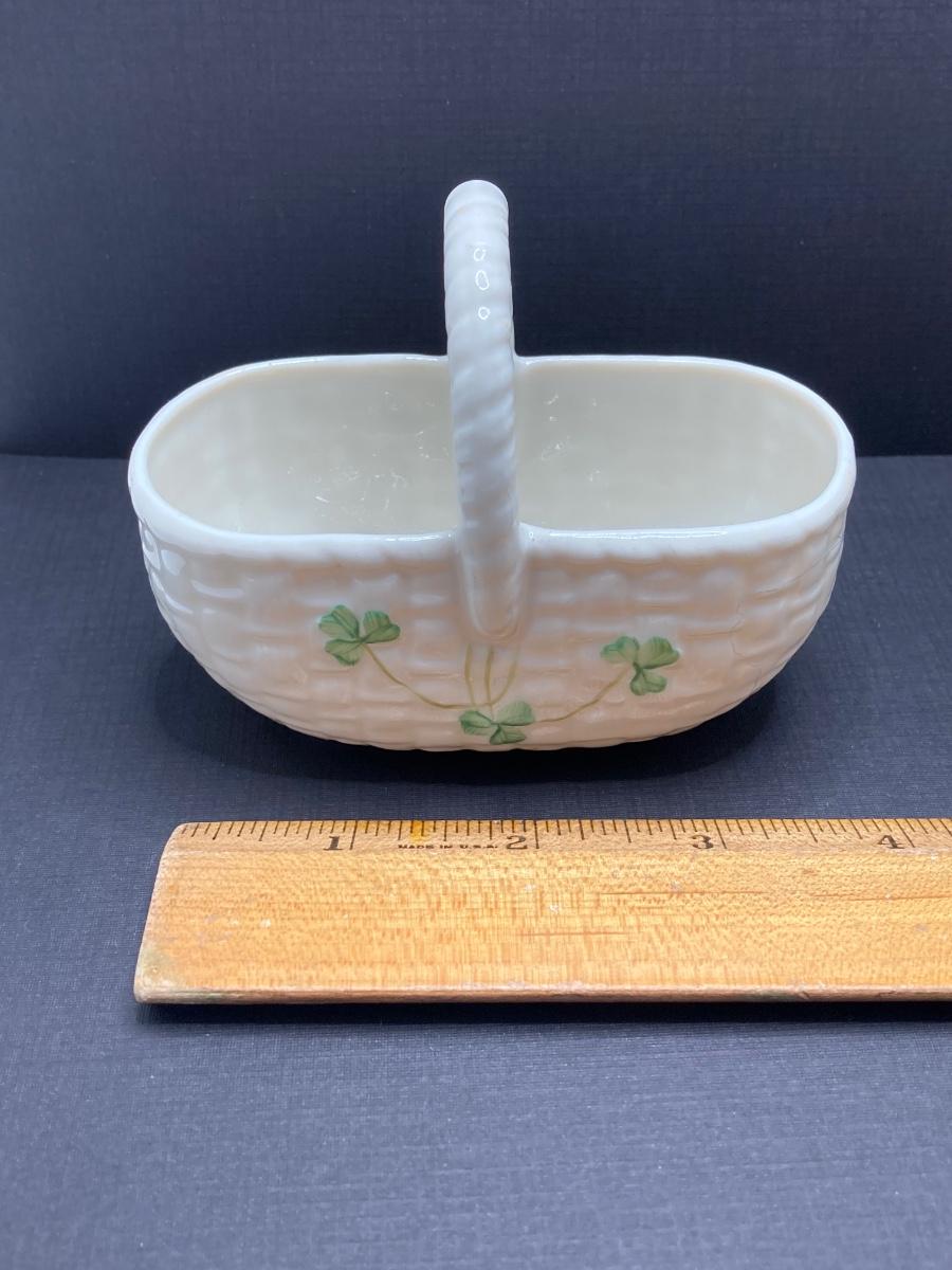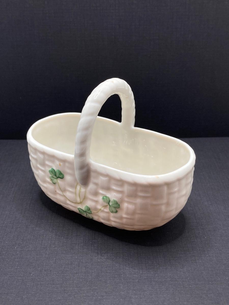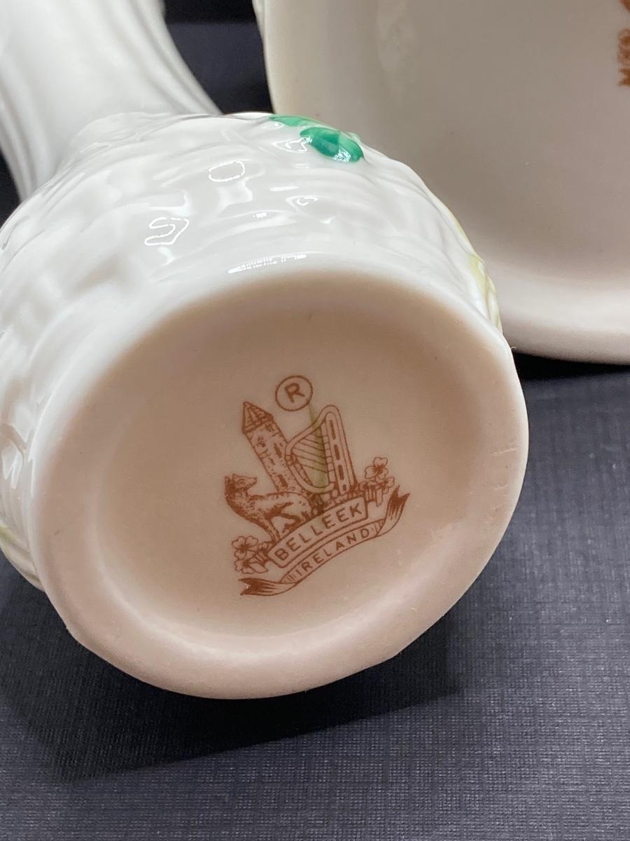 LOT 62: Belleek Bud Vase with Original Box, Miniature Basket, Cream and Sugar Bowls and Northern Ireland Assembly Paperweight