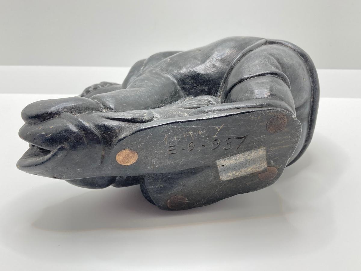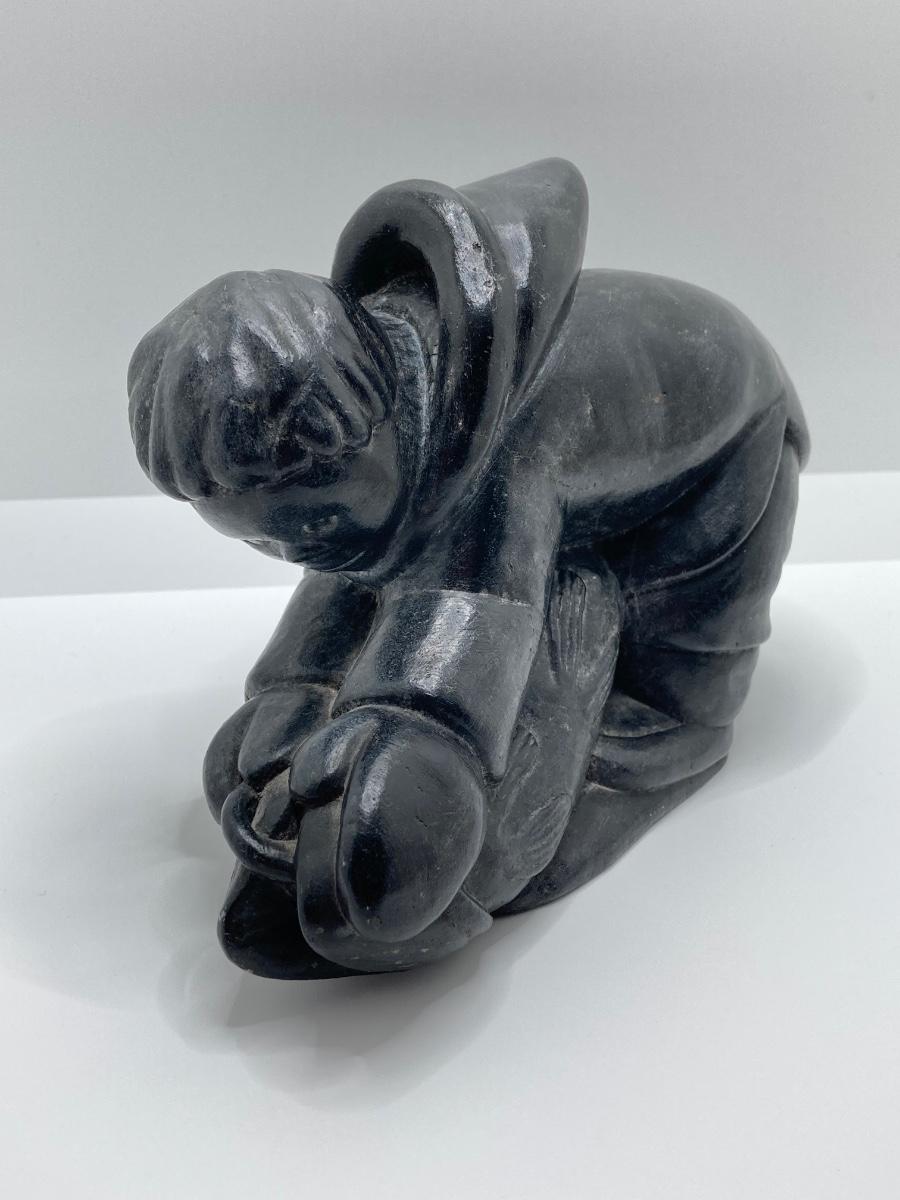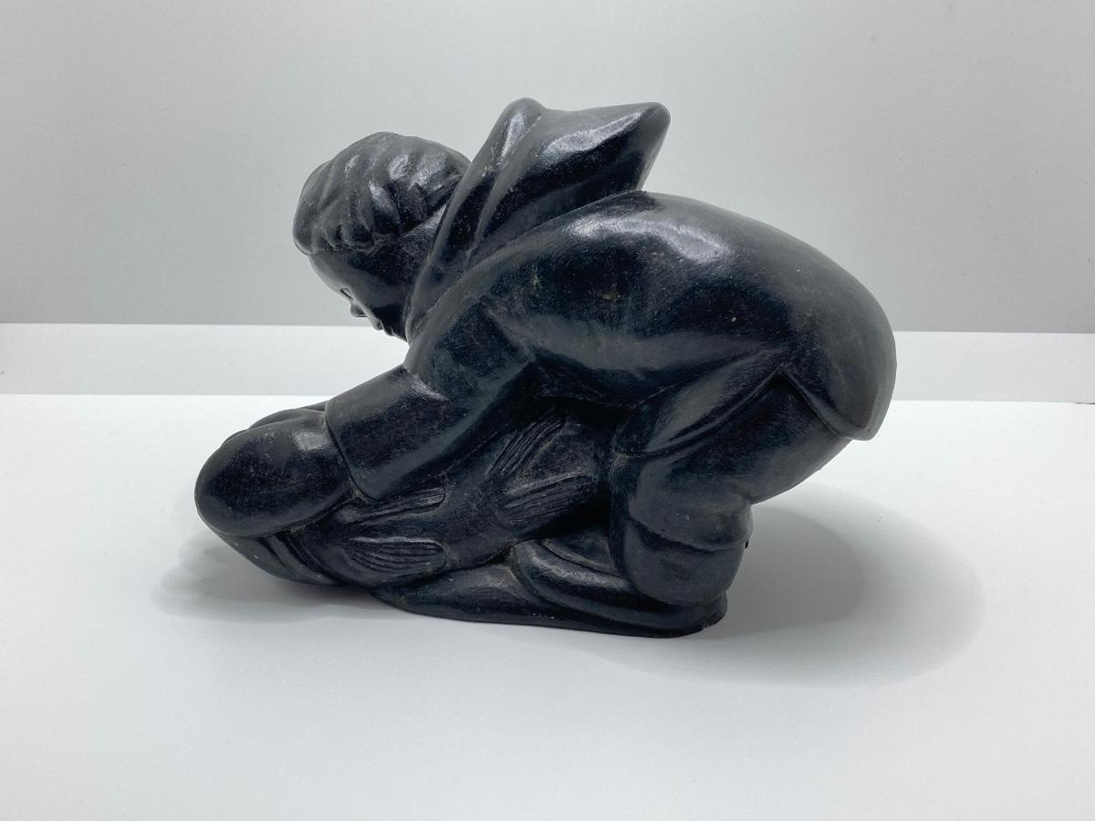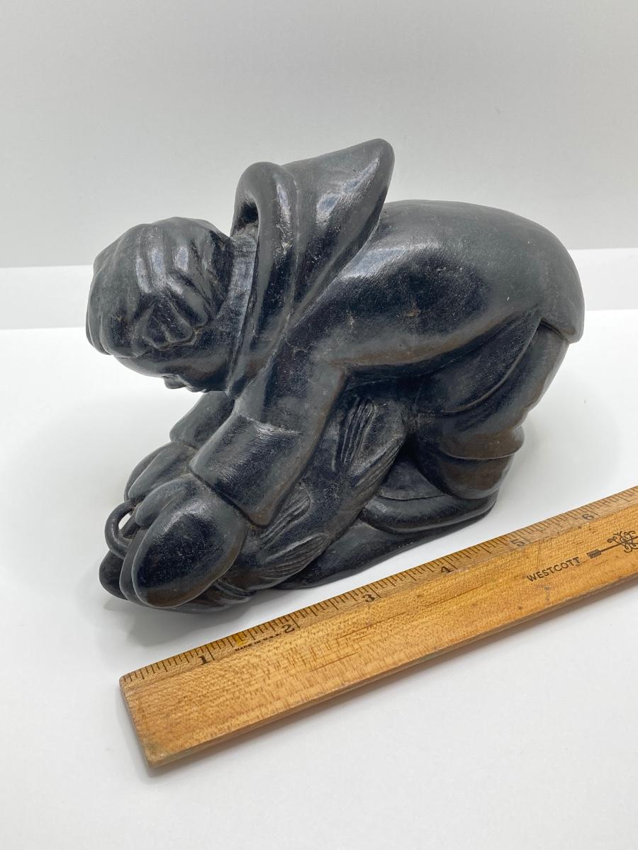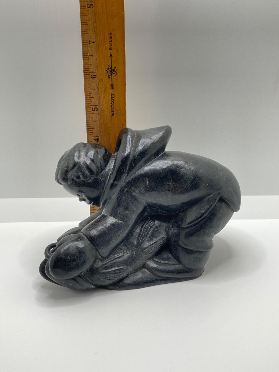 LOT 63: Carved Inuit Soapstone Art Sculpture - Boy with Fish