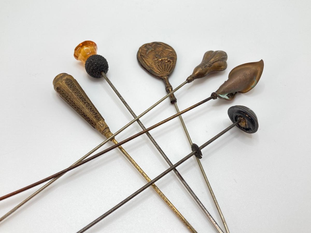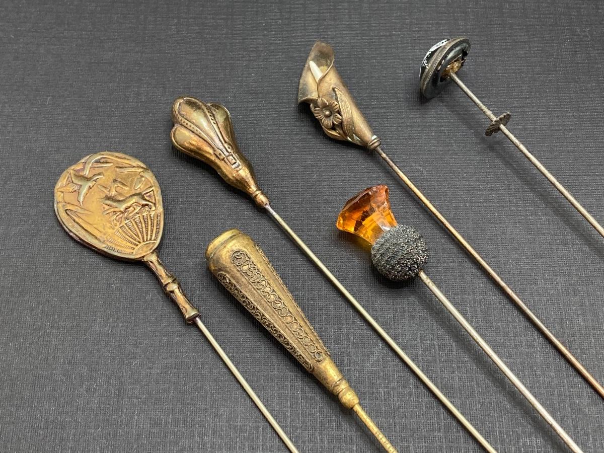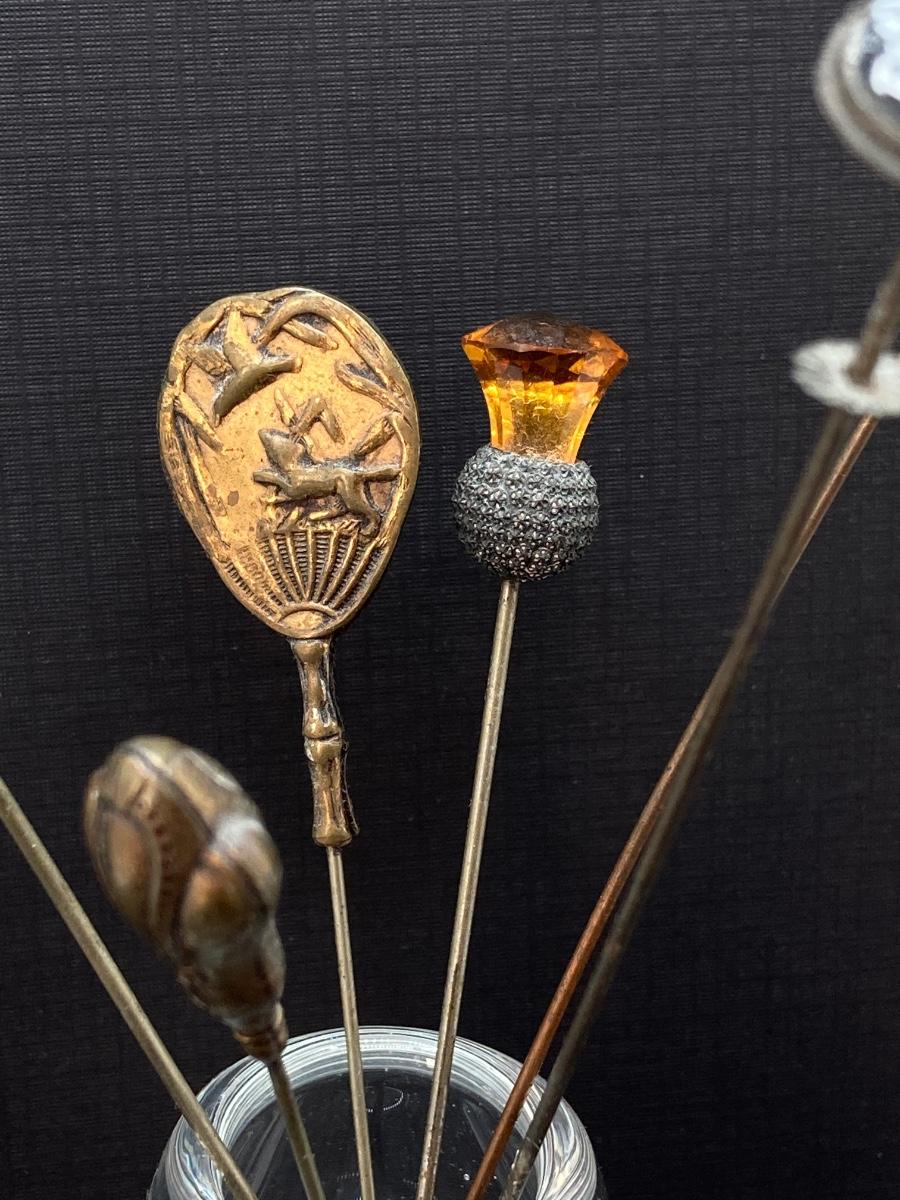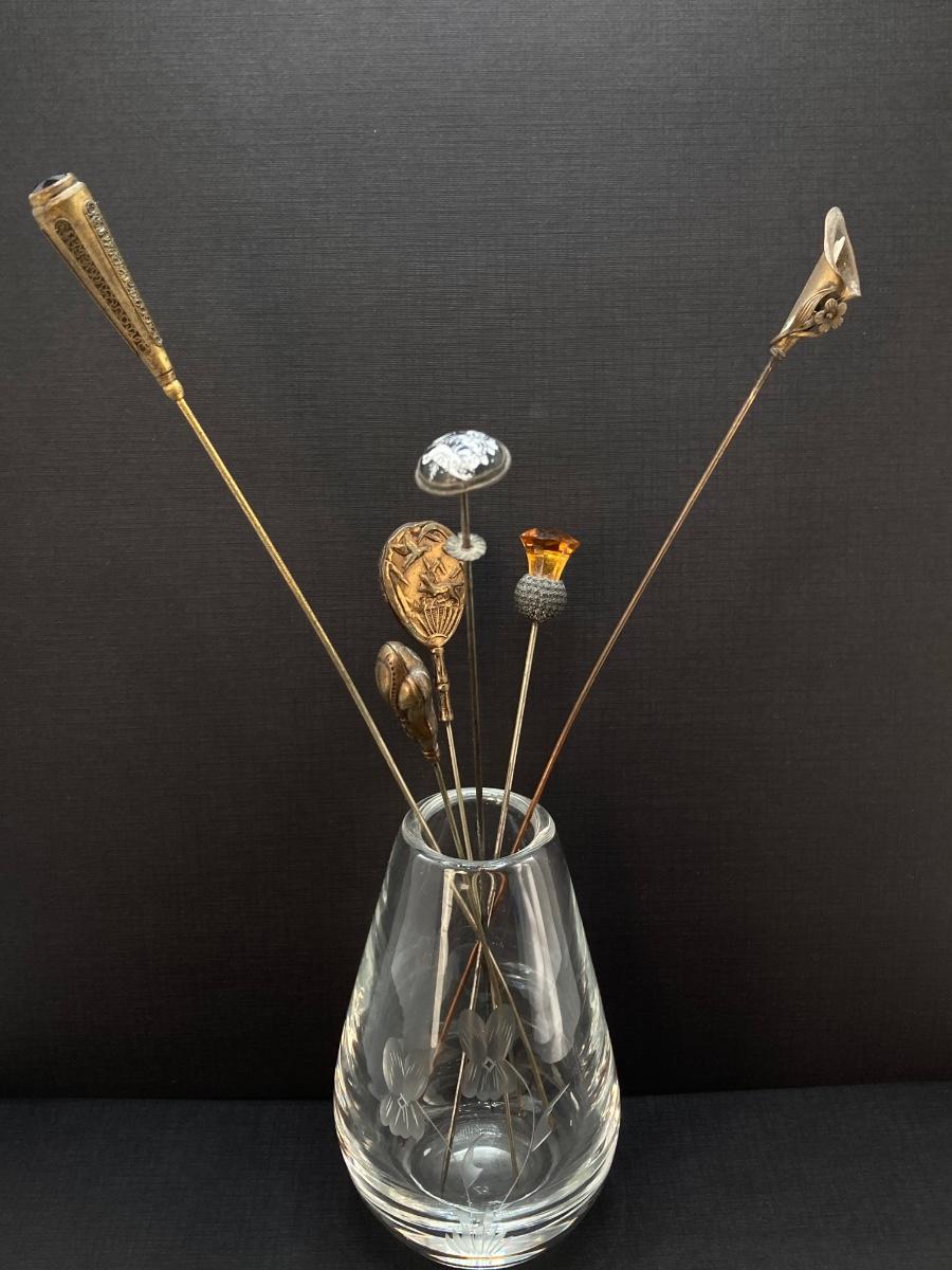 LOT 68: Vintage Hat Pin Collection with Etched Crystal Vase