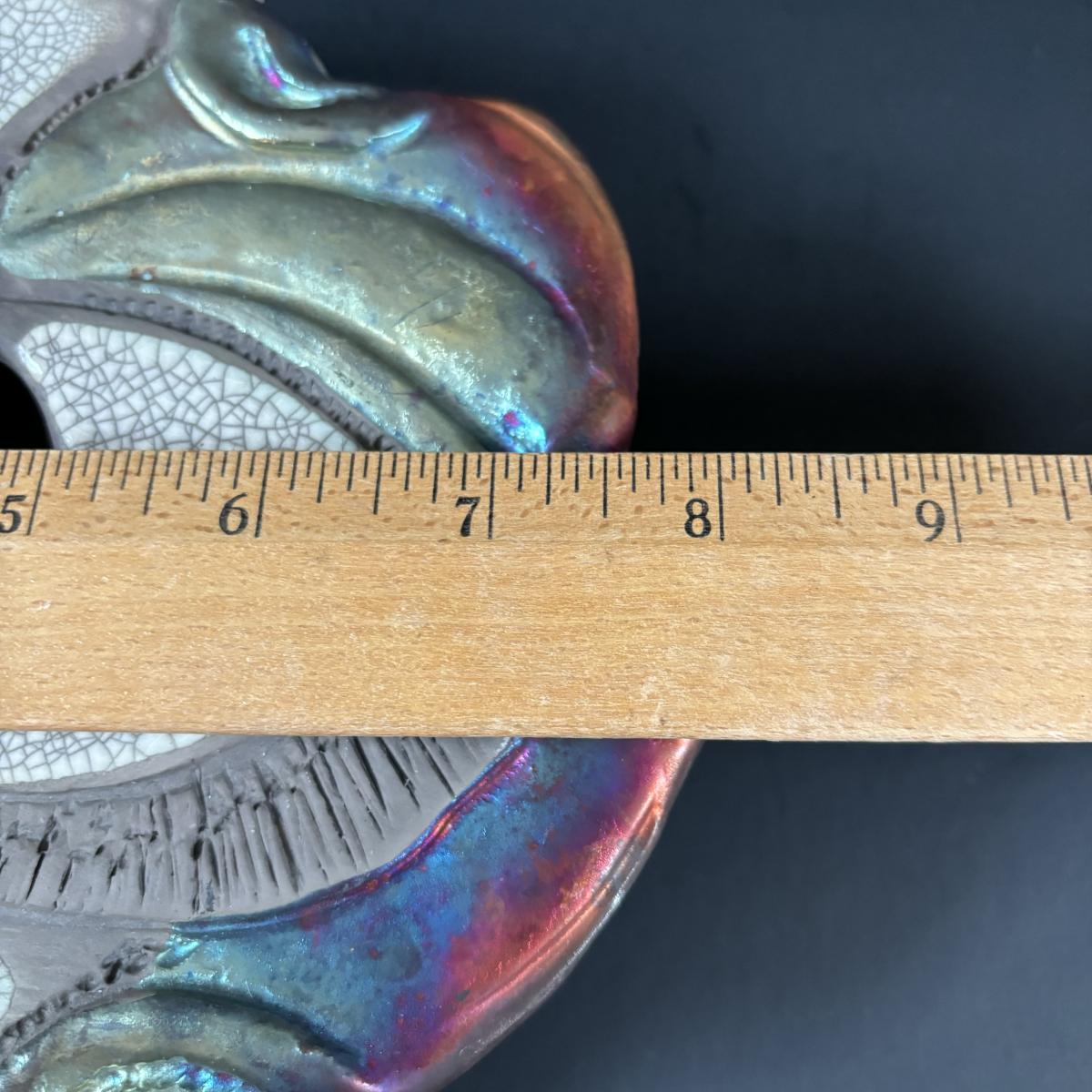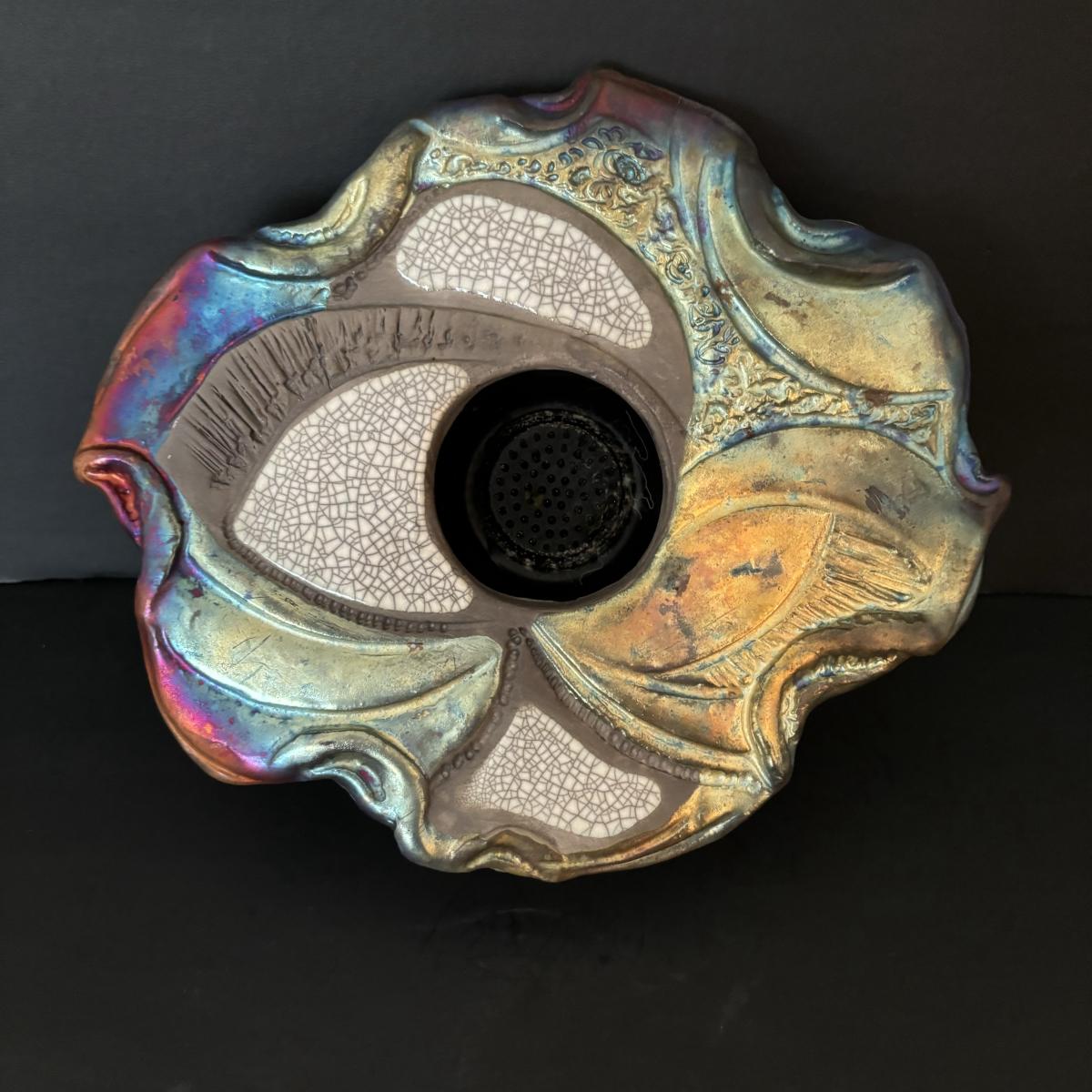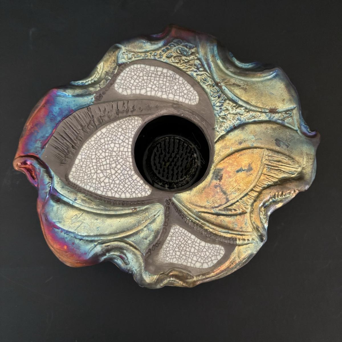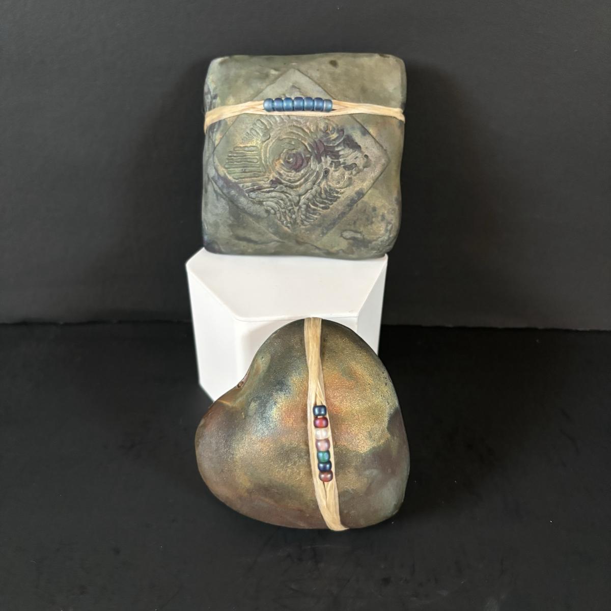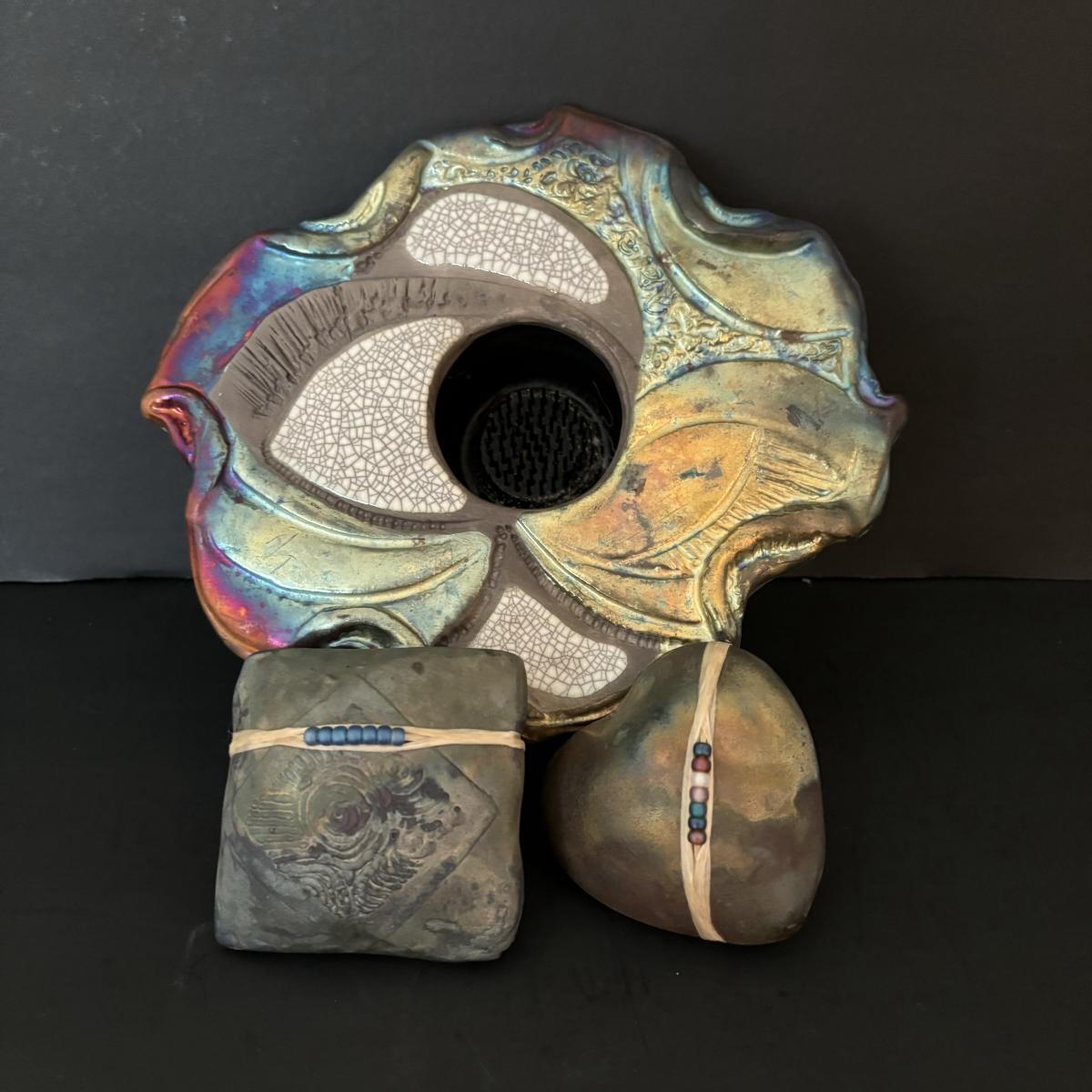 LOT 87: Raku Art Studio Pottery Floral Vasen w/Flower Frog along with Raku Square & Heart Spirit Shaker Rattles