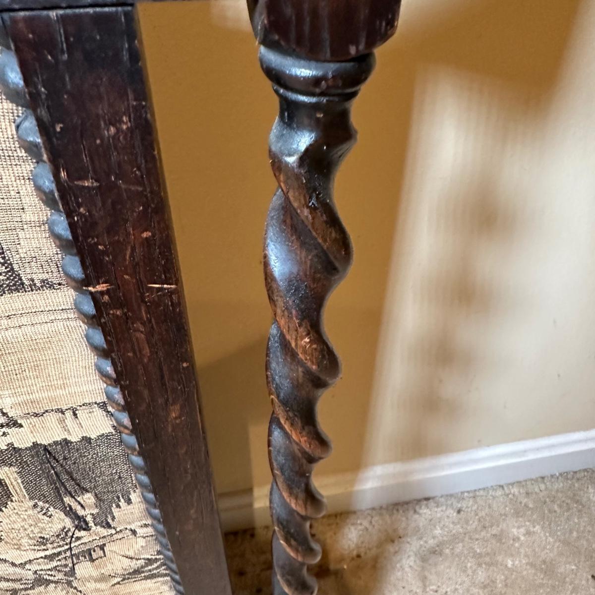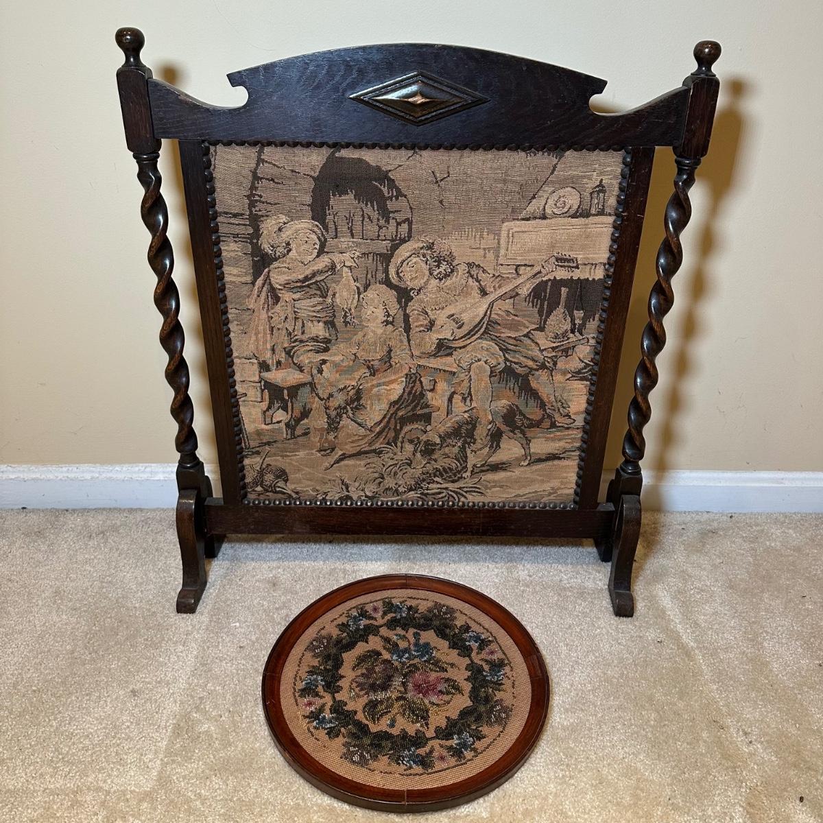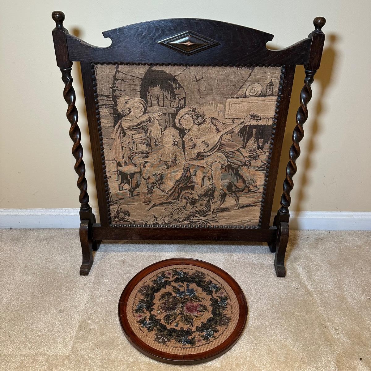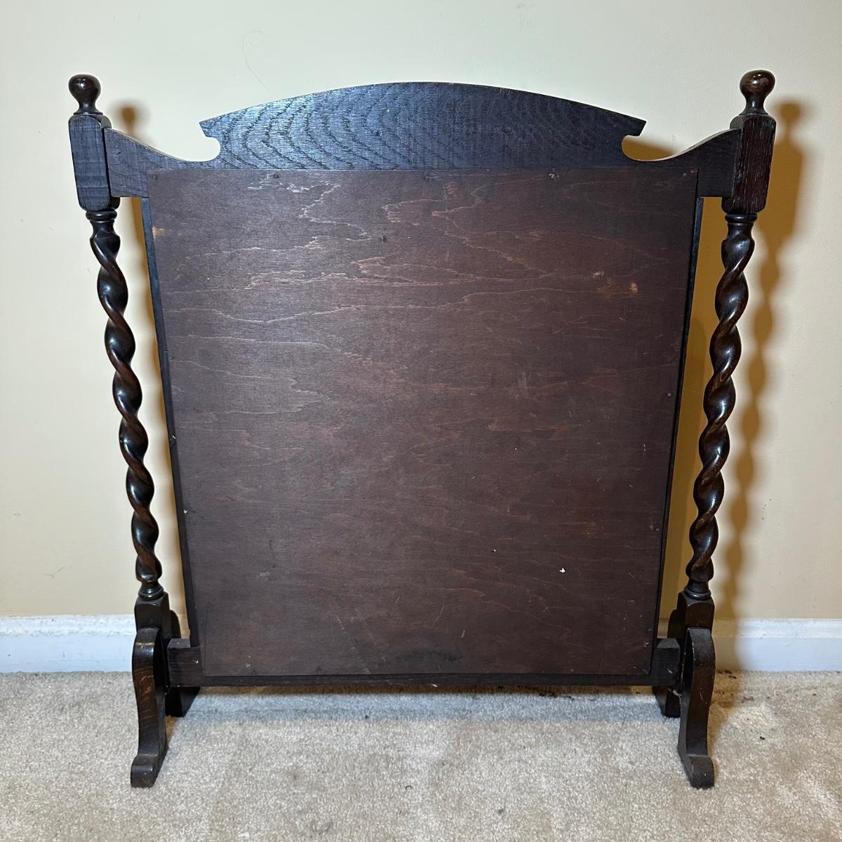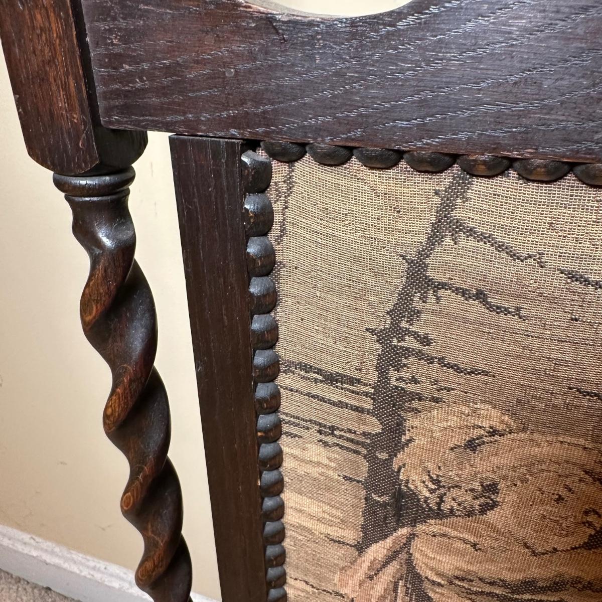 LOT 109: Barley Twist Oak Framed Tapestry Fire Screen w/ Framed Floral Beadwork Tapestry