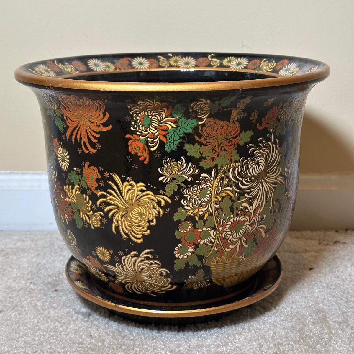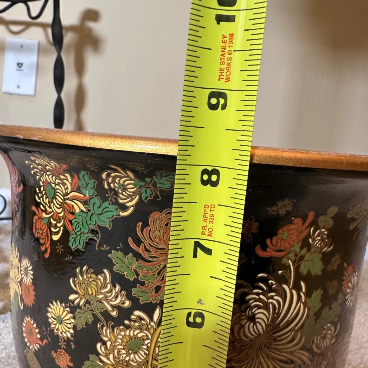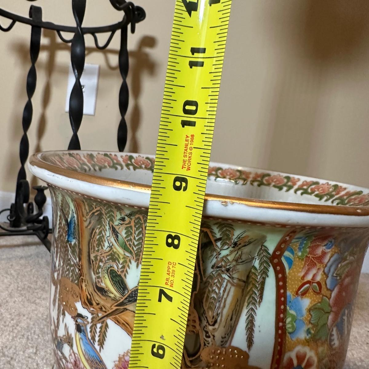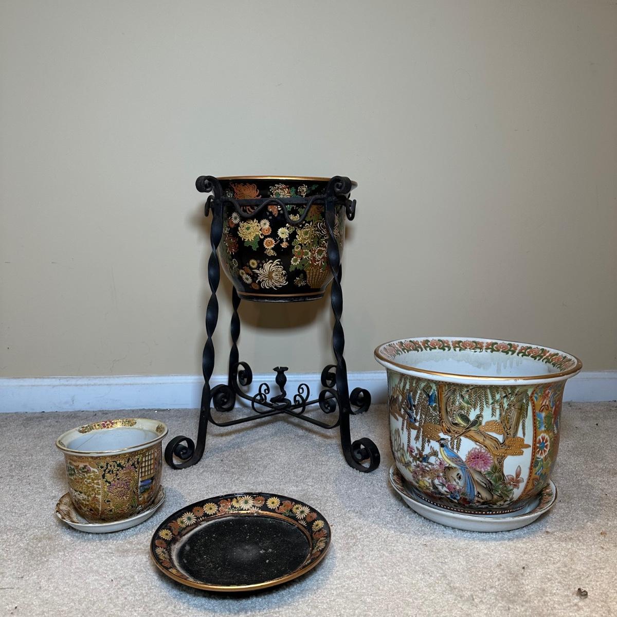 LOT 114: Vintage Asian Planters w/ Wrought Iron Plant Stand