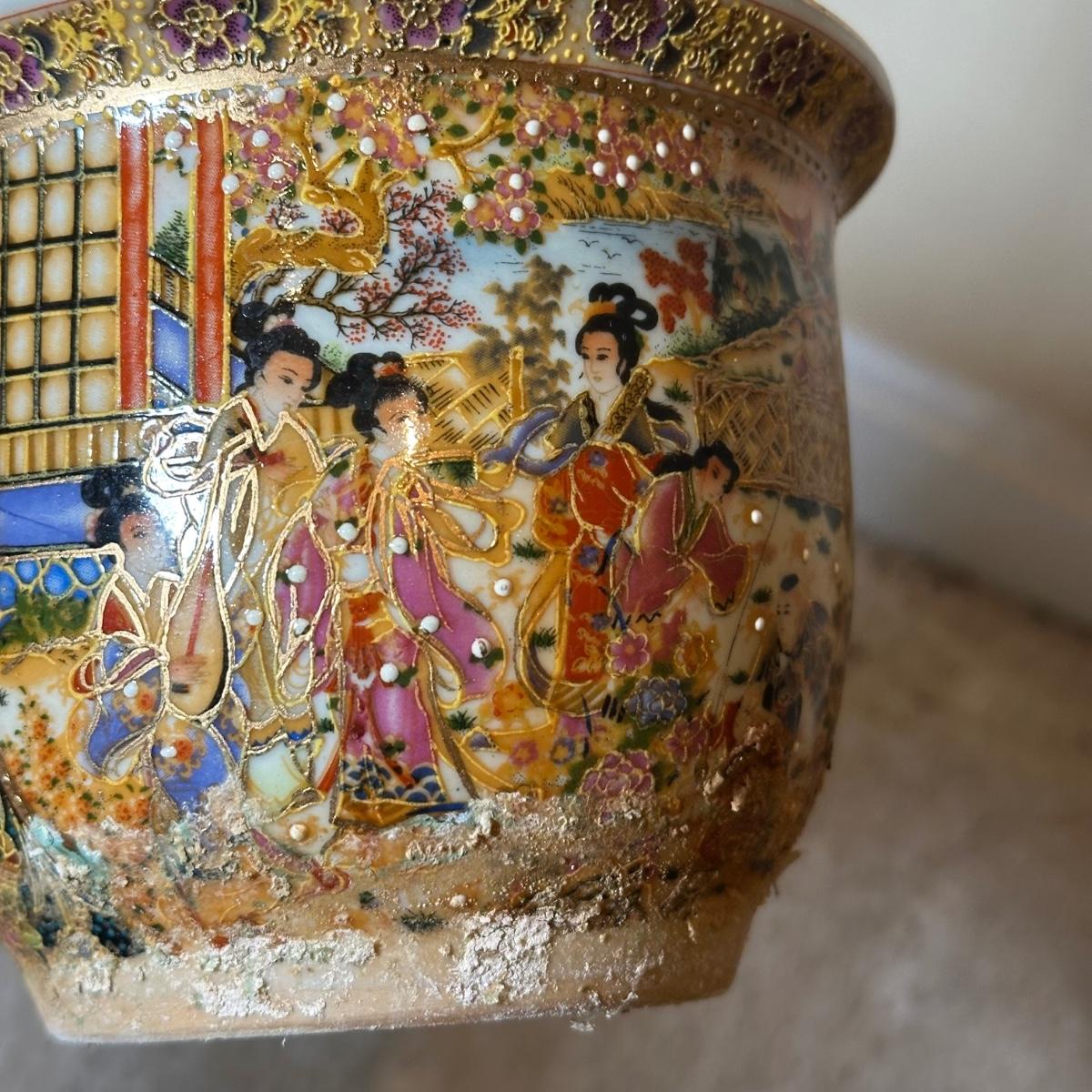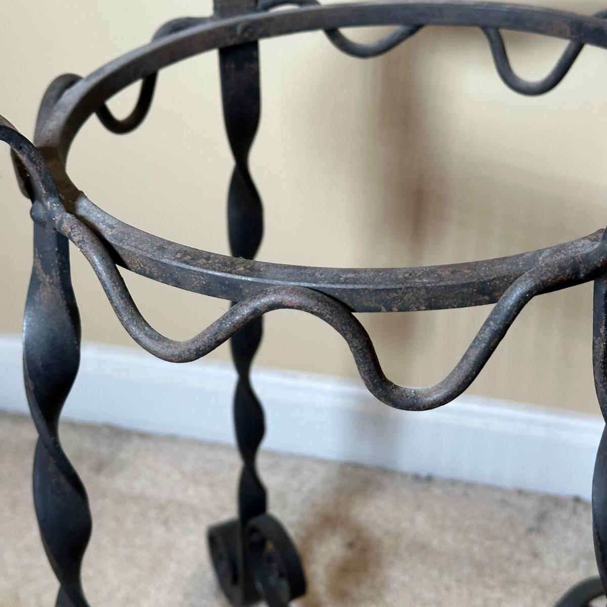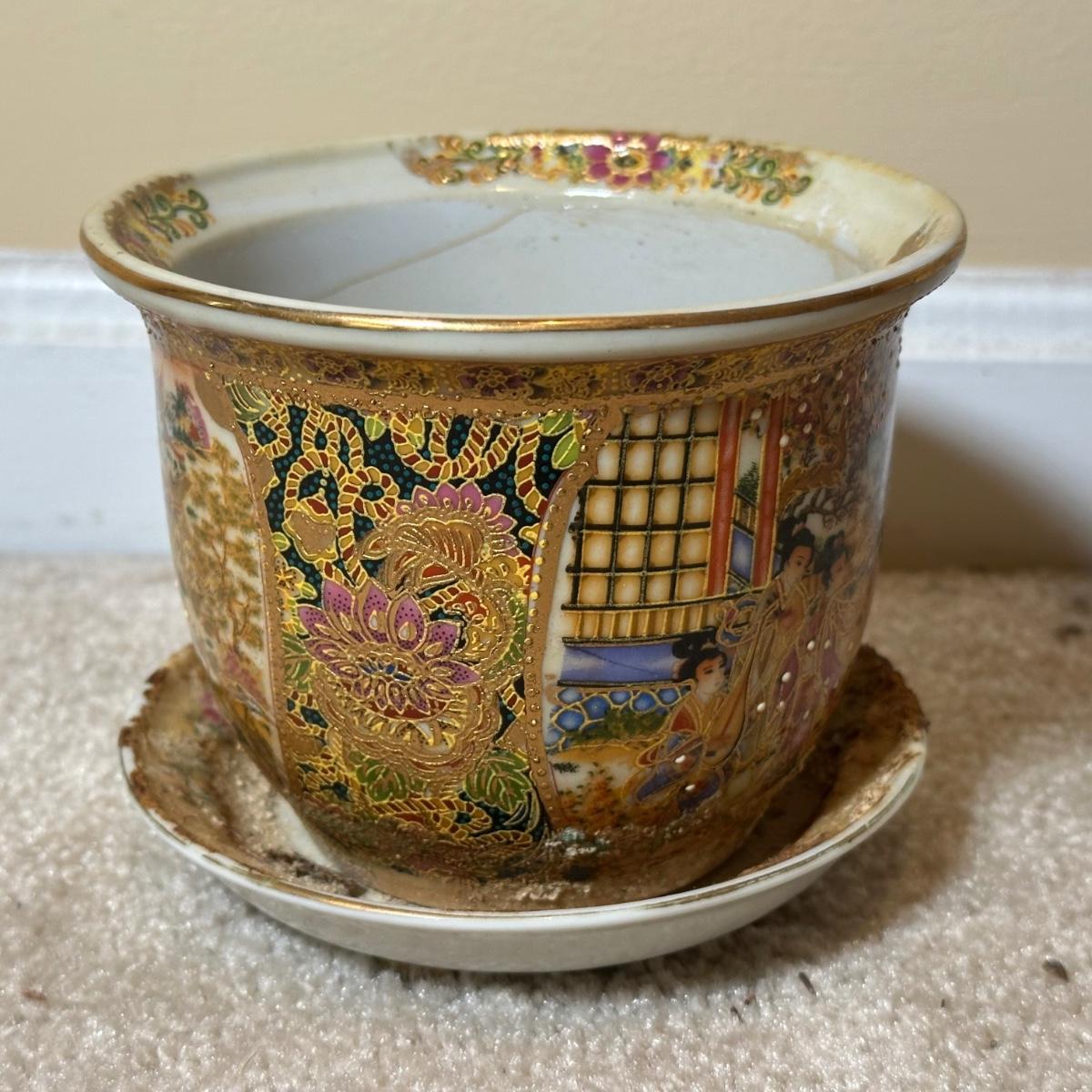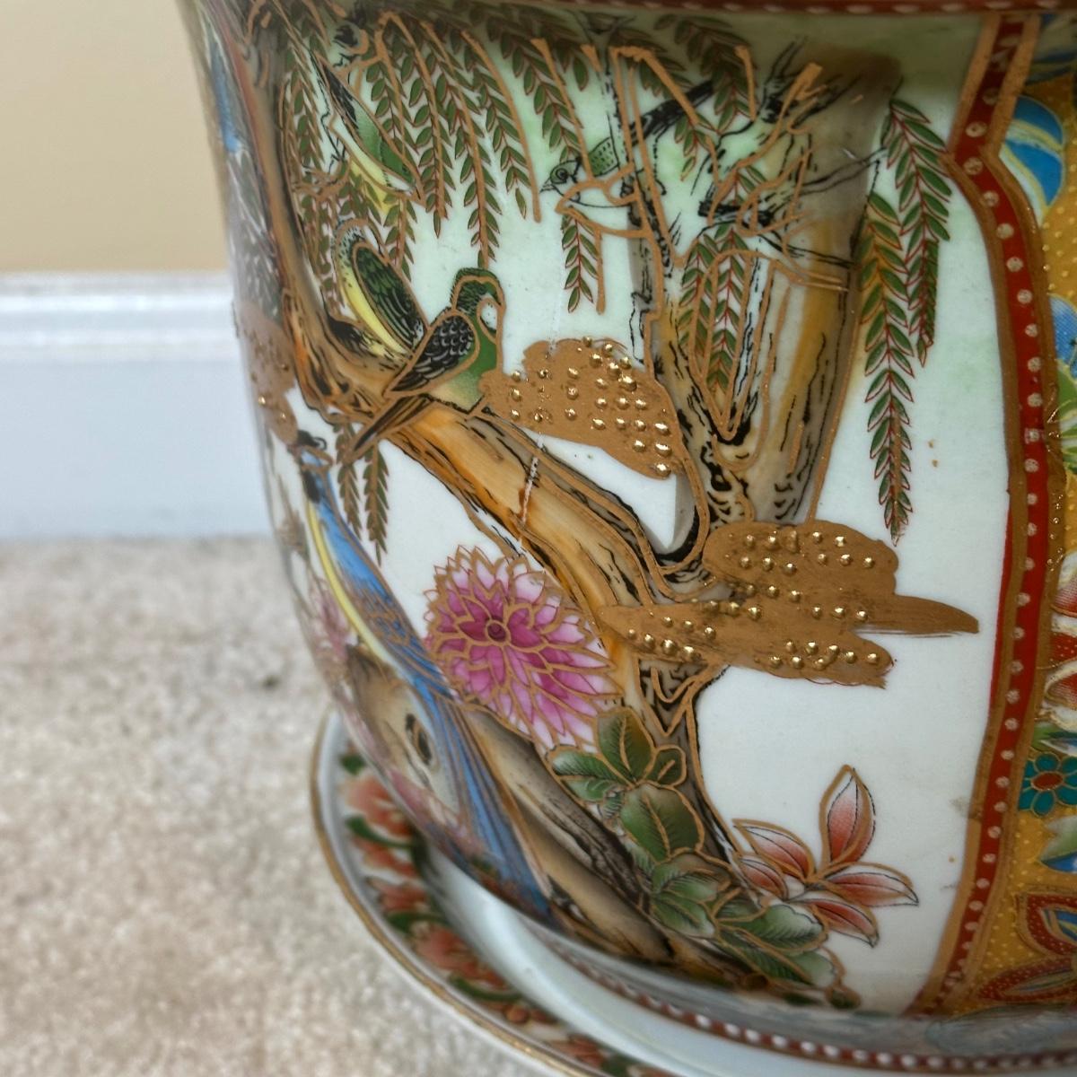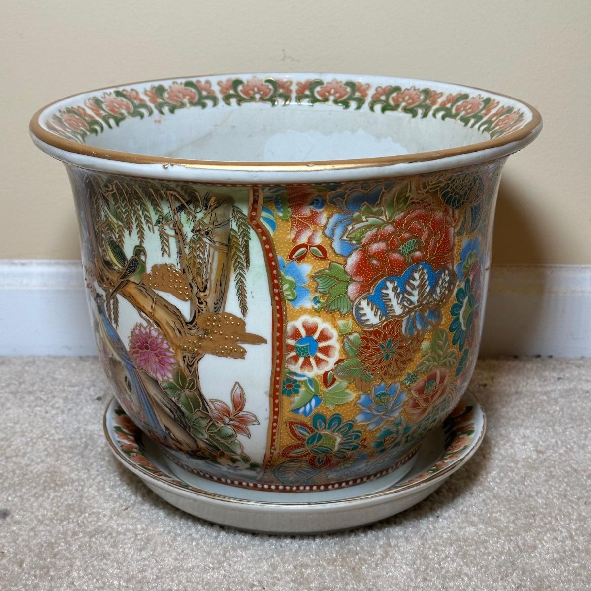 LOT 114: Vintage Asian Planters w/ Wrought Iron Plant Stand