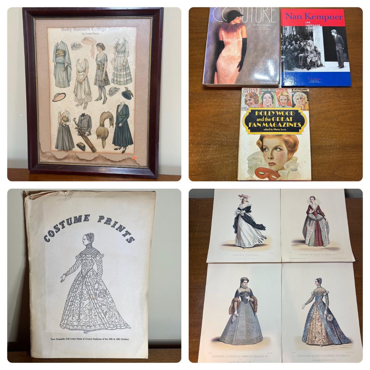 LOT 127: Vintage Costume Prints of French Fashion of the 16th & 18th Century, Framed Betty Bonnet's College Sister Paper Dolls & Books including Couture, Nan Kemper, Hollywood &The Great Fans Magazine