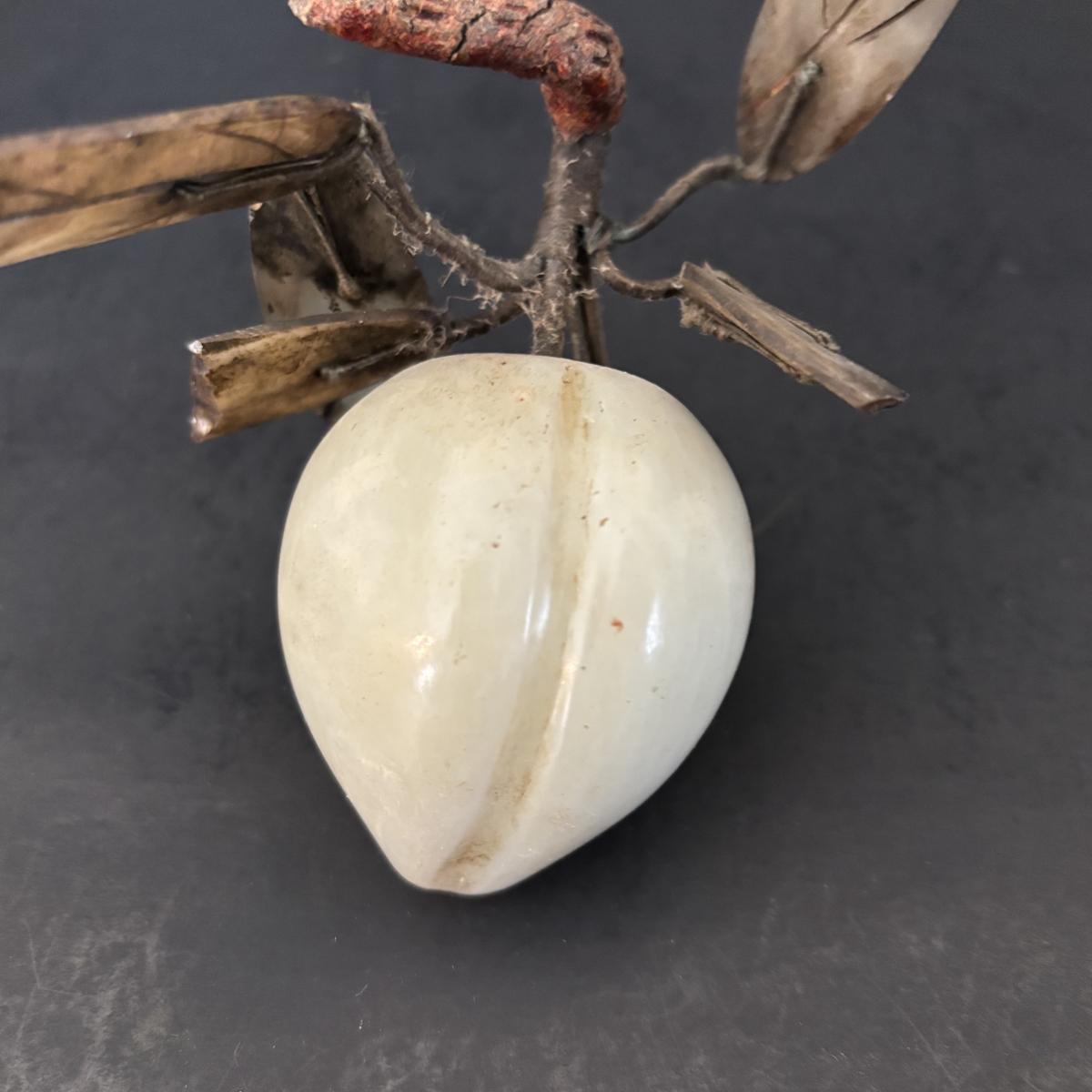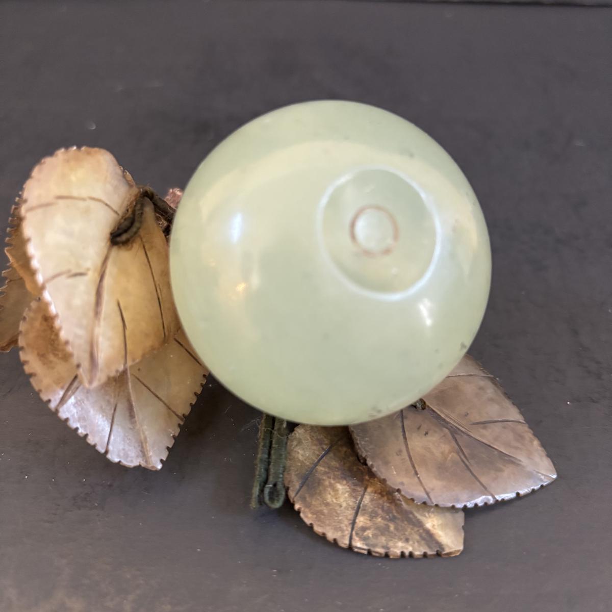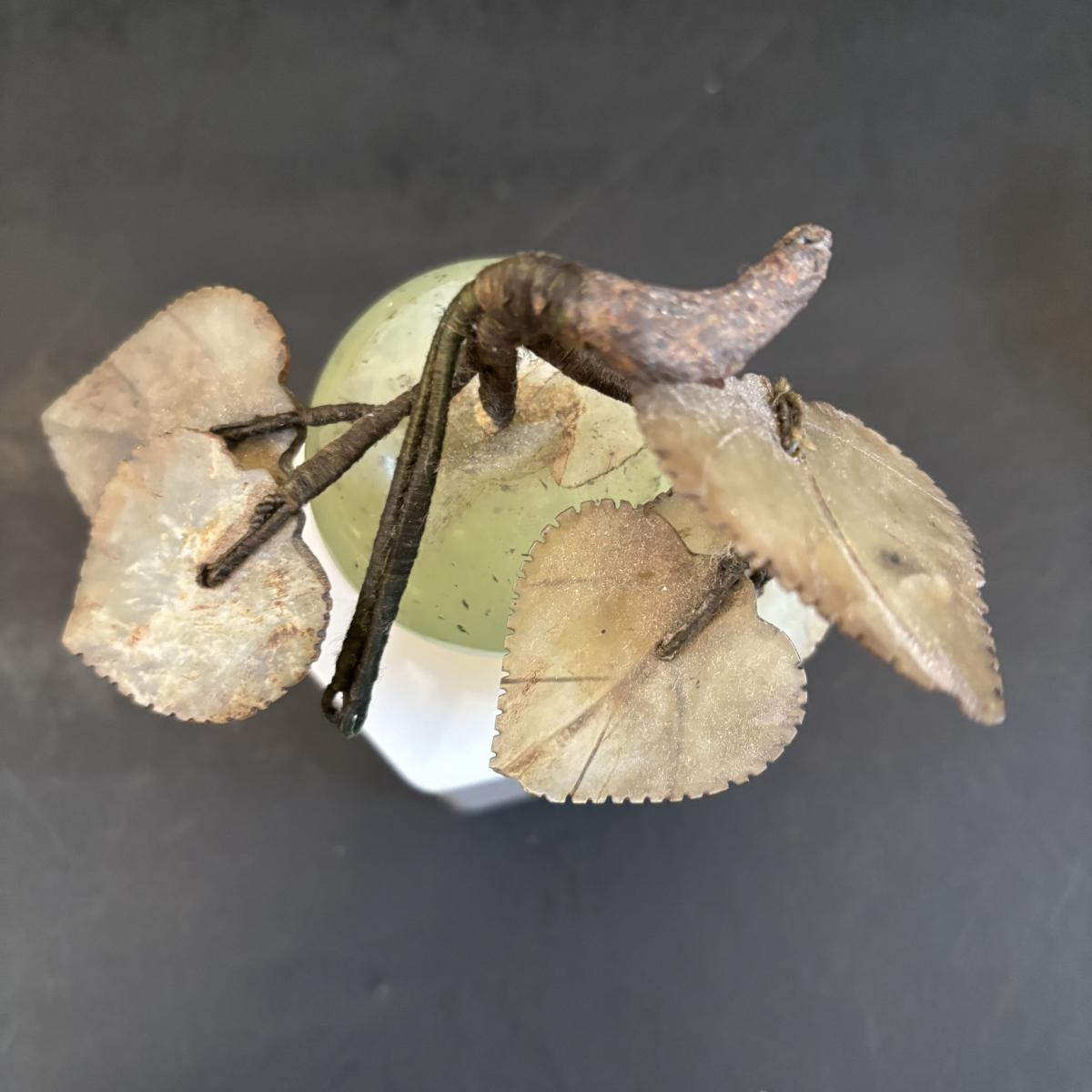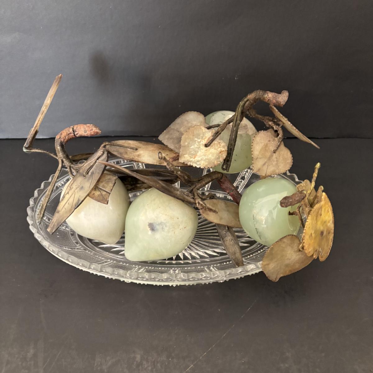 LOT 196: Vintage Green/Pale Green Jade Fruit w/Stone Leaves and MCM Pebble/Bubble Gold Glass Tray