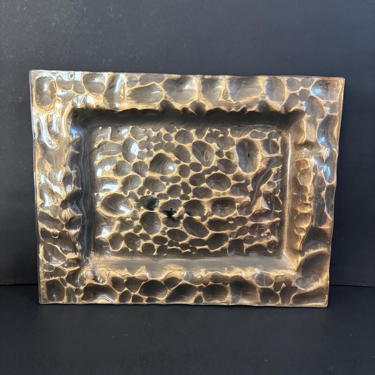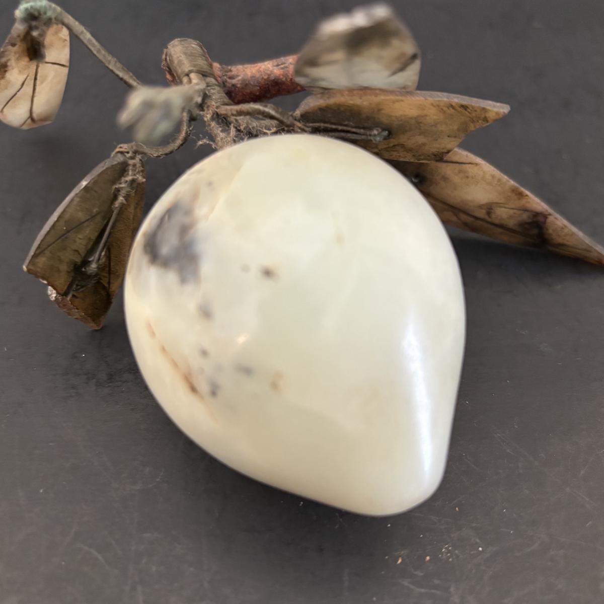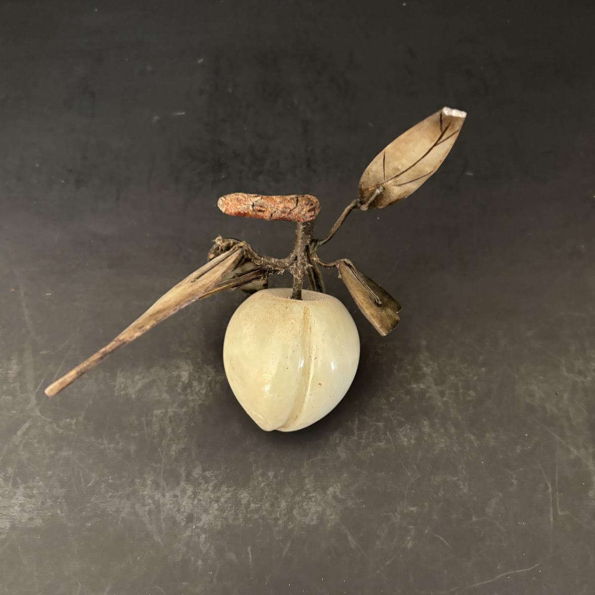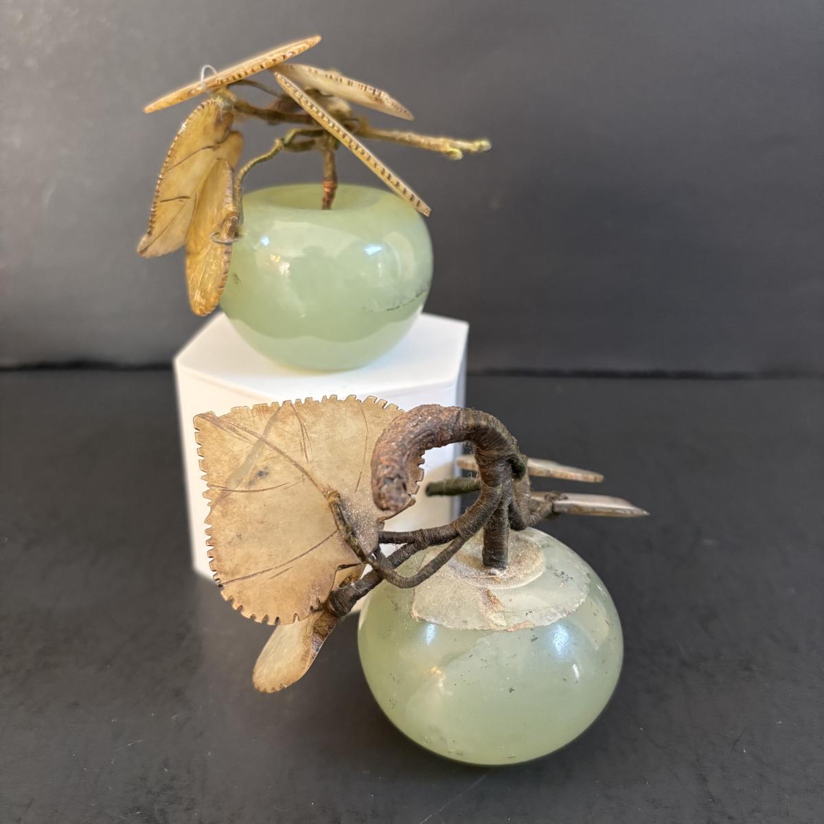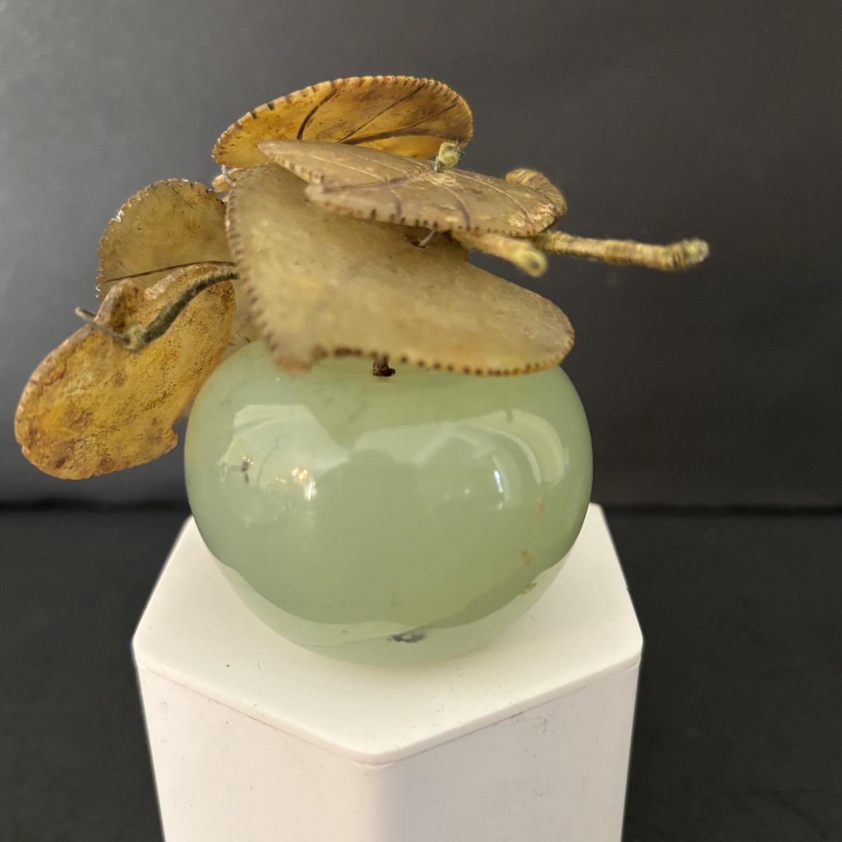 LOT 196: Vintage Green/Pale Green Jade Fruit w/Stone Leaves and MCM Pebble/Bubble Gold Glass Tray