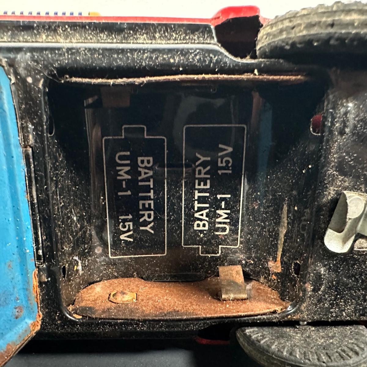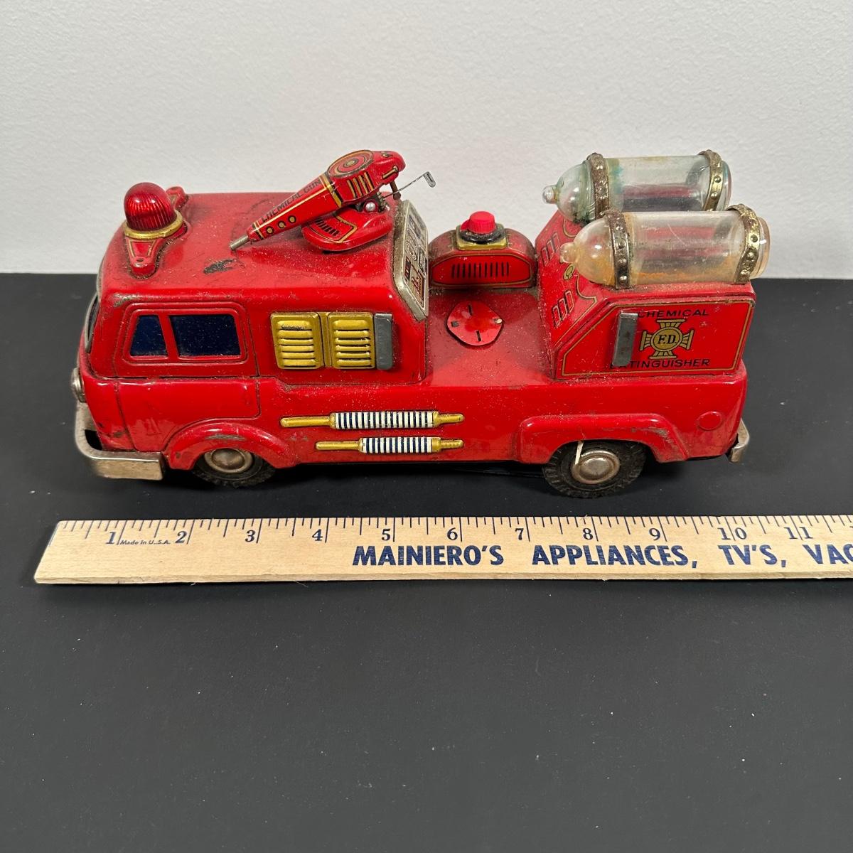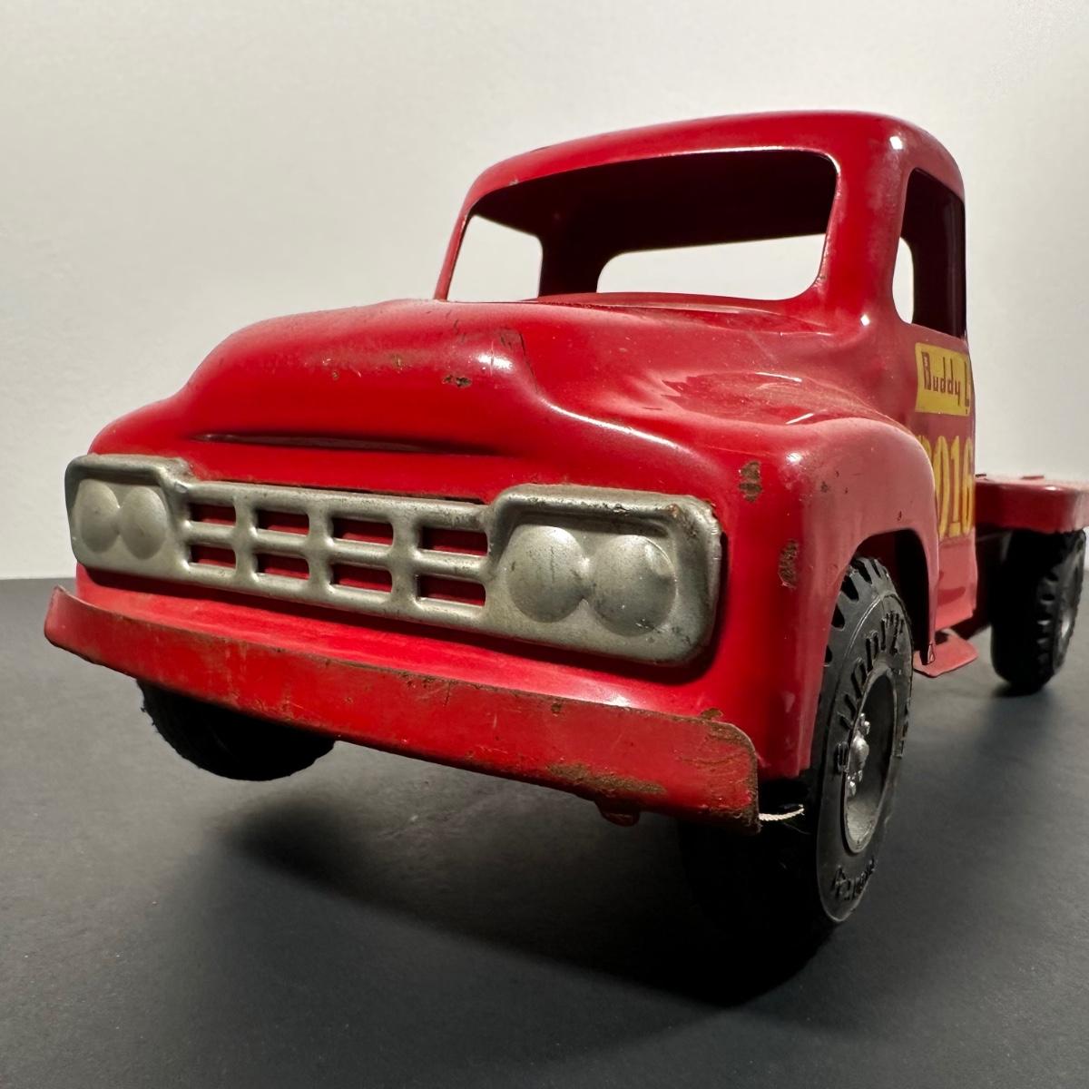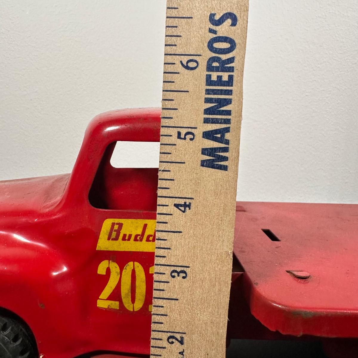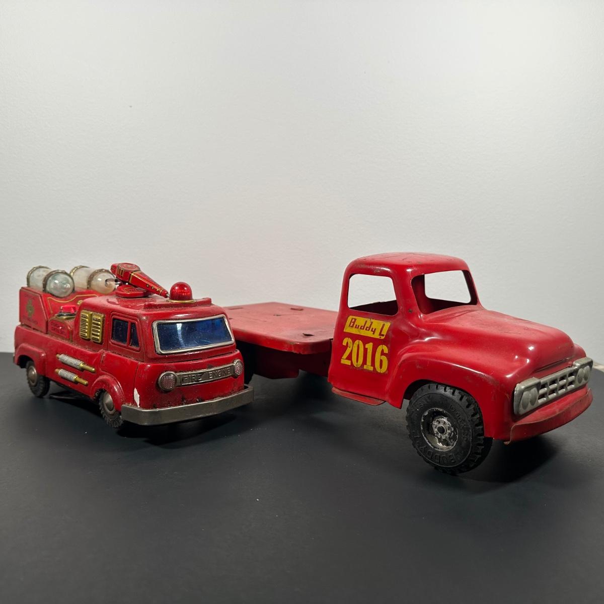 LOT 9L: Vintage 1950s Buddy L Toy Flatbed Truck & Tin Battery Operated Chemical Fire Engine