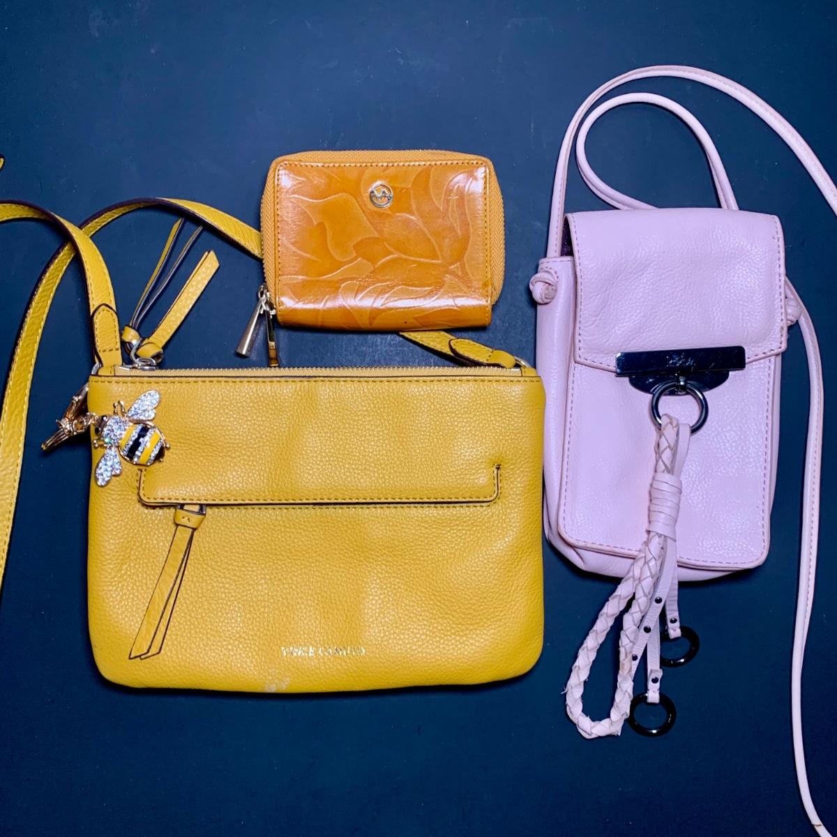 LOT 22 L: Valentina Italian Leather Card Wallet, Koba Pink Leather Cross Body Phone Bag, & Vince Camuto Canary Yellow Pebbled Leather Double Zipper Gally Cross Body Purse