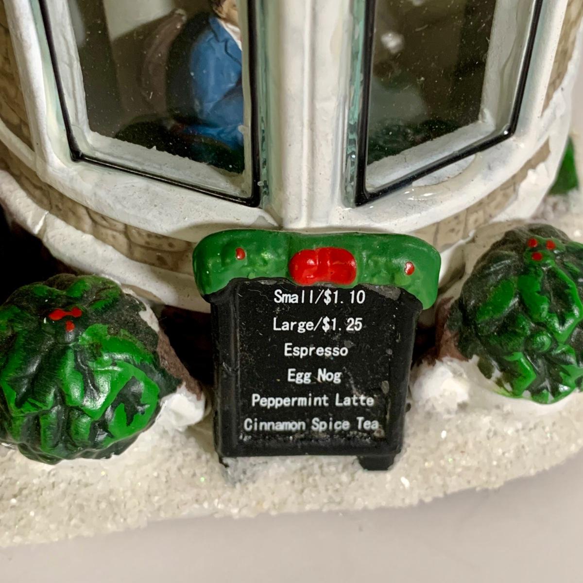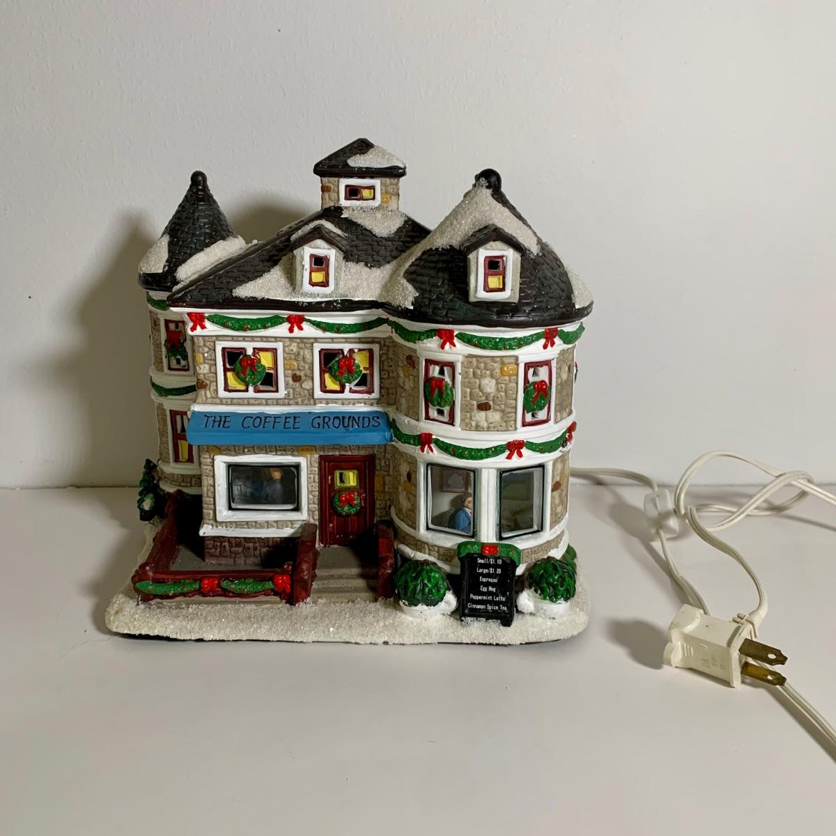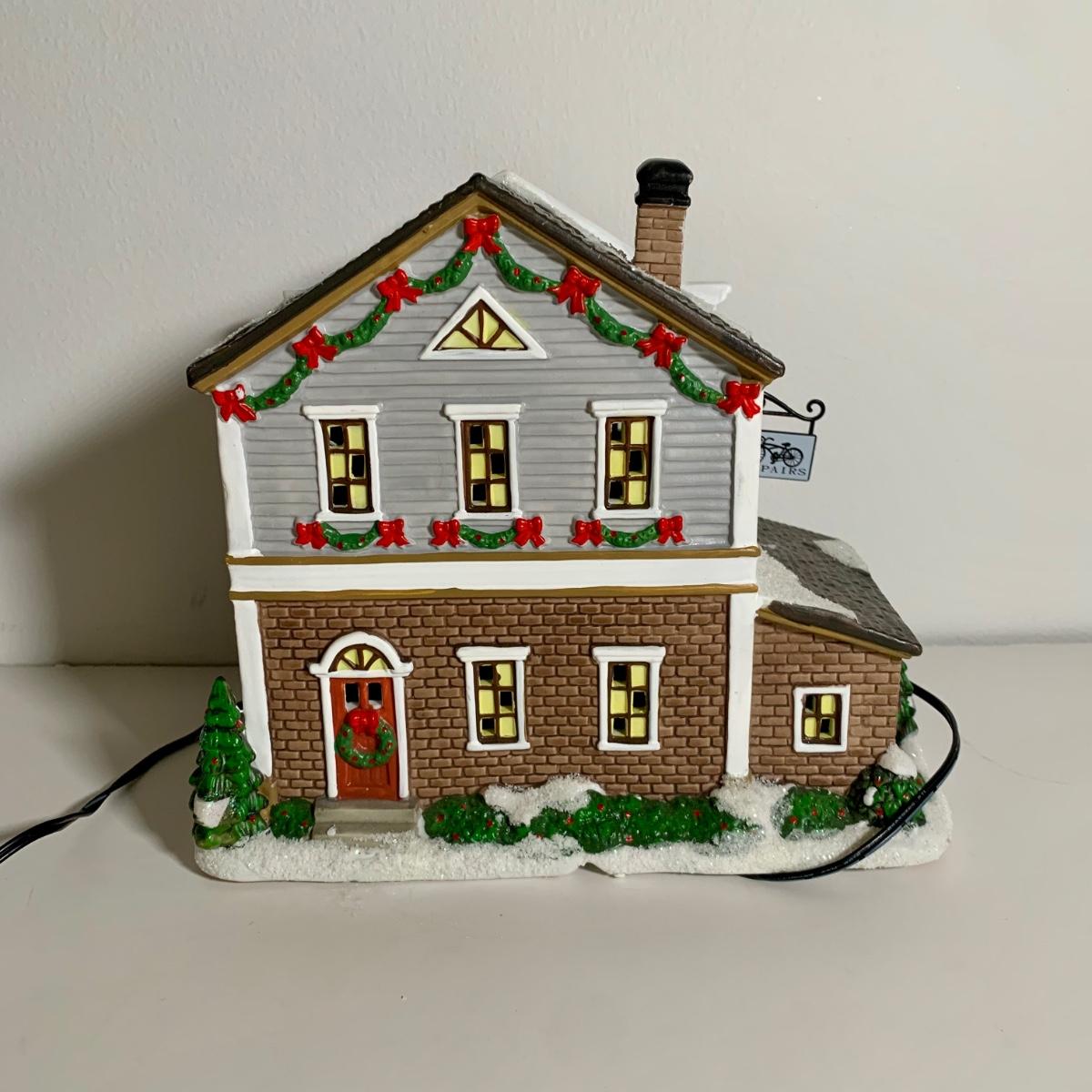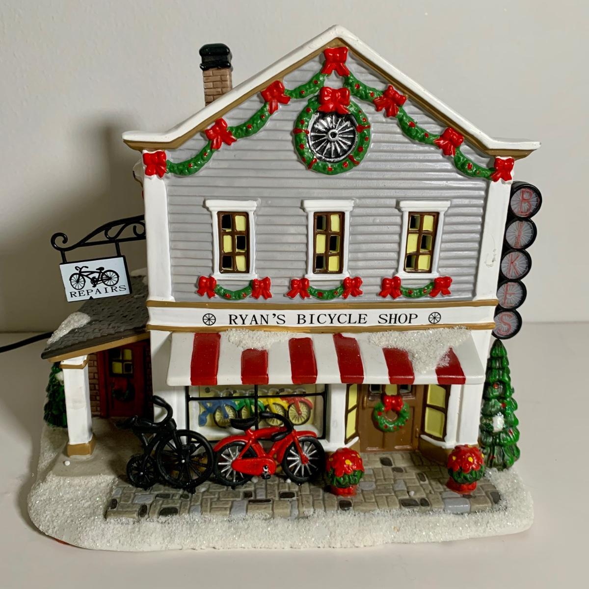LOT 25 L: St. Nicholas Square Illuminated 2009 "Ryan's Bicycle Shop", 2010 "The Coffee Grounds", Department 56 1992 "Post Office", & 1998 "Custom Stitchers"