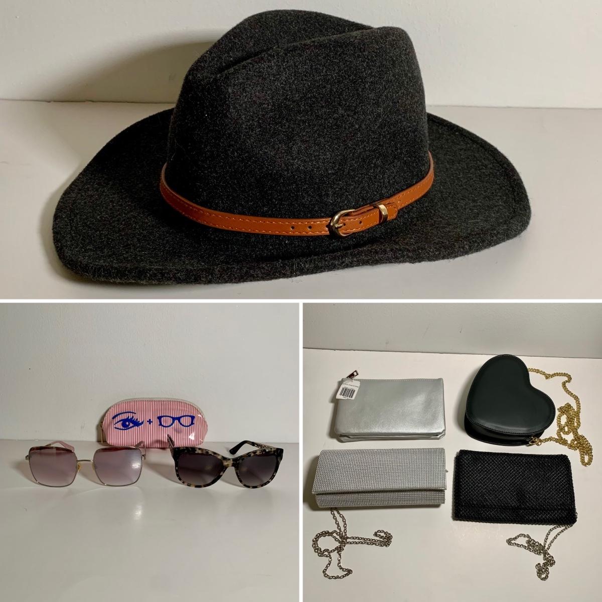 LOT 27 L: Kate Spade "Harlee" Pink Sunglasses, INC Black Bead Bag, NWT Indigo Soul Silver Bag, & More
