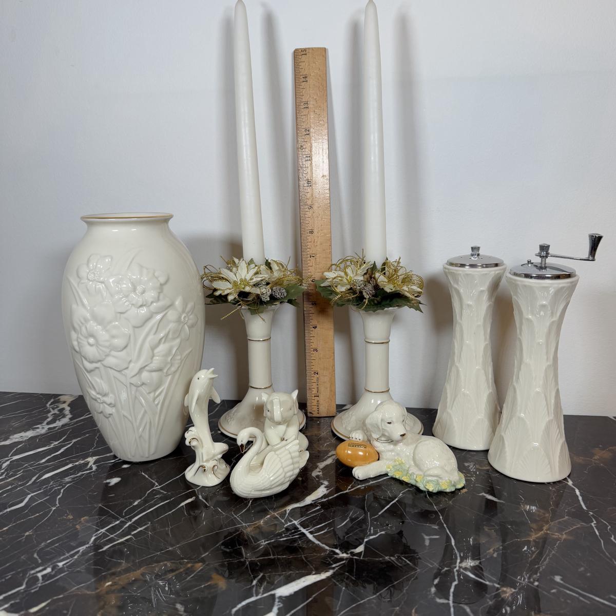 LOT 52D: Lenox Collection - Woodland S&P, Dog w/ Football, Narcissus Flower Vase, Candle Sticks & Animal Set