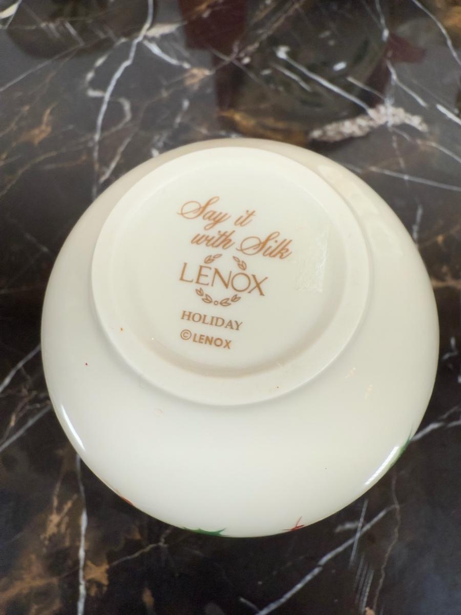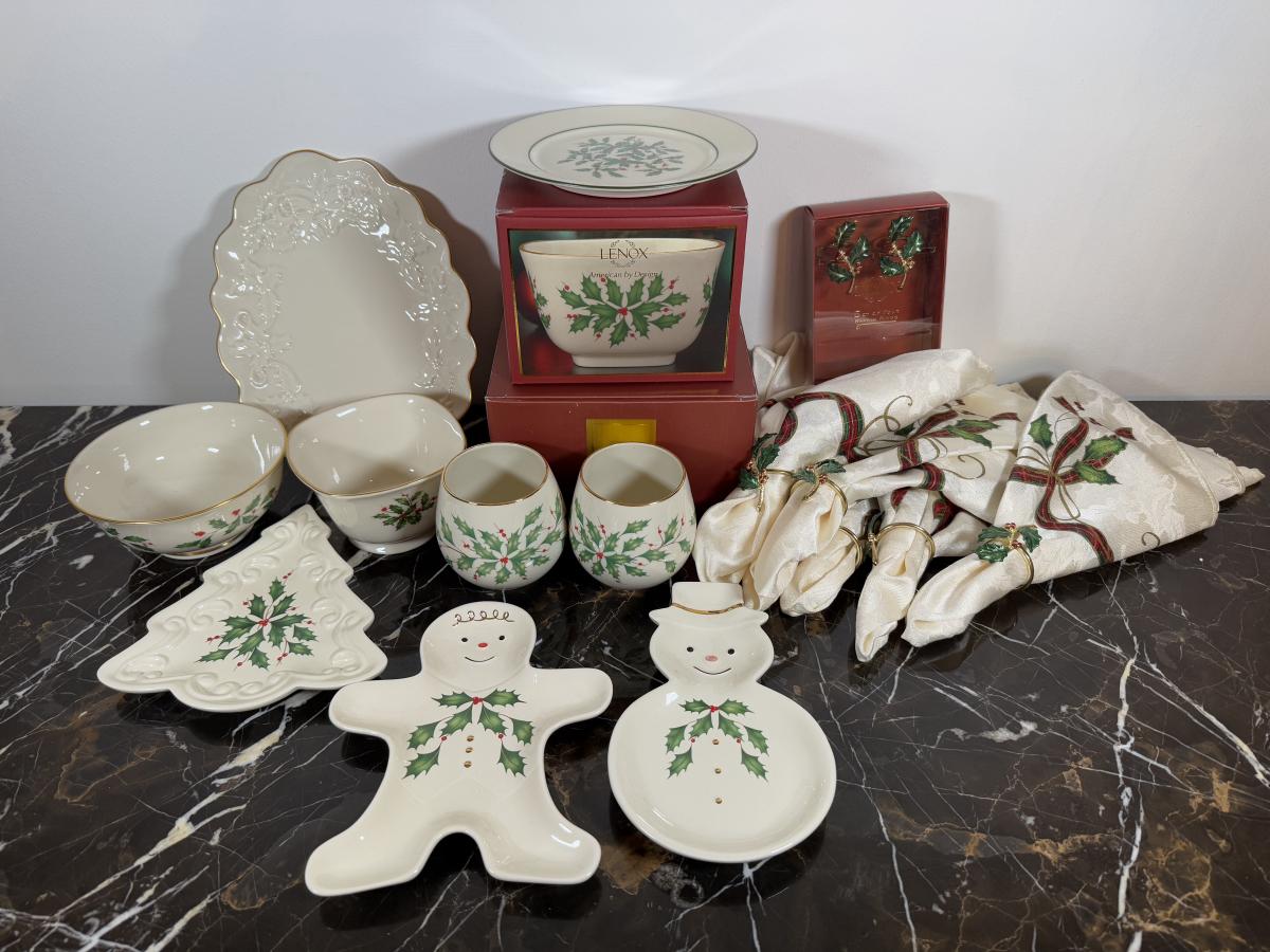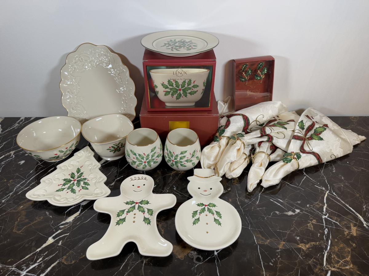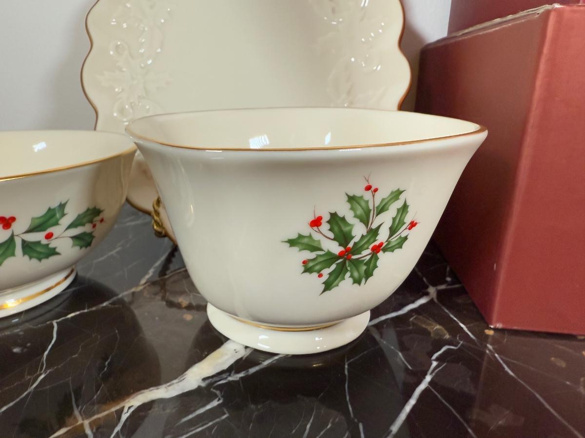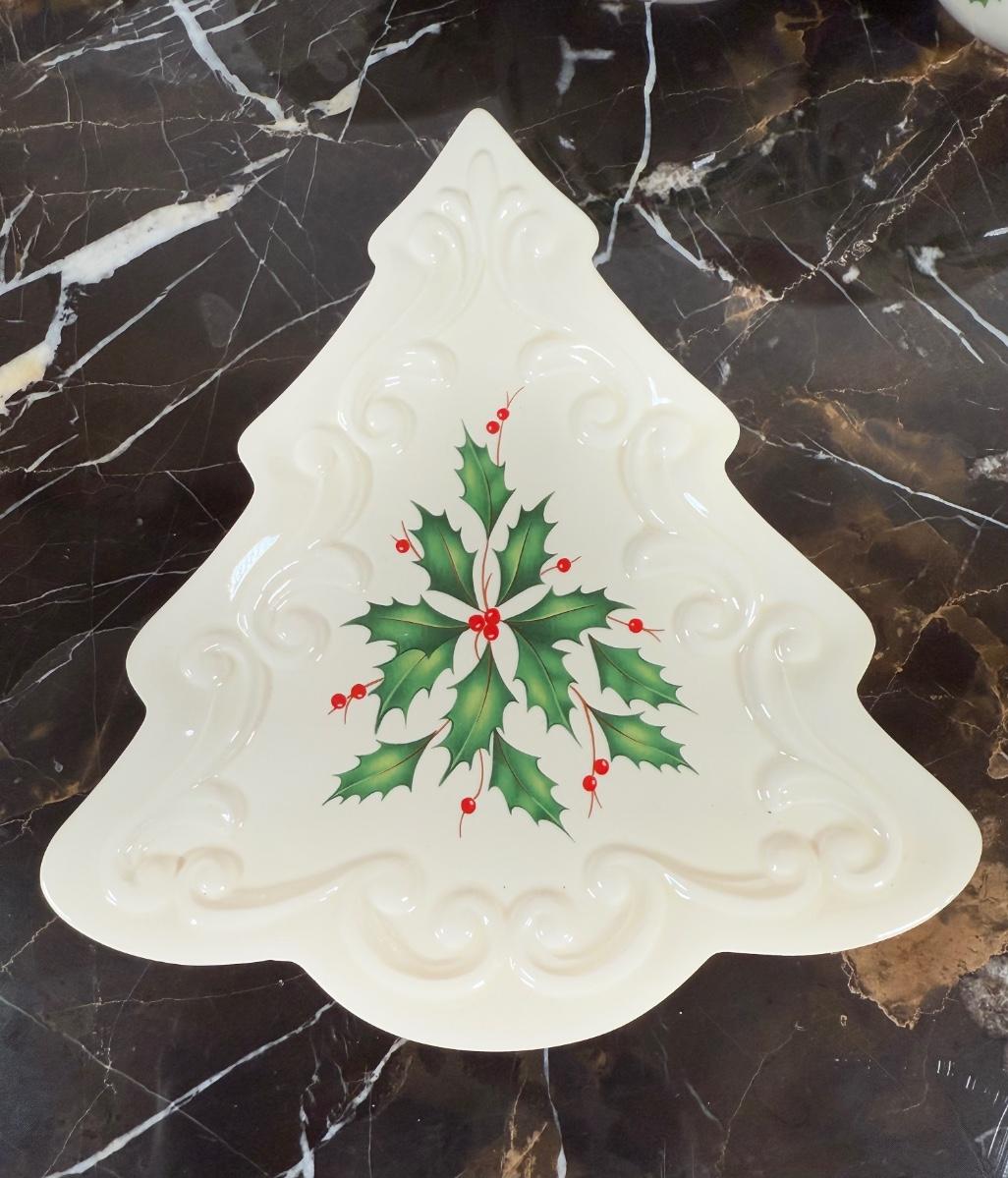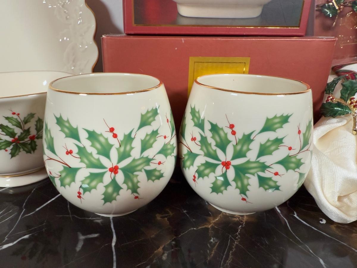 LOT 53D: Lenox Holiday Hostess Dish, Special Plate, Say it With Silk Cups, Holly Bowls & Shaped Treat Trays