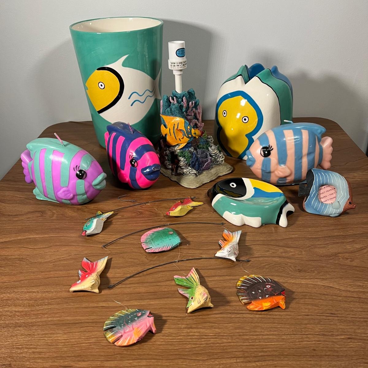 LOT 88L: Nautical Fish-Themed Home Decor Collection - Bathroom Set, Candles, Mobile, Lamp