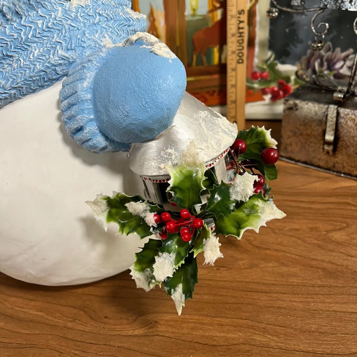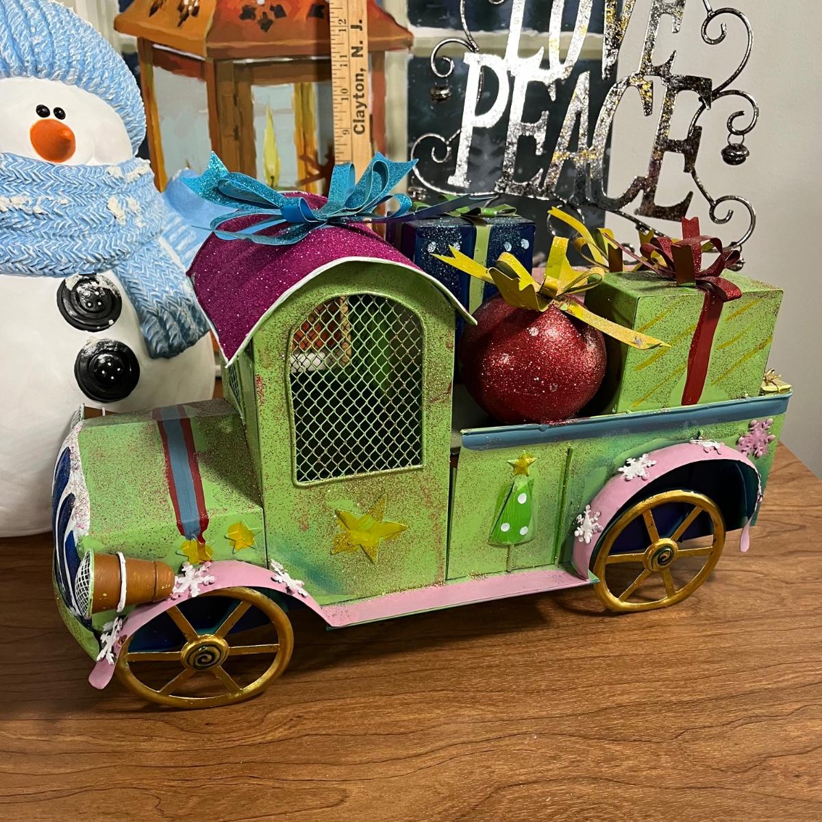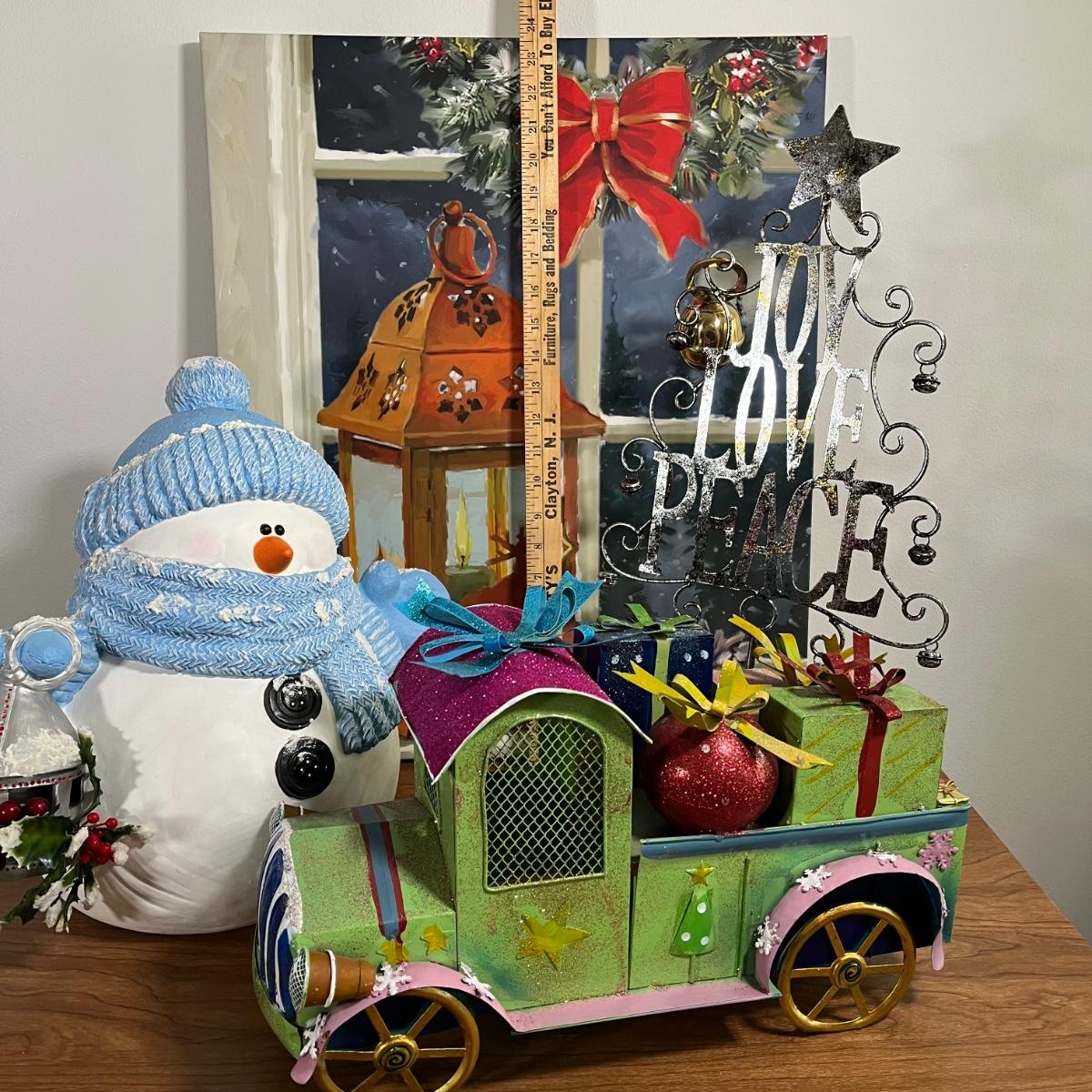 LOT 95L: Christmas Decorations - Metal Truck, Ceramic Snowman, LED Light-Up Picture and More