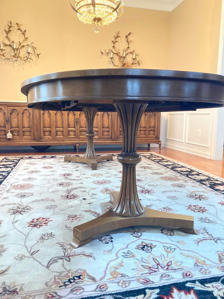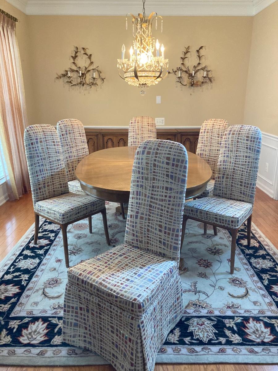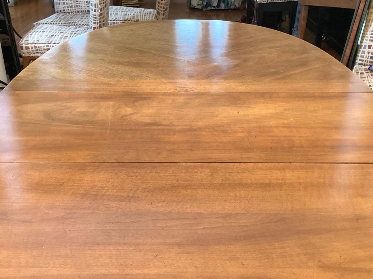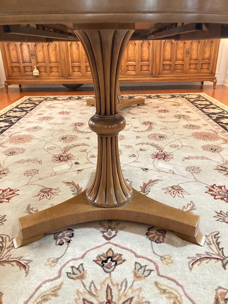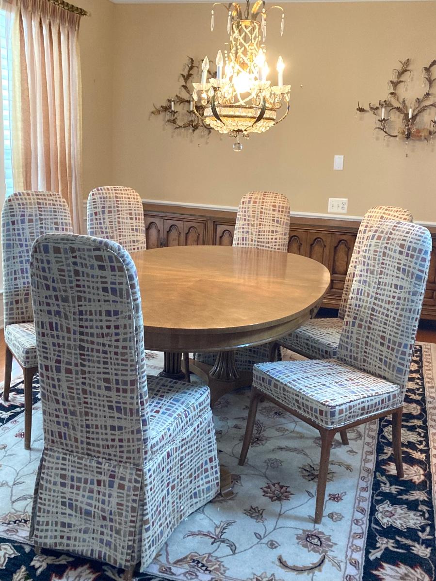 LOT 244: Vintage Double Pedestal Dining Room Table with Two Leafs, Table Pads and Six Upholstered Chairs