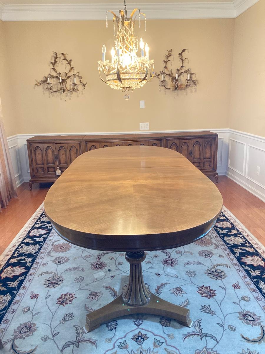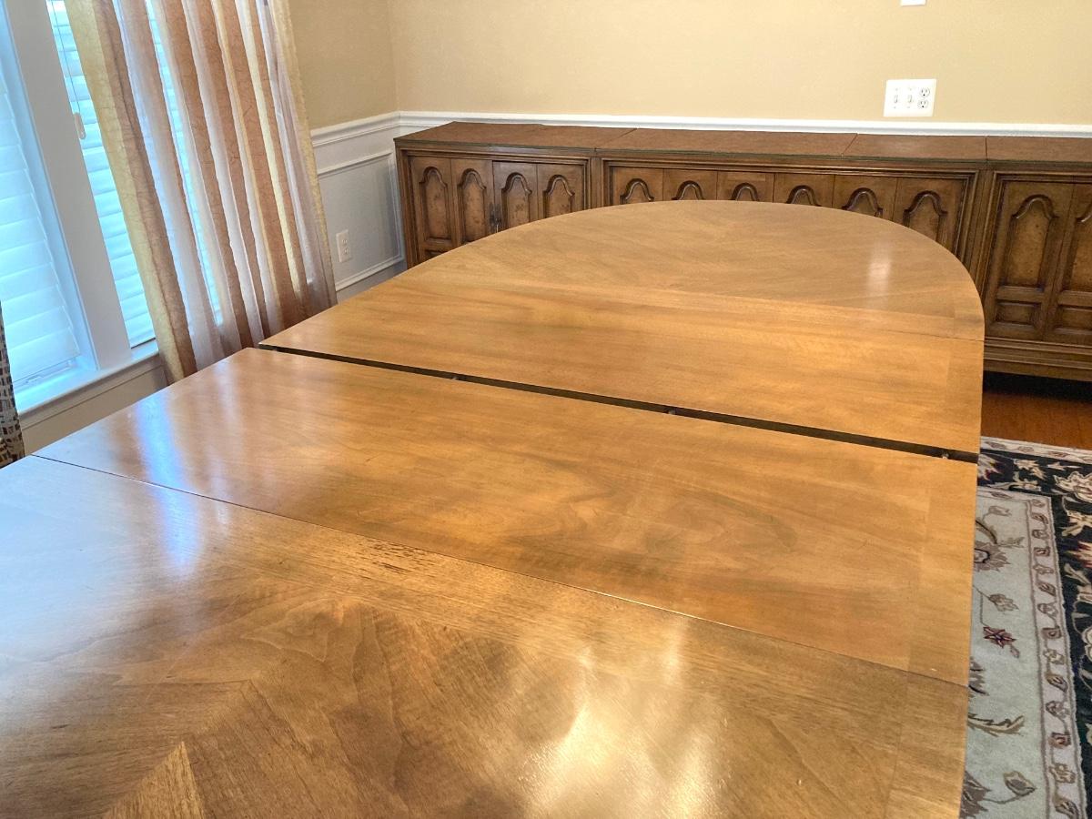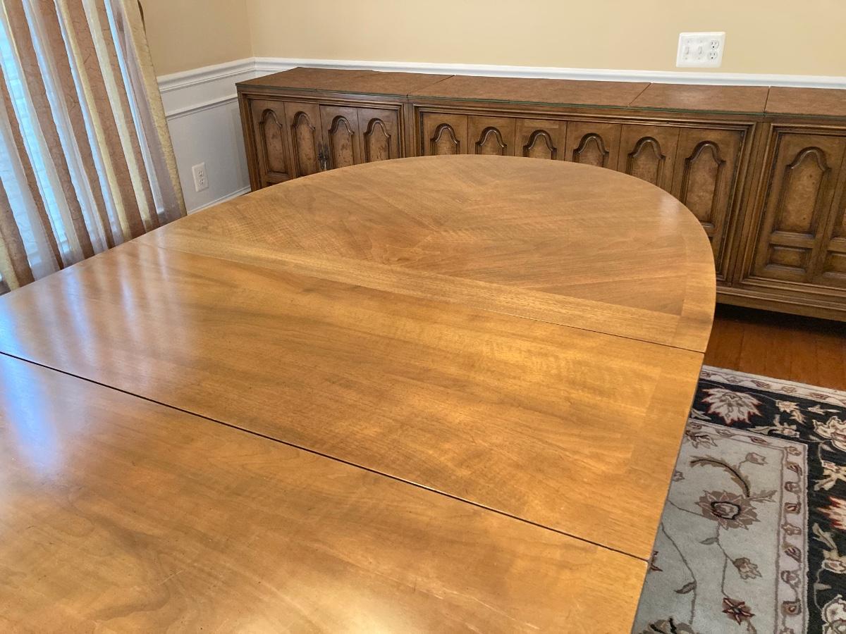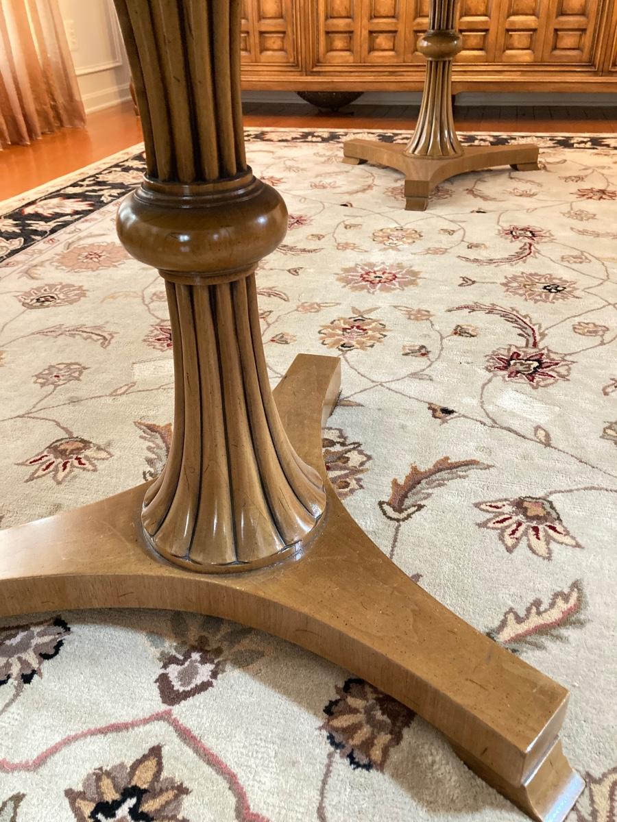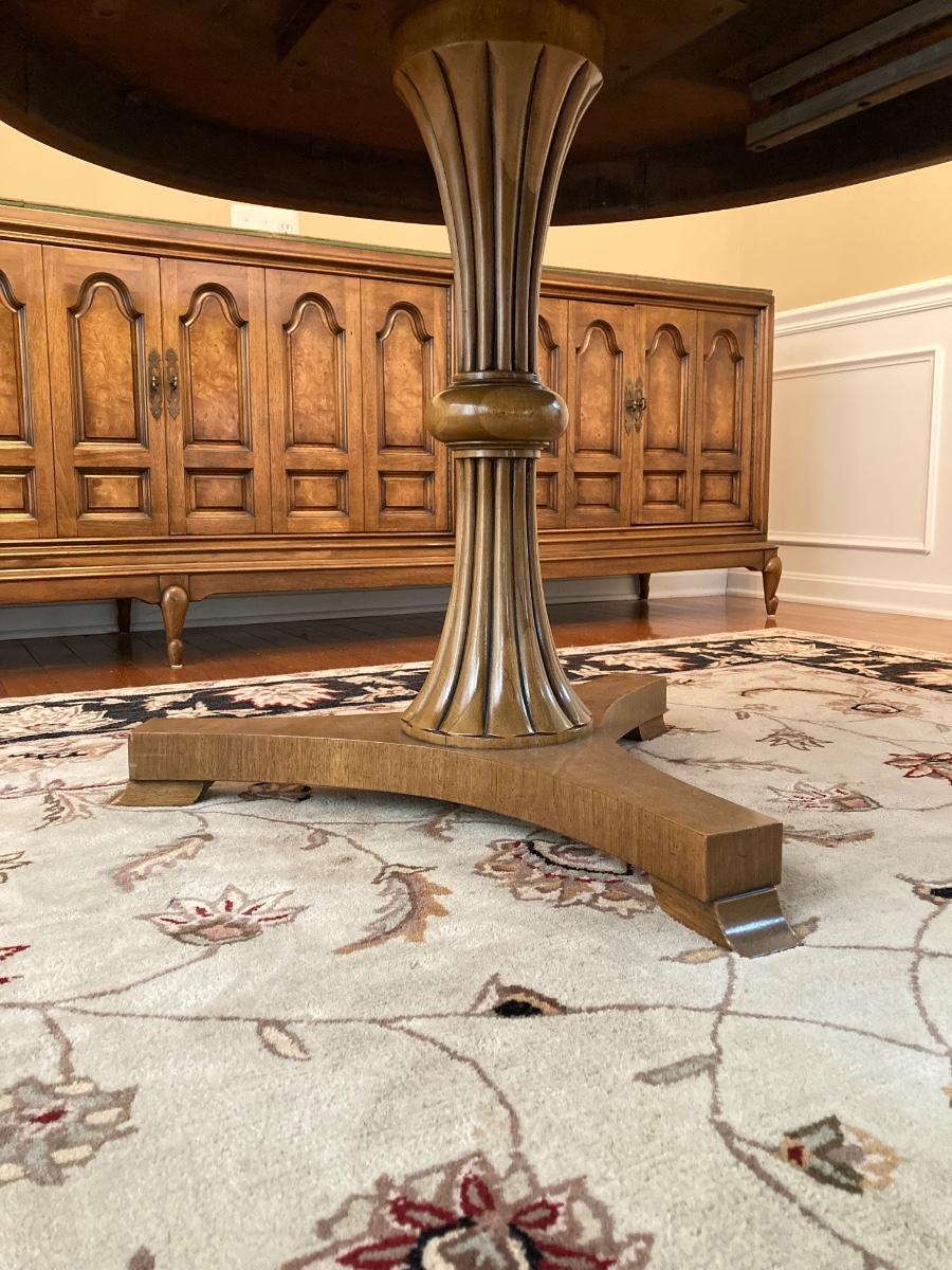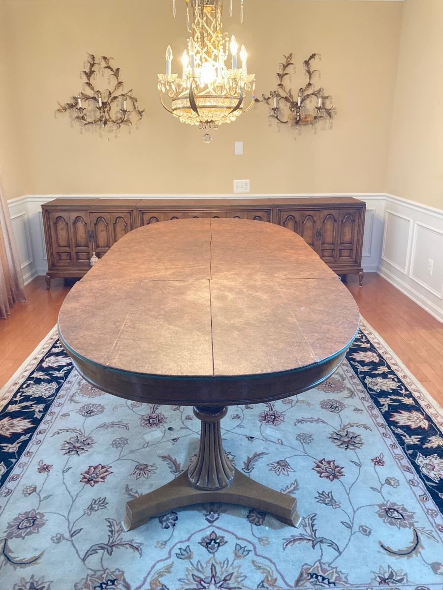 LOT 244: Vintage Double Pedestal Dining Room Table with Two Leafs, Table Pads and Six Upholstered Chairs