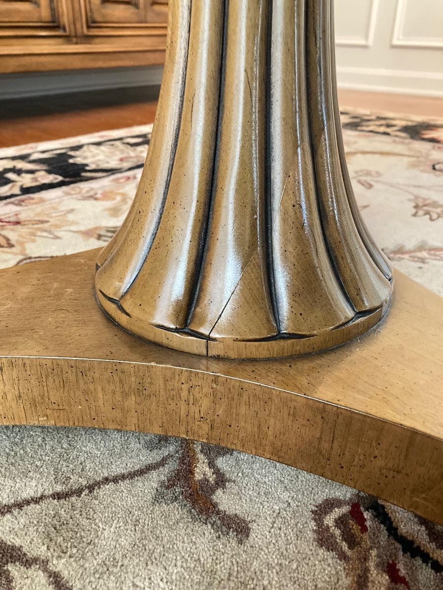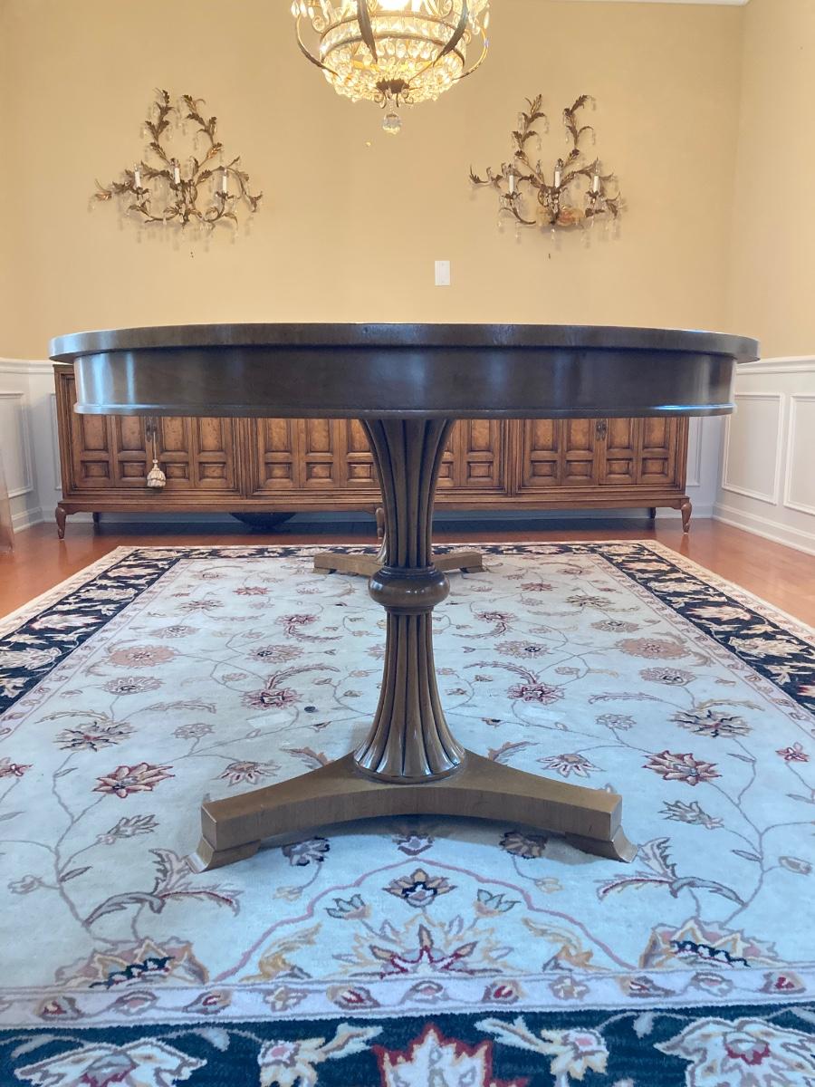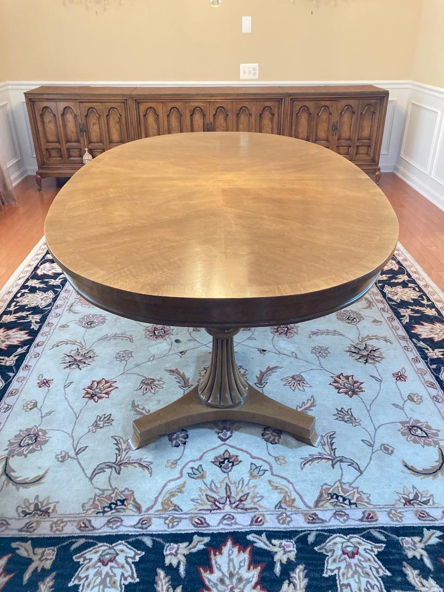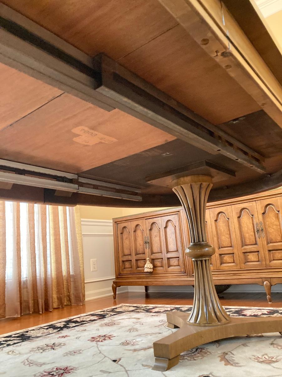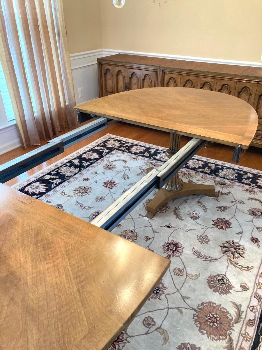 LOT 244: Vintage Double Pedestal Dining Room Table with Two Leafs, Table Pads and Six Upholstered Chairs